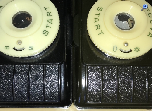 Hier wird gerade über den Projektor "Pouva Magica" an 1972 "Magica" geschrieben. Ich möchte ein paar Bilder zu diesem Gerät beisteuern. Das Design ist wohl an eine Gasmasken- Verpackung angelehnt. Man konnte KB Diastreifen und KB Dia im Rahmen verwenden. Bei Karl Pouva und ab 1972 Kamerafabrik Freital (Beier) wurdden in den Jahren 1950 bis 1981 insgesammt 1 292 397 Stück hergestellt (Quelle "Kameras um Dresden herum" von Günther Kadlubek und Wolfgang Beier). Danach wurden noch einige im Edelstahlwerk "8. Mai 1945" im Rahmen des Unterrichtsfach PA (Produktive Arbeit) montiert. An der Bauart erkennt man grob das Alter. der älteste hat noch einen abnehmbaren Metalldeckel, die anderen Beiden unterscheiden sich in der Form der Fassung. Die Deckel sind aus Bakelit und fest drauf. Zum justieren konnte man die Fassung in der Höhe verstellen.