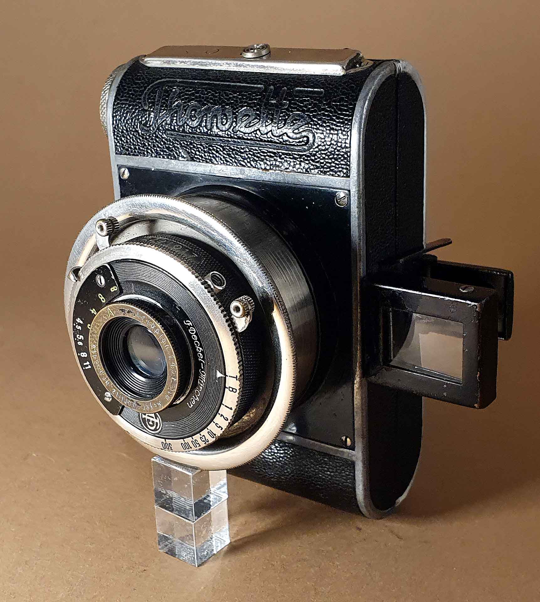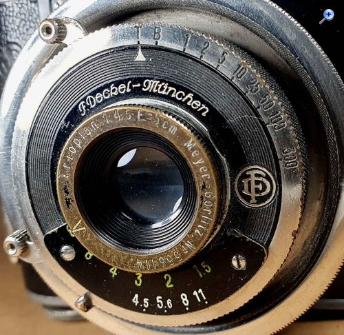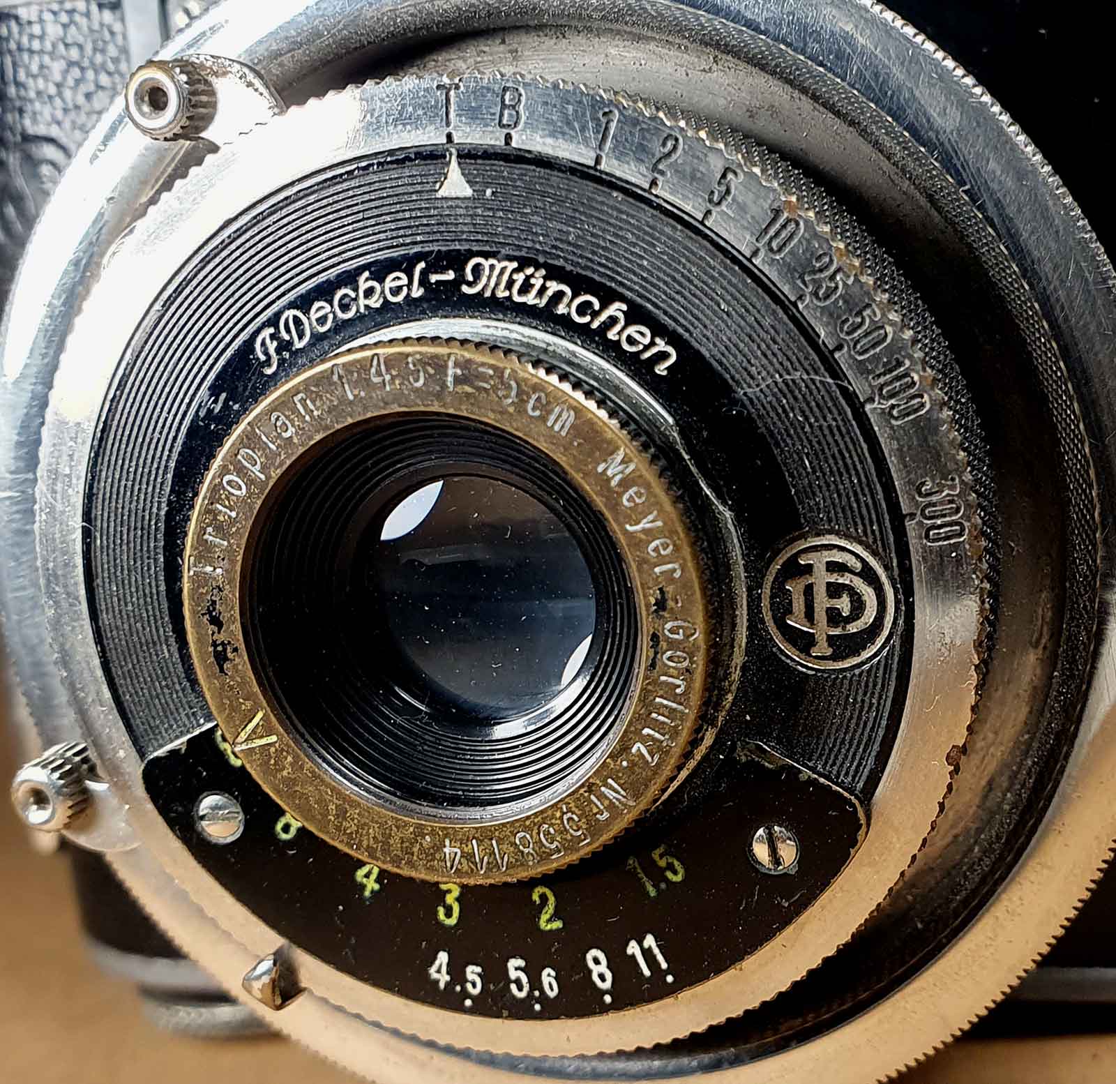 Diese Kamera besitzt nun auch die Lederprägung mit dem Modellnamen. Bestückt ist sie mit einem Meyer-Görlitz Trioplan 4.5/5 cm mit Frontlinsenfokussierung im Compur-Verschluss.