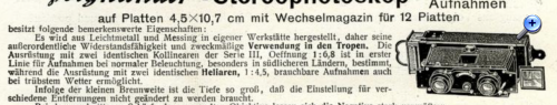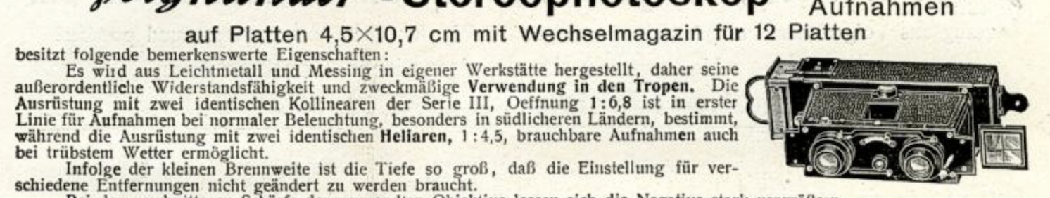 „Infolge der kleinen Brennweite ist die Tiefe so groß, daß die Einstellung für verschiedene Entfernungen nicht geändert zu werden braucht“ (Stereophotoskop, 1905)