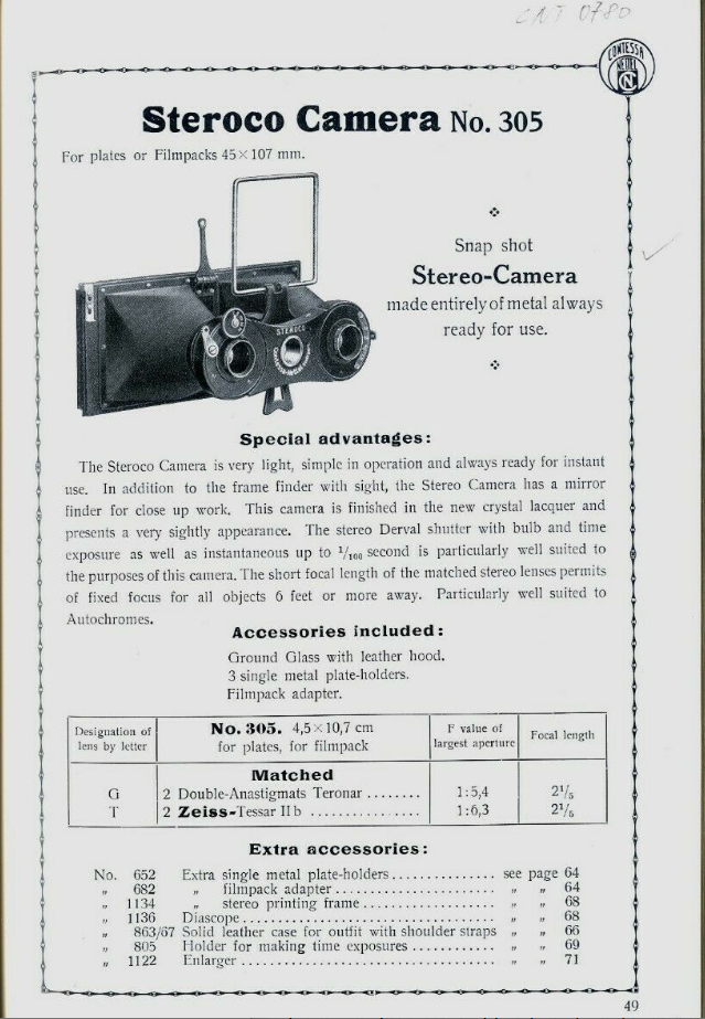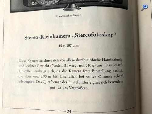 "Das Scharf=Einstellen erübrigt sich, da die Kamera feste Einstellung besitzt, die alles von 2,90 m bis Unendlich bei voller Öffnung scharf wiedergibt“ (Stereofotoskop, 1926)