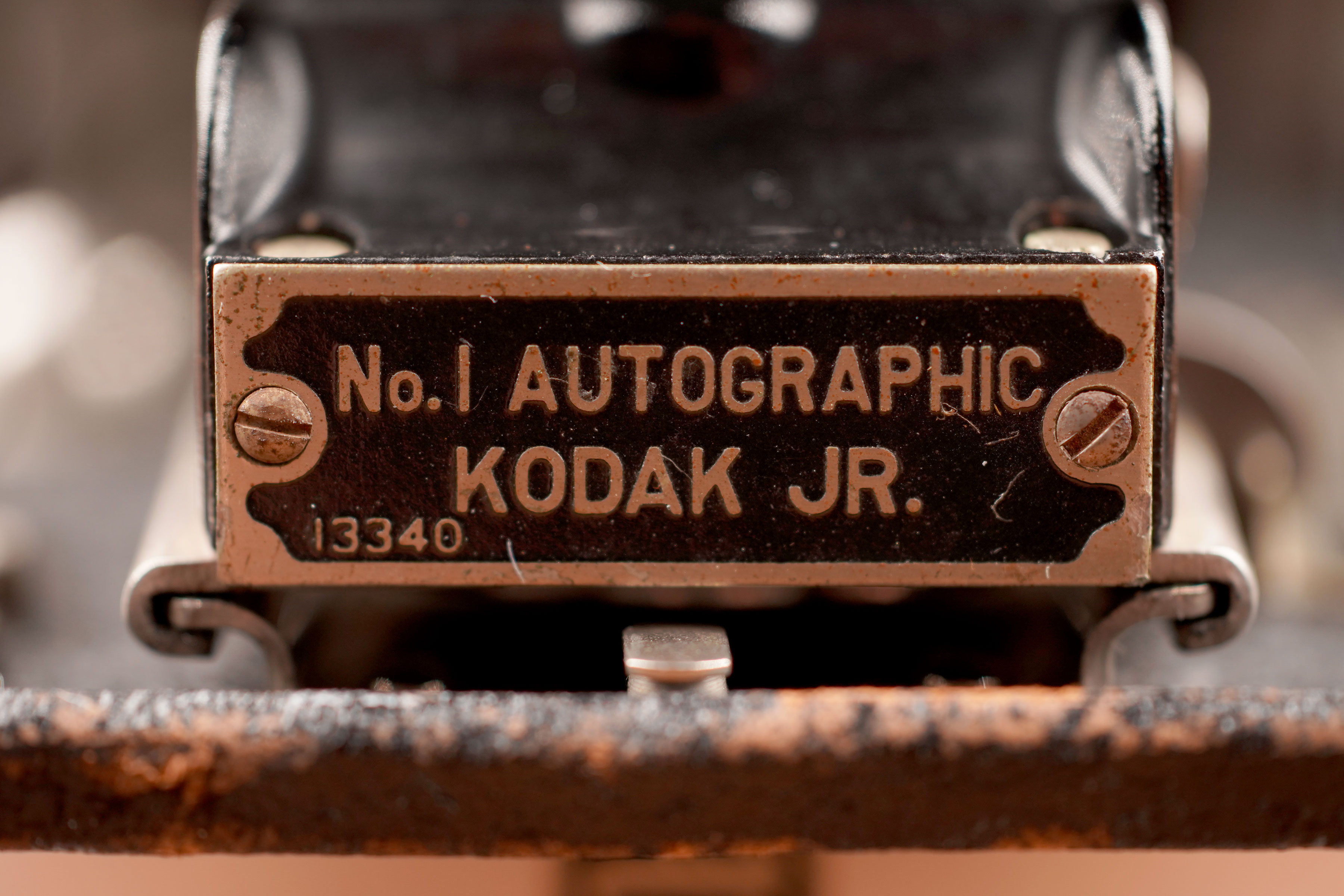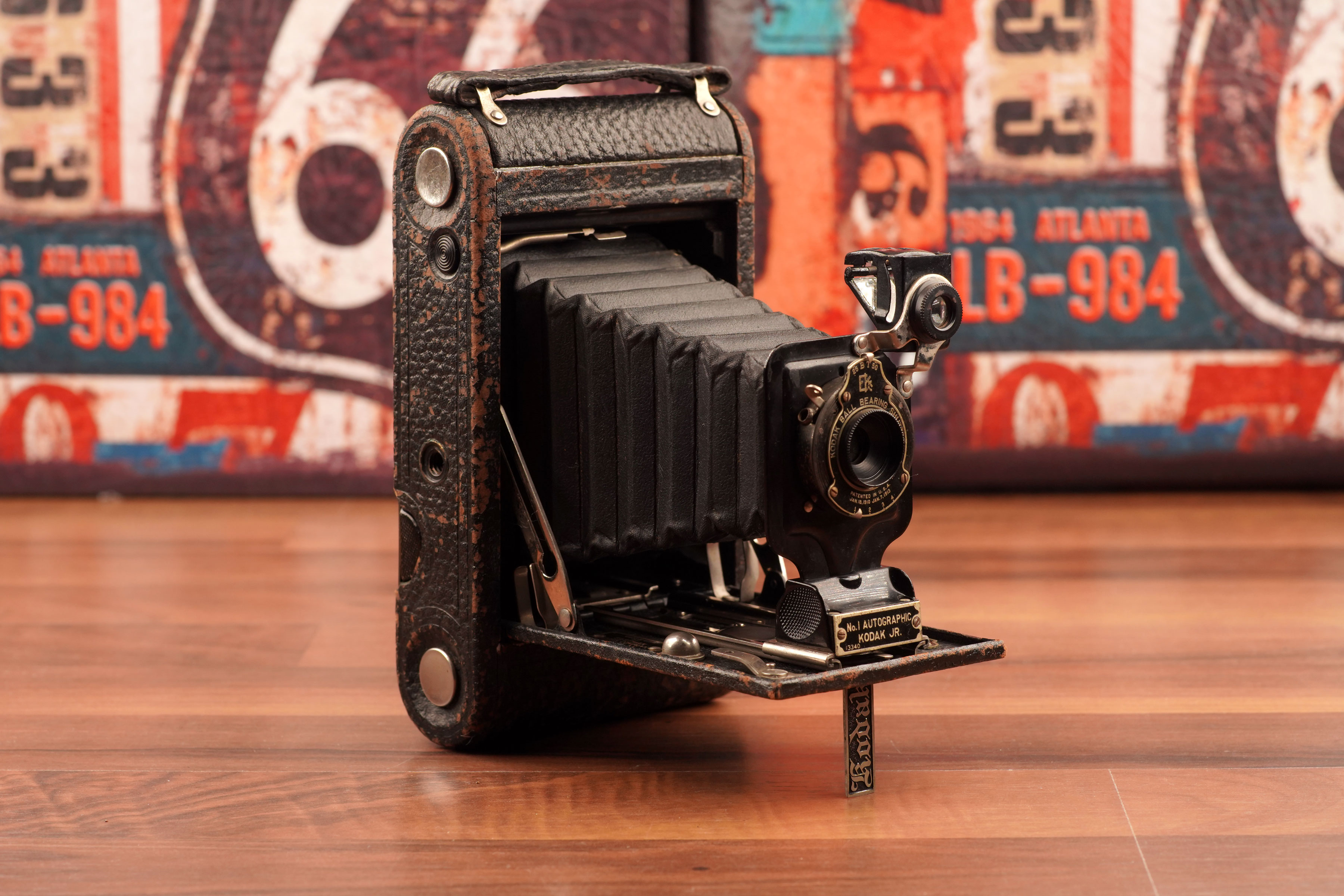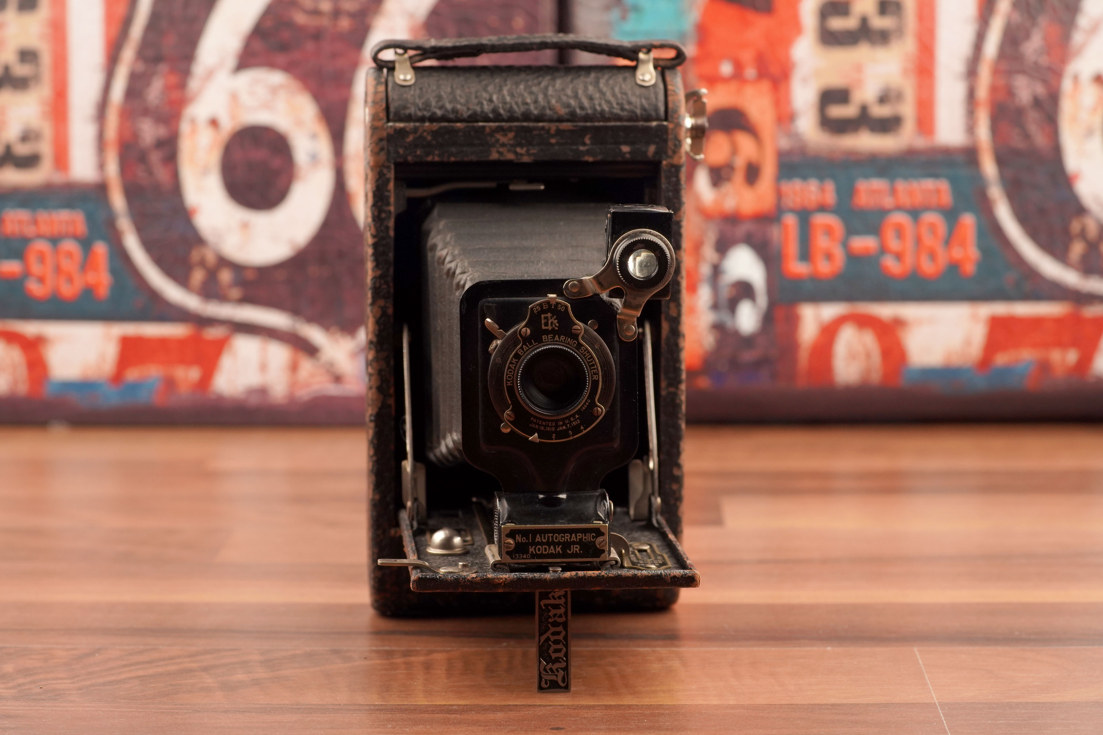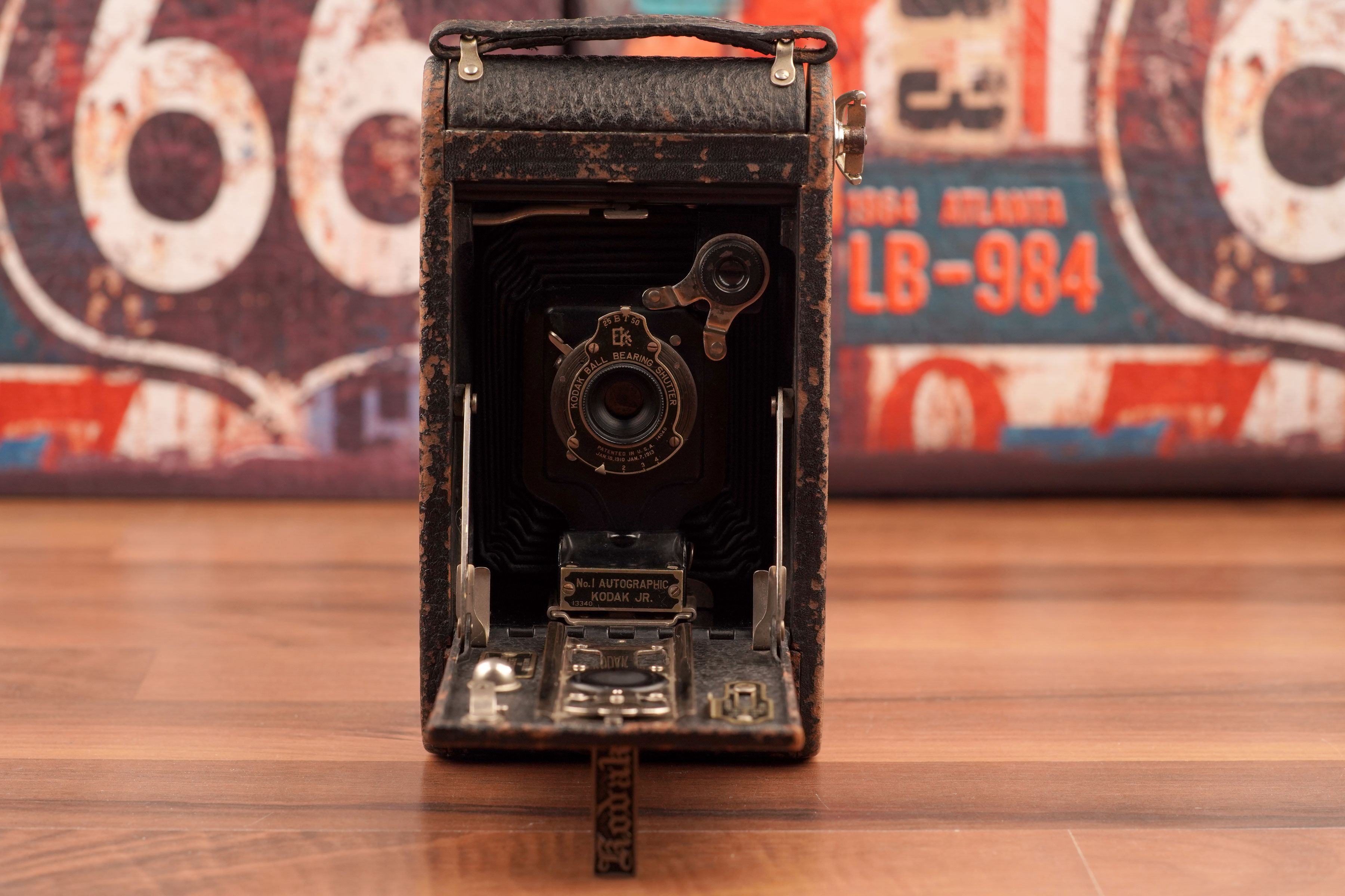 Kamera: Kodak Junior No. 1 Autographic Marke: Kodak Typ: Klappkamera Baujahr: ca. 1914 Objektiv: Busch Leukar 1:6,8/90 mm, 4 Iris-Blenden einstellbar Verschluss: Einfacher Kodex-Verschluss 1/25, 1/50 Sek B,T, Filmformat: Autographic Rollfilm 120 6x9 cm Besonderheit: Schwenkbarer Brillant-Sucher für Hoch- und Querformat, Rückwand-Schlitz zum Filmbeschriften, 2 Abstellfüße für Hoch- und Querformat Aufnahmen, Lederüberzogenes Holzgehäuse, Rückwand aus Aluminium komplett abnehmbar.