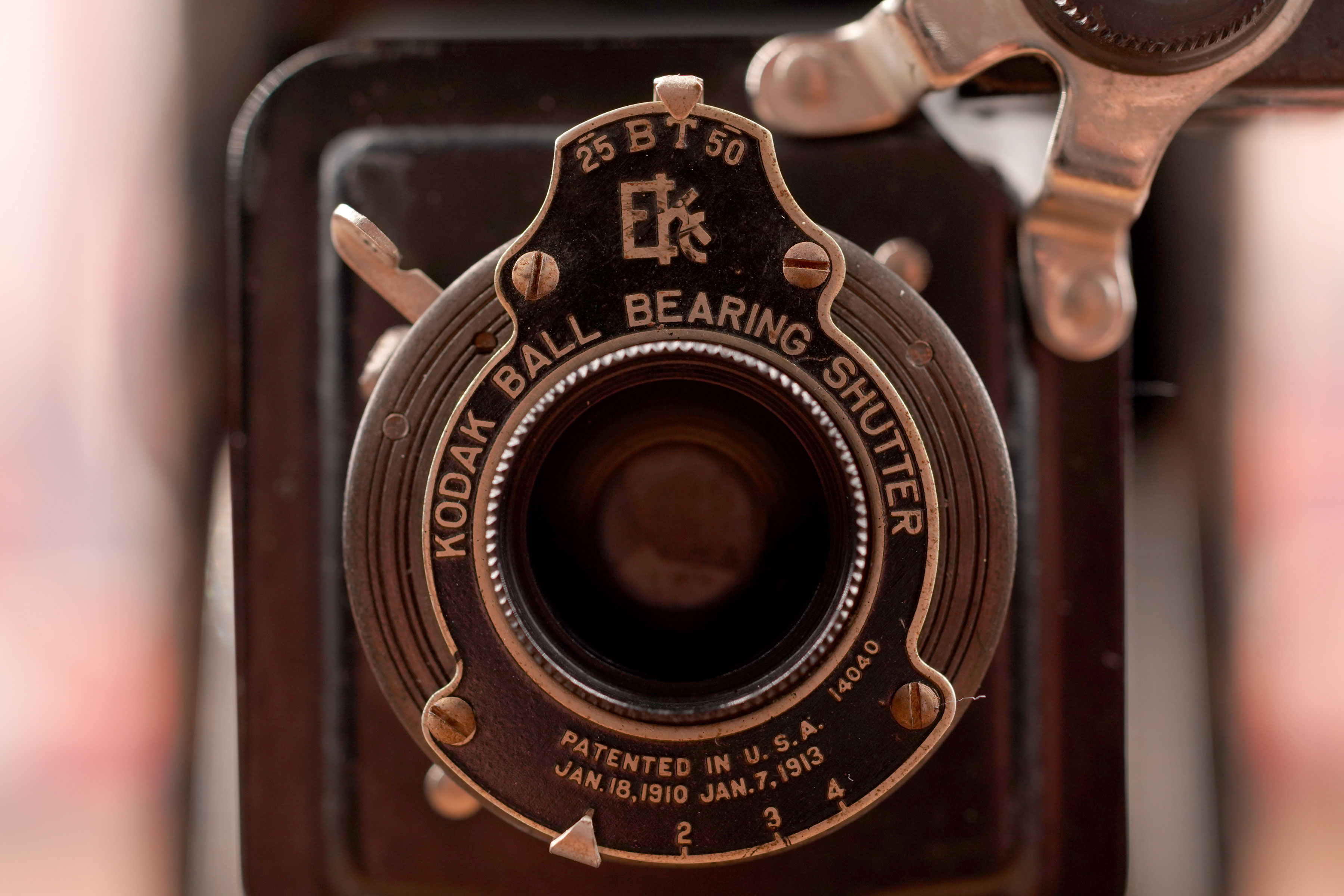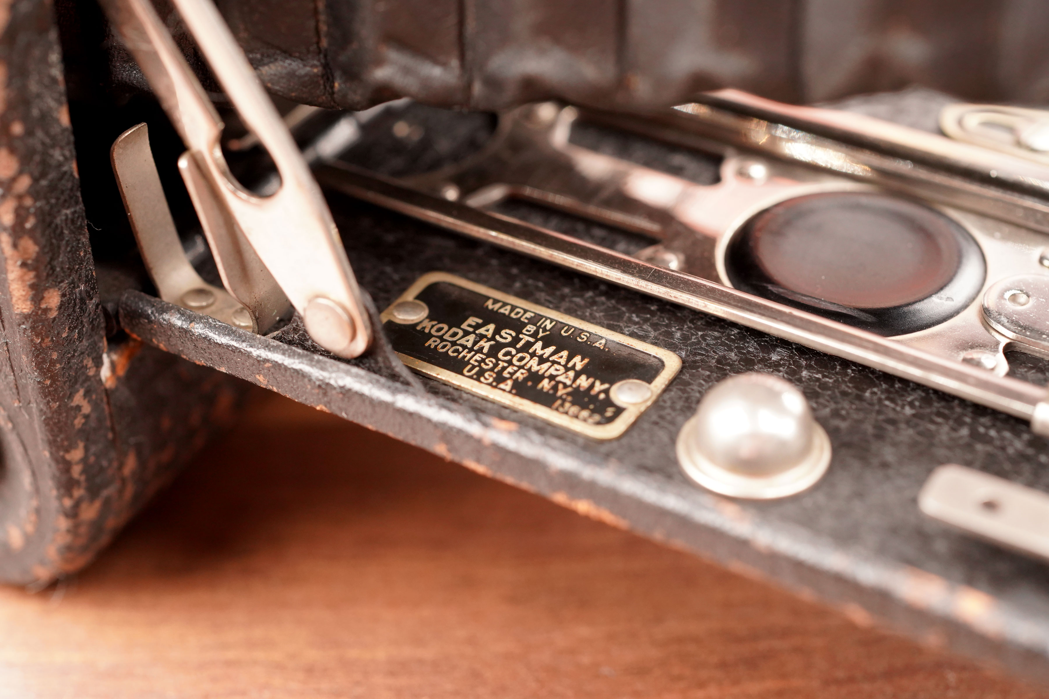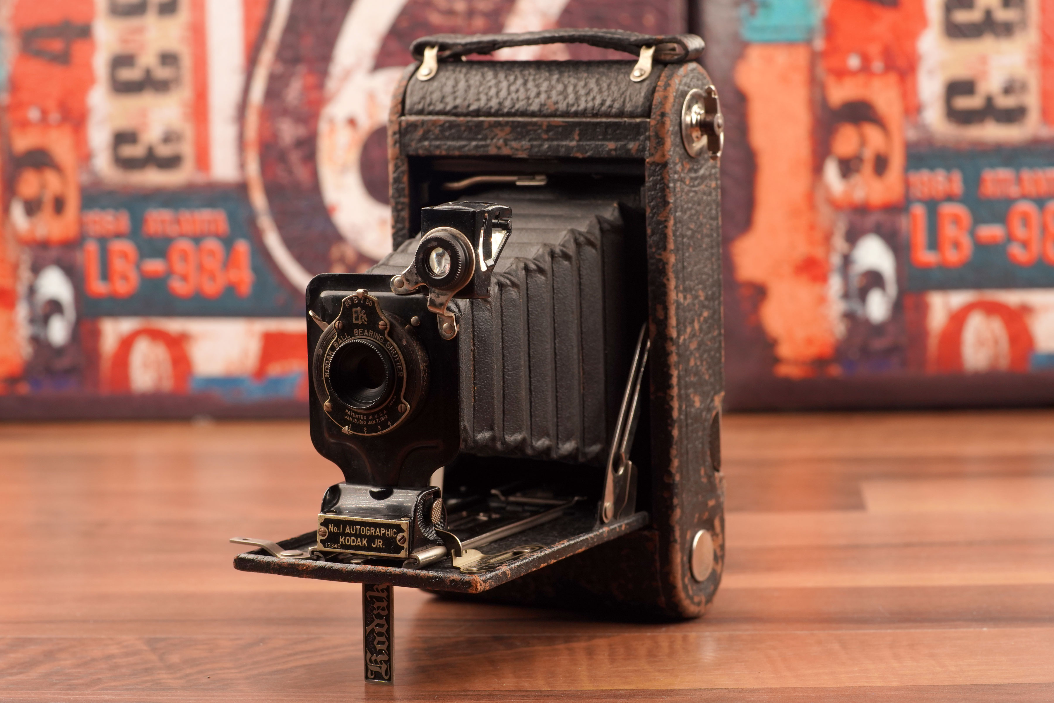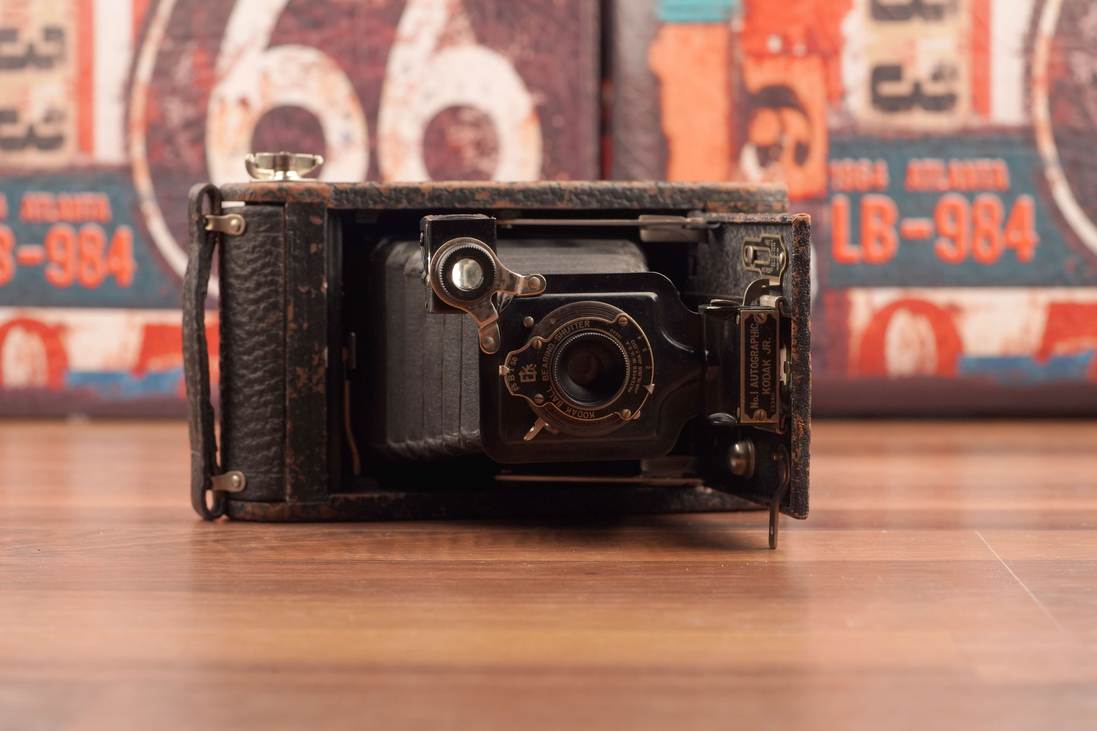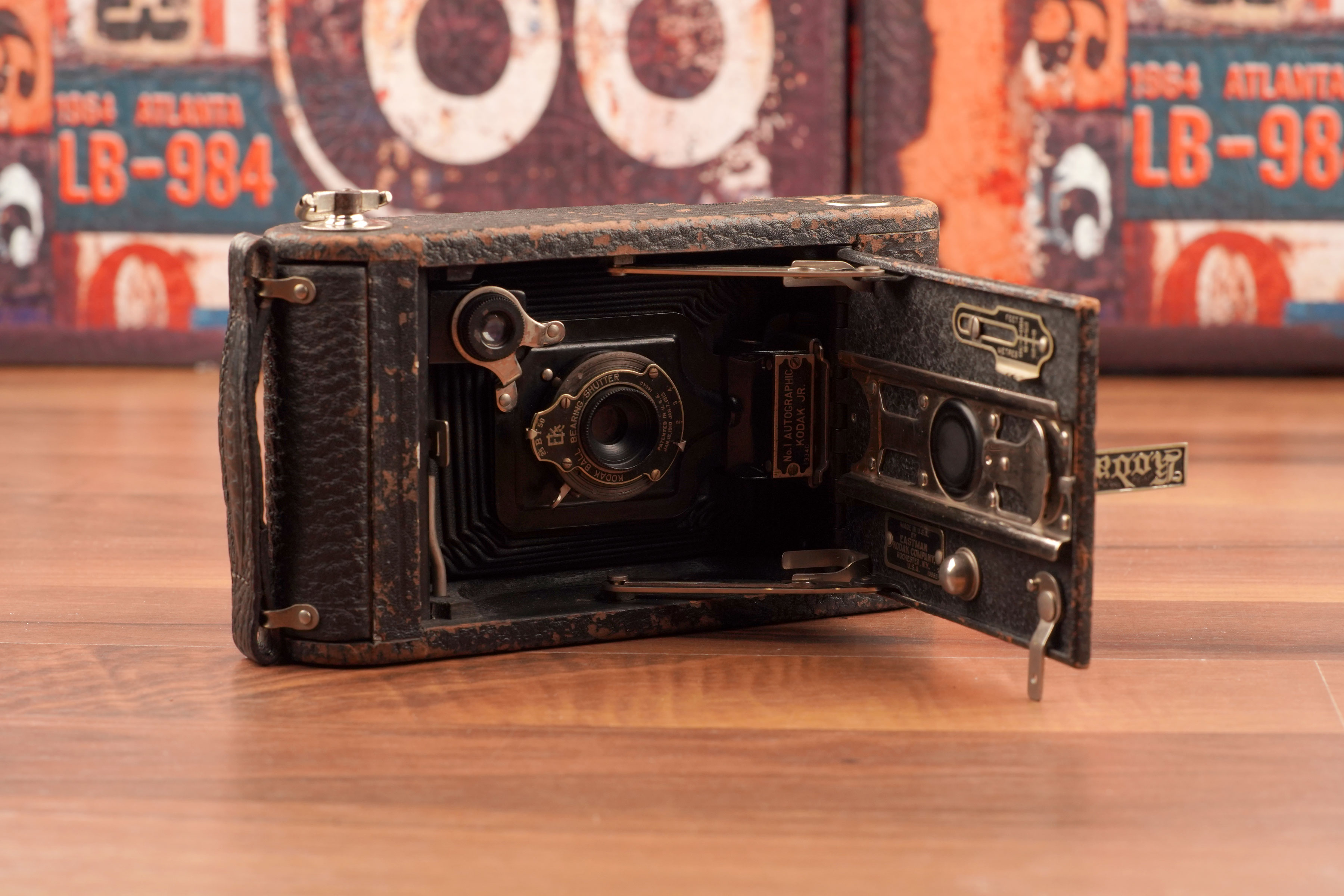 Kamera: Kodak Junior No. 1 Autographic Marke: Kodak Typ: Klappkamera Baujahr: ca. 1914 Objektiv: Busch Leukar 1:6,8/90 mm, 4 Iris-Blenden einstellbar Verschluss: Einfacher Kodex-Verschluss 1/25, 1/50 Sek B,T, Filmformat: Autographic Rollfilm 120 6x9 cm Besonderheit: Schwenkbarer Brillant-Sucher für Hoch- und Querformat, Rückwand-Schlitz zum Filmbeschriften, 2 Abstellfüße für Hoch- und Querformat Aufnahmen, Lederüberzogenes Holzgehäuse, Rückwand aus Aluminium komplett abnehmbar.