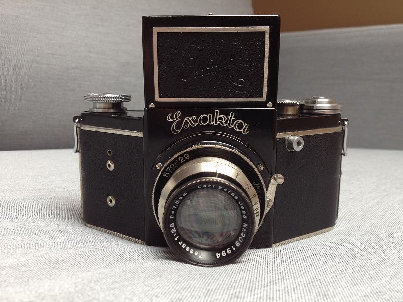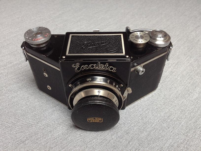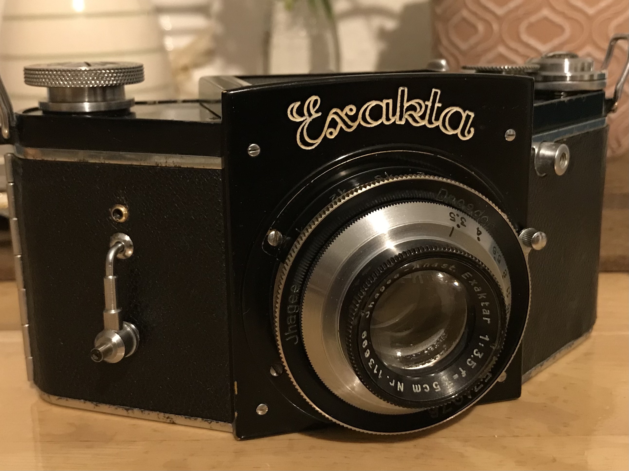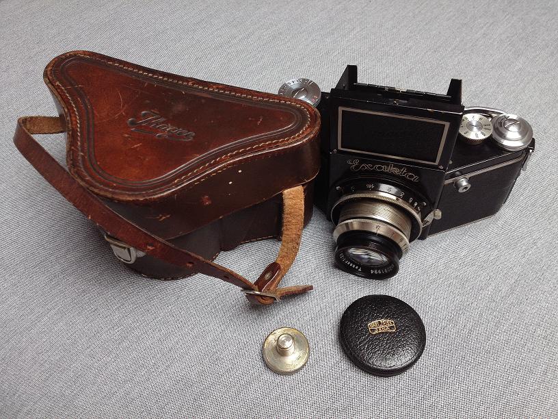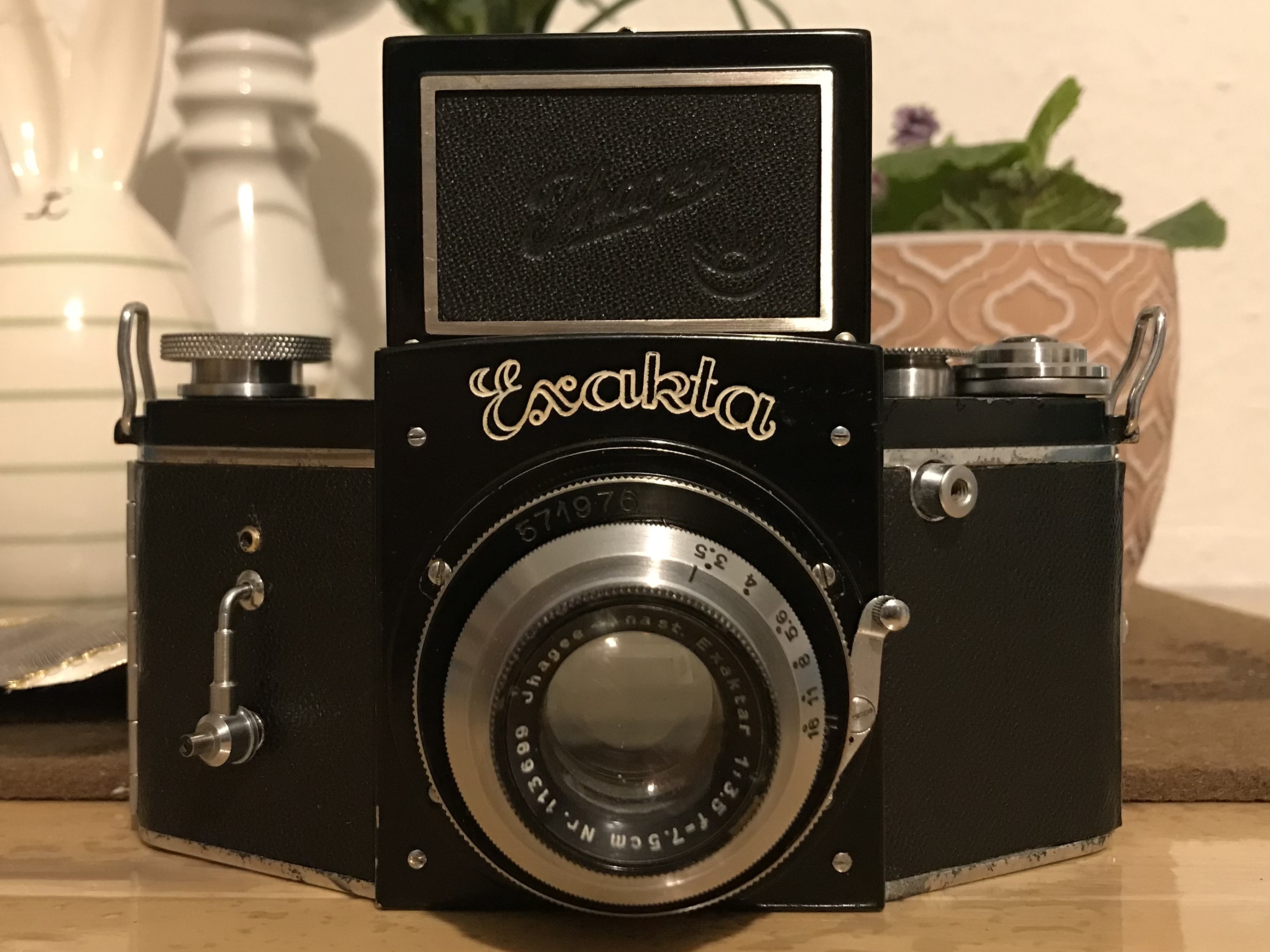 Hergestellt wurde dieses Modell zwischen 1938 und 1939. Es war das letzte Modell der Baureihe und besitzt einen Anschluss für die Vacublitzeinrichtung. Der Kunde konnte zwischen unterschiedlichen Objektiven wählen, man konnte auch eine Objektivkombination nachträglich ändern was allerdings im Werk in Dresden geschah um die Objektive perfekt auf die jeweilige Kamera anzupassen. Mein Exemplar besitzt ein Zeiss Tessar 2,8/ 7,5 cm. Die Kamera wurde auch mit Weitwinkel- und Teleobjektiven ausgerüstet, des Weiteren waren auch die so genannten Nacht-Exaktas erhältlich mit lichtstarken Optiken mit Blende 1,9 bzw. 2,0. Ich habe noch den original Objektivdeckel und die originale Ledertasche dazubekommen. Die Rückwand hat schon bessere zeiten erlebt aber alles in allem eine sehr schöne Kamera.