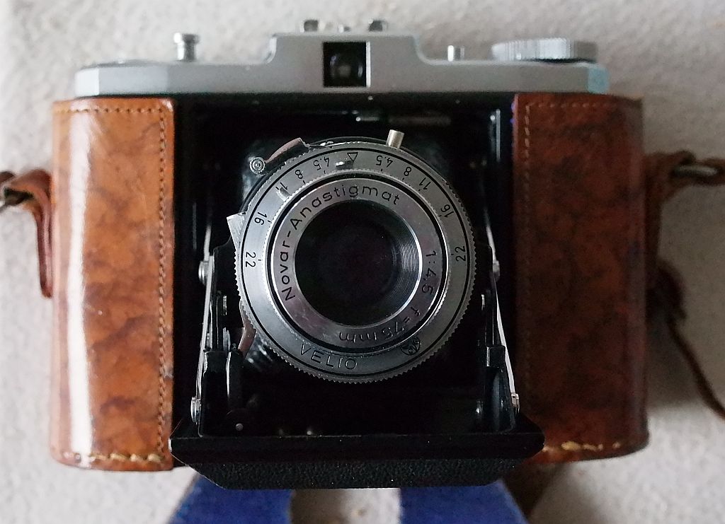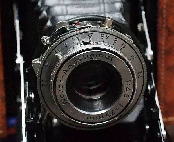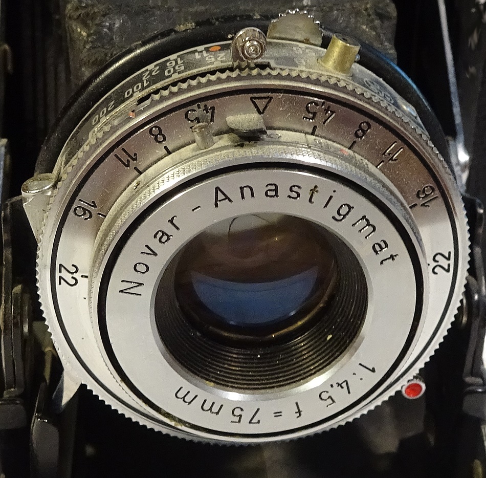 Objektiv: Novar-Anastigmat (Dreilinser), 1:4,5. 75 mm. 1,2 (1,0) Meter - unendlich