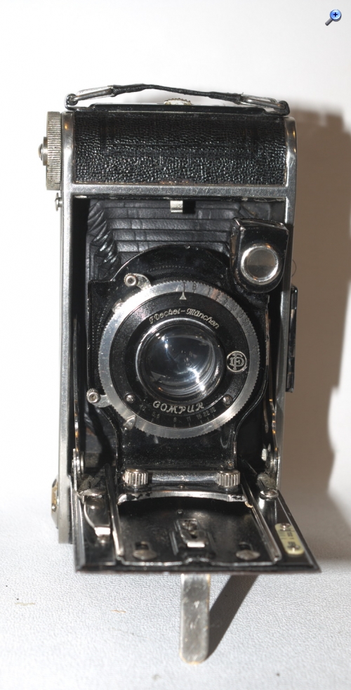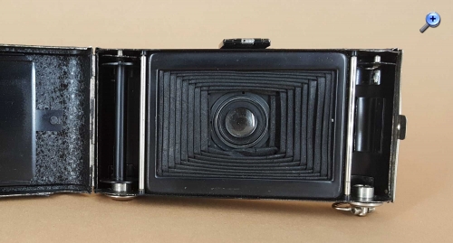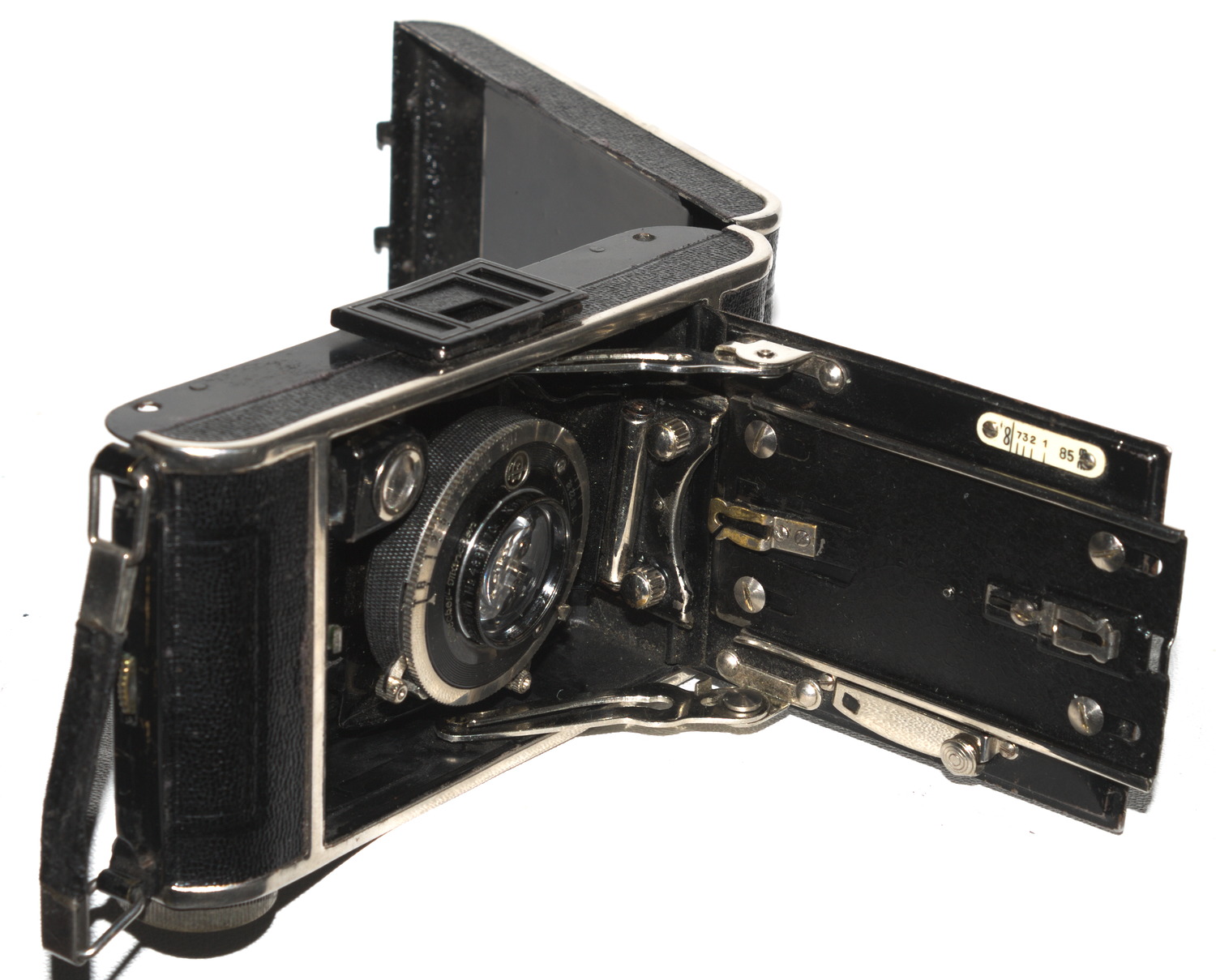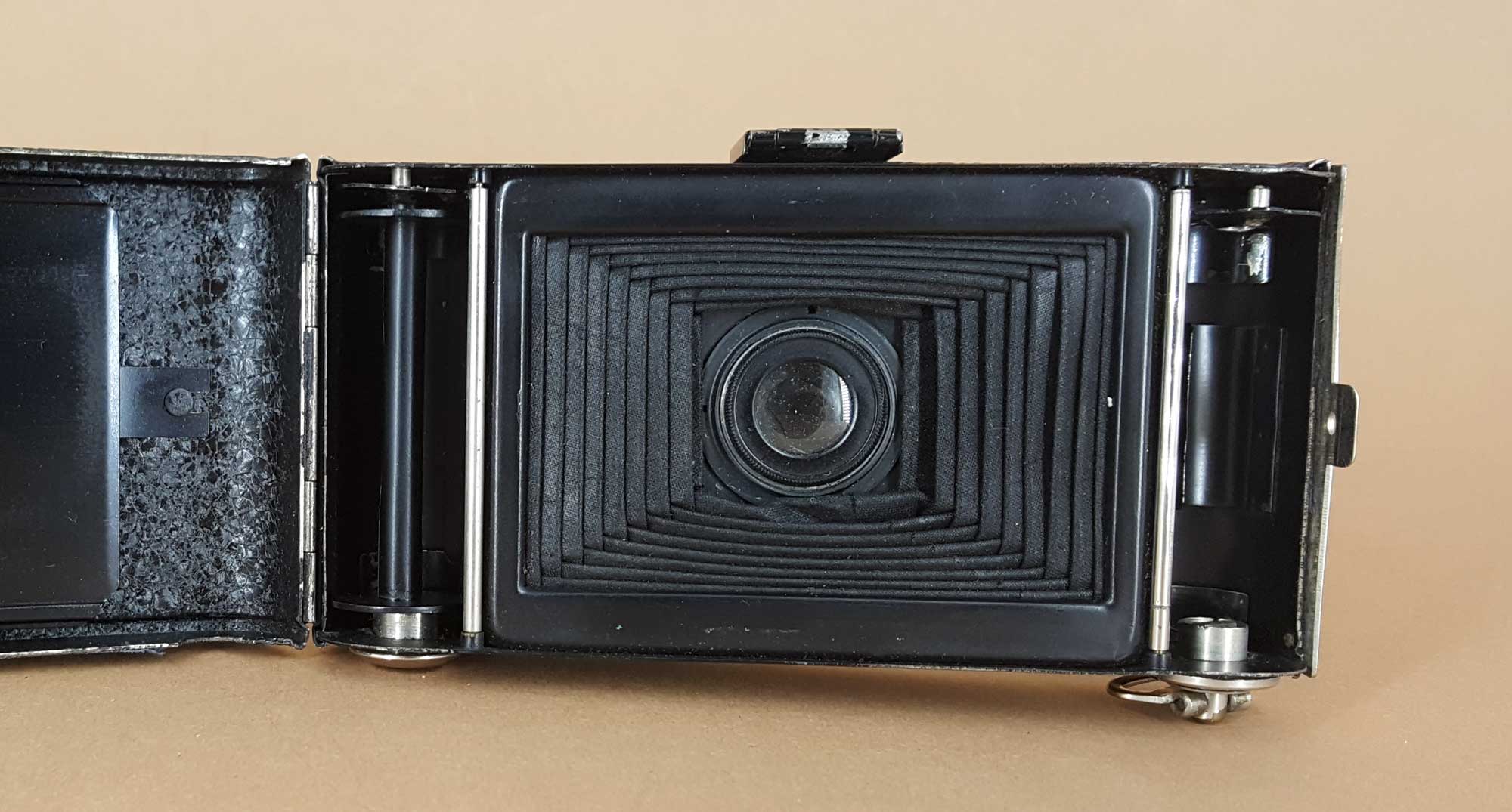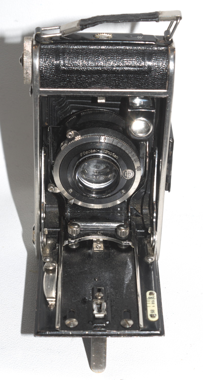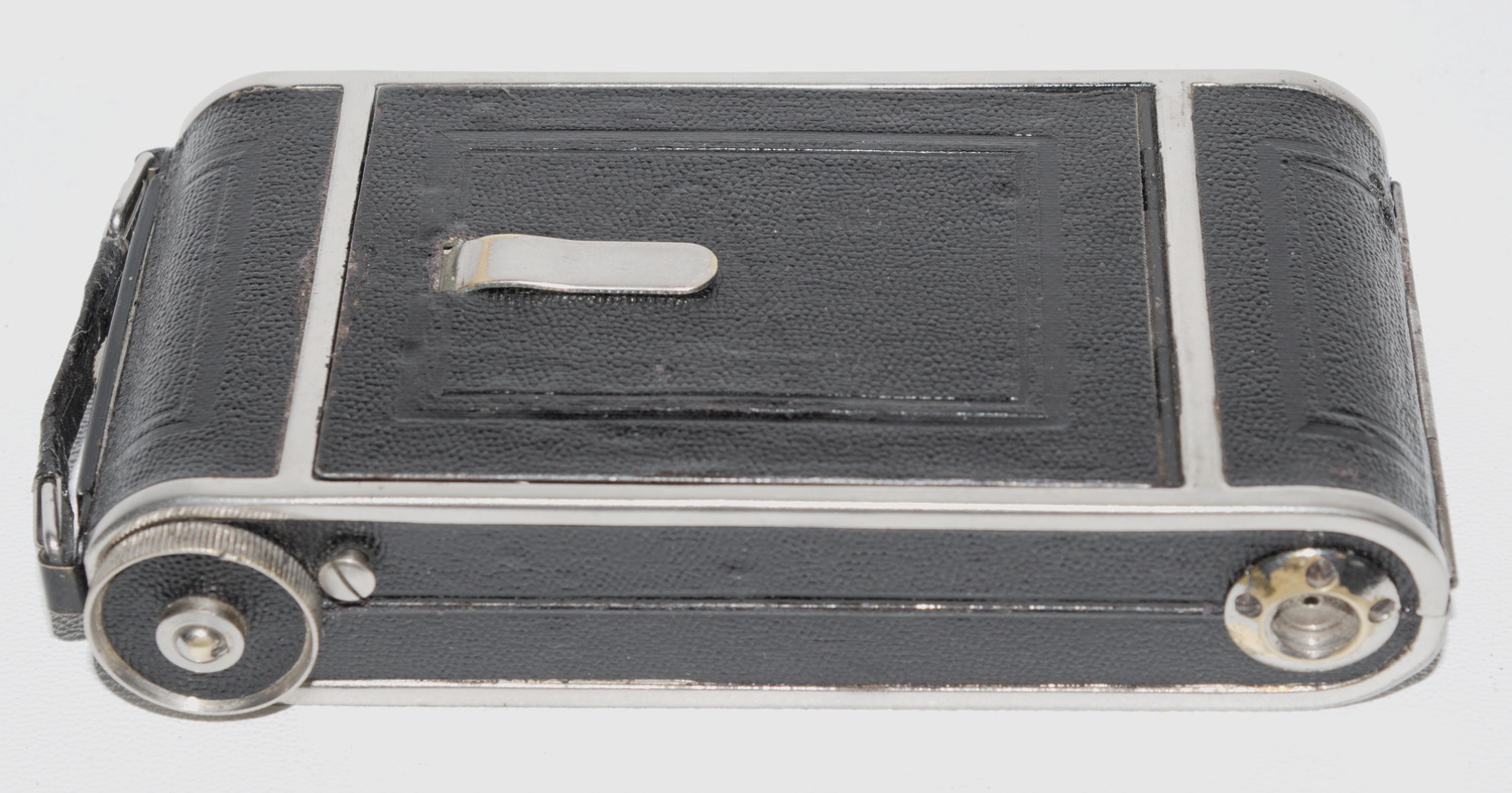 die folgende schöne anonyme Laufboden-Rollfilmkamera für 127er-Film kann ich nicht einordnen. Wenn sie von einem deutschen Hersteller kommen sollte, käme kaum jemand außer Balda in Frage, meine ich. Obwohl ...