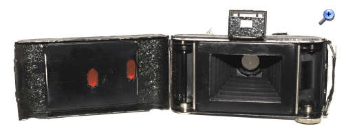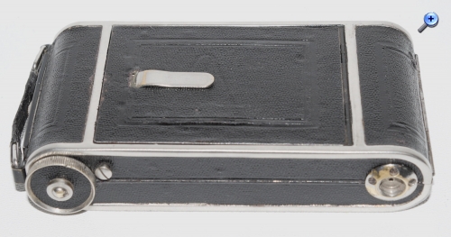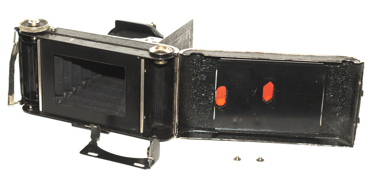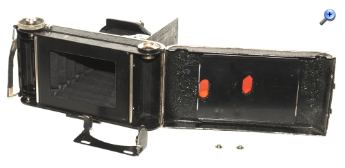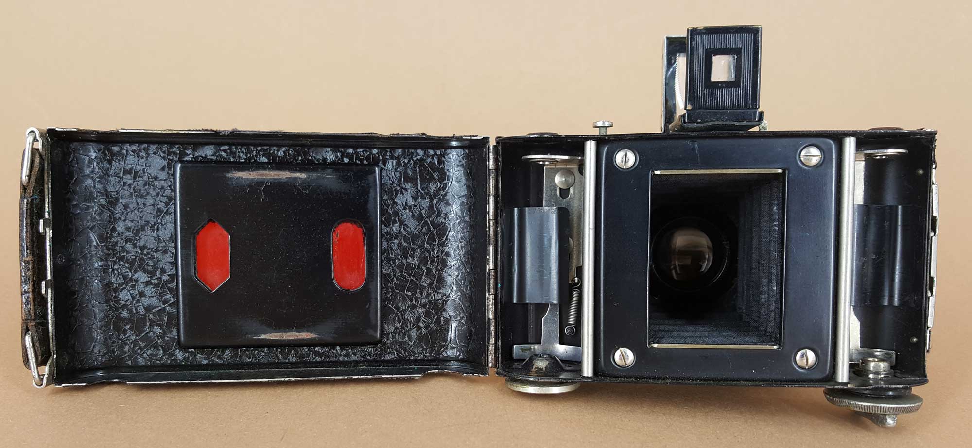 Laufboden:Nach dem Sucher handelt es sich um eine Zweiformatkamera, wie fast immer fehlen die Abdeckungen. Ungewöhnlich ist auch die Gestaltung zweier Rotlichtfenster - eines sechseckig, eines beidseitig abgerundet. Das sechseckige ist in Bildmitte, das andere neben dem Bildausschnitt.