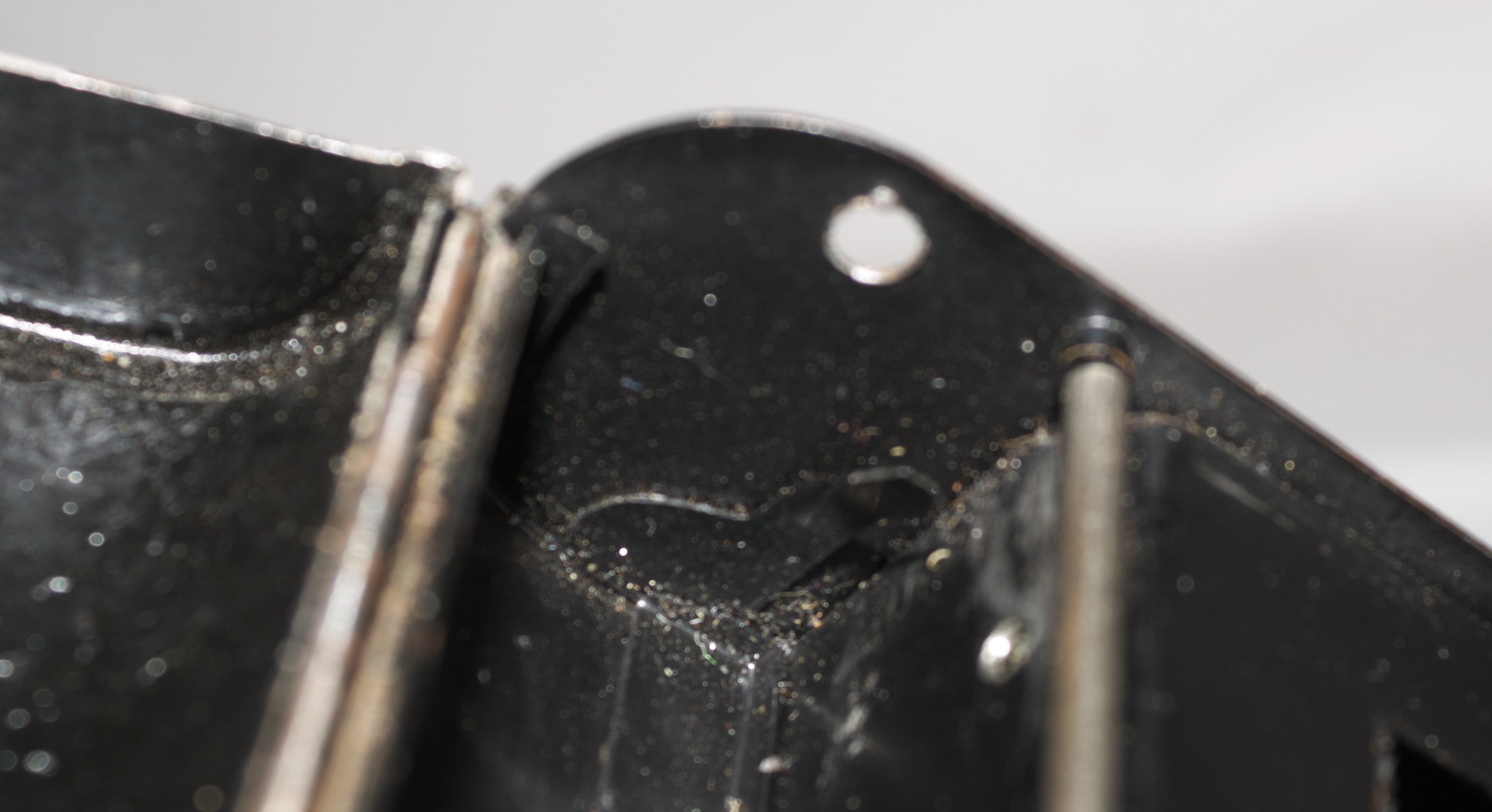 Einen Hinweis, dass diese Änderungen werksseitig erfolgt seien könnten, sehe ich darin, dass die Lackierung des Zweiformat-Suchers wohl die gleiche ist wie die Lackierung der Innenrückwand der Kamera. Außerdem sieht man keine Verschraubungen bei der Formatmaske, wie man es bei der Rollette erkennen kann. Nicht zu vergessen die zwei Filmsichtfenster, die für 3x4 Format sein könnten.