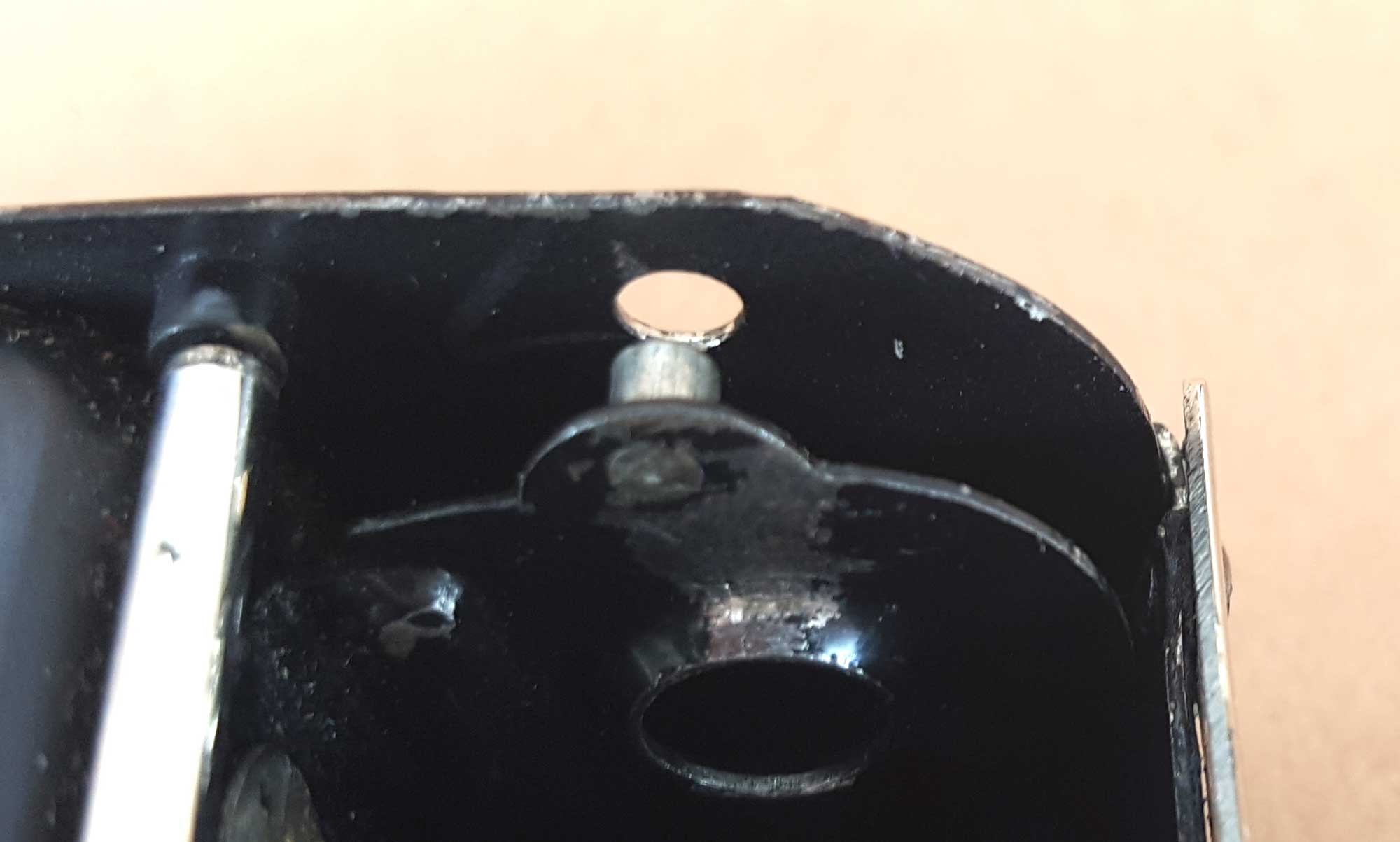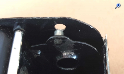 Klar. Was mir aufgefallen ist, ist die unterschiedliche Form dieser Fenster. Der Zweck dieser an sich ja nicht sehr formschönen Gestaltung dürfte gewesen zu sein, die Bedienung einfacher erklären zu können und damit Fehlbedienung zu vermeiden. Ein anderes Detail der Filmführung, das ich so noch nicht gesehen hatte, ist mir beim nochmaligen Anschauen der Filmbühne aufgefallen: auf beiden Seiten sind seitlich bewegliche Blechhalterungen eingeschraubt, sie werden durch eine fest installierte Blechfeder in Position gebracht. Seitlich sind Löcher im Blech, in die beim Herausnehmen des Films ein Nippel eingreift, wohl damit der Film nicht unkontrolliert herausfällt: