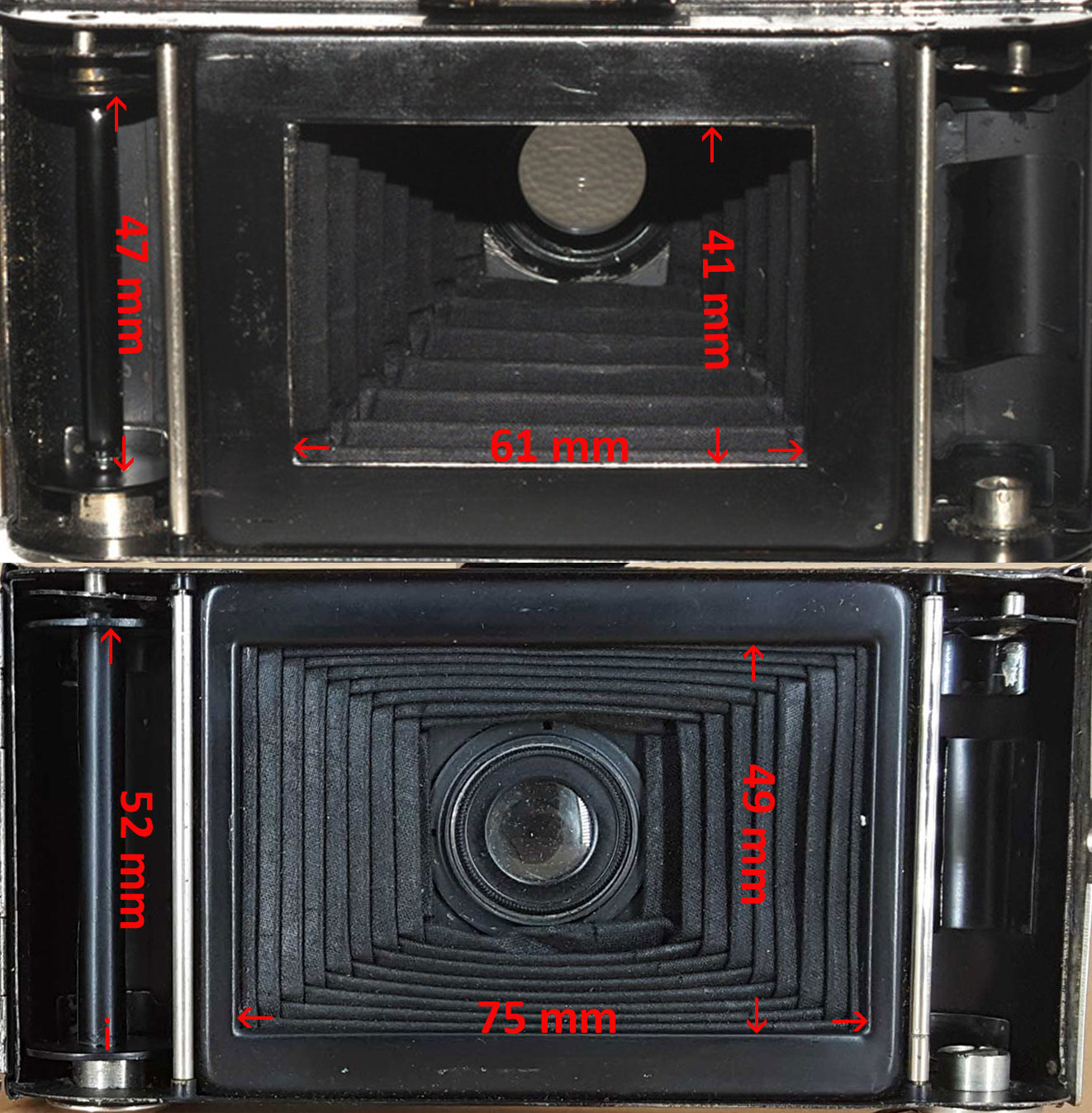 Der volle Bildausschnitt ist 41x61mm. Sonstige Kameras mit demselben Filmformat haben 40x60 (Goldi), 42x63(Goerz), 40x30(Vollenda).