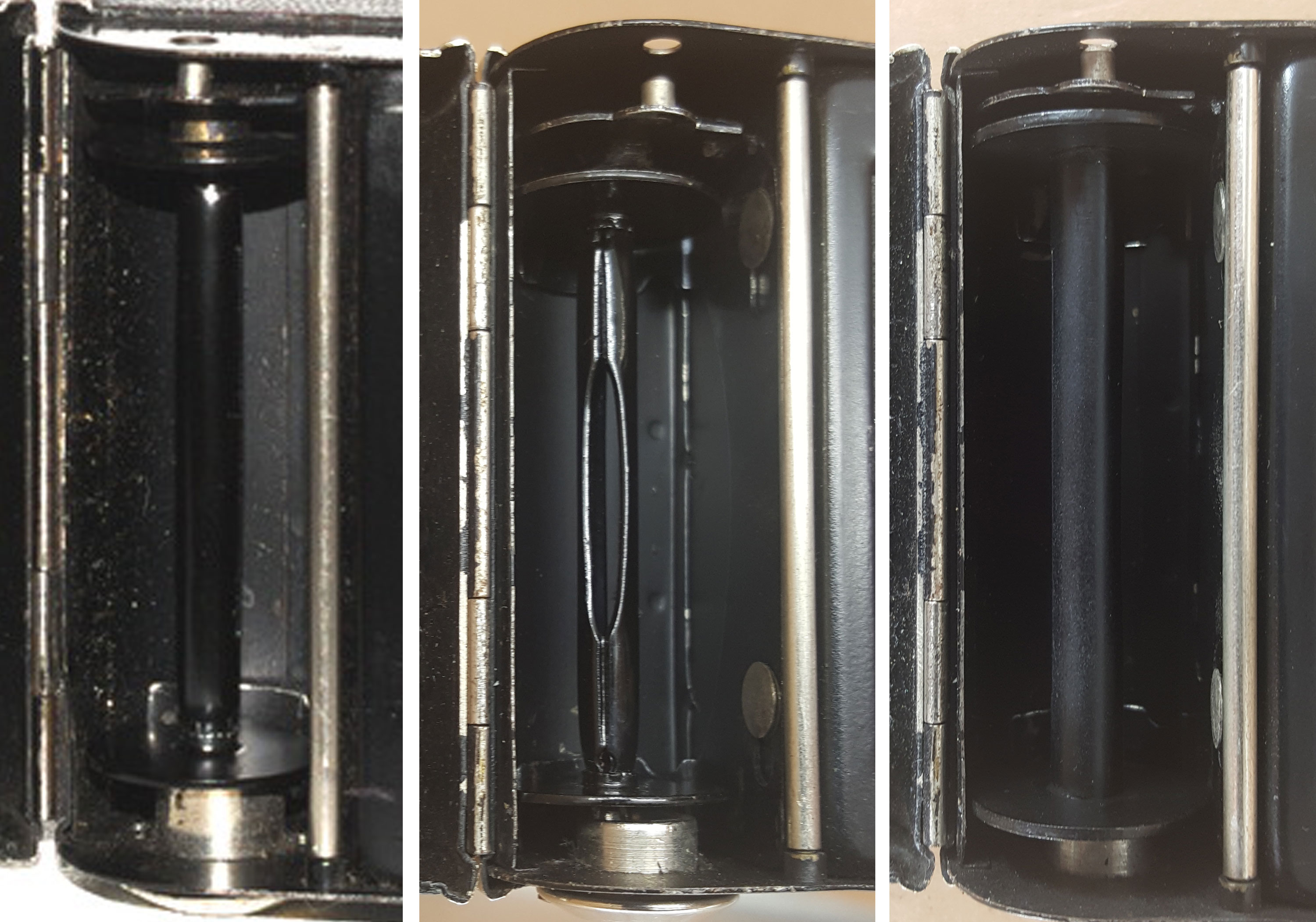 Man musste jedoch nicht nur die Formatmaske anpassen, sondern auch den Spulenhalter. Ich habe versuchsweise mal eine 127er Spule bei meiner Kamera eingelegt und das funktioniert nicht. Die Spule ist zu kurz für die Halterung. Bei der Kamera von Laufboden wurde das angepasst, wie man auch an der folgenden Gegenüberstellung erkennt: