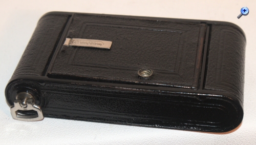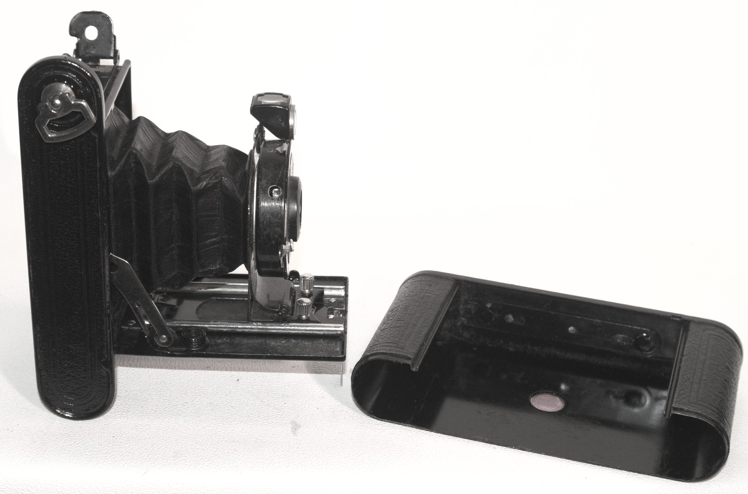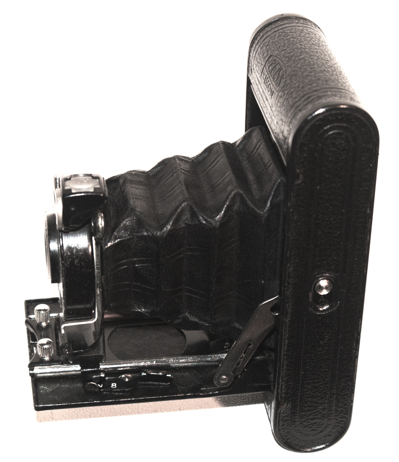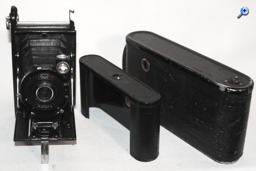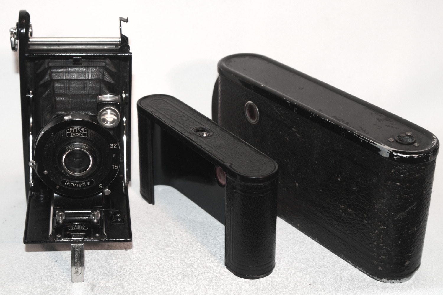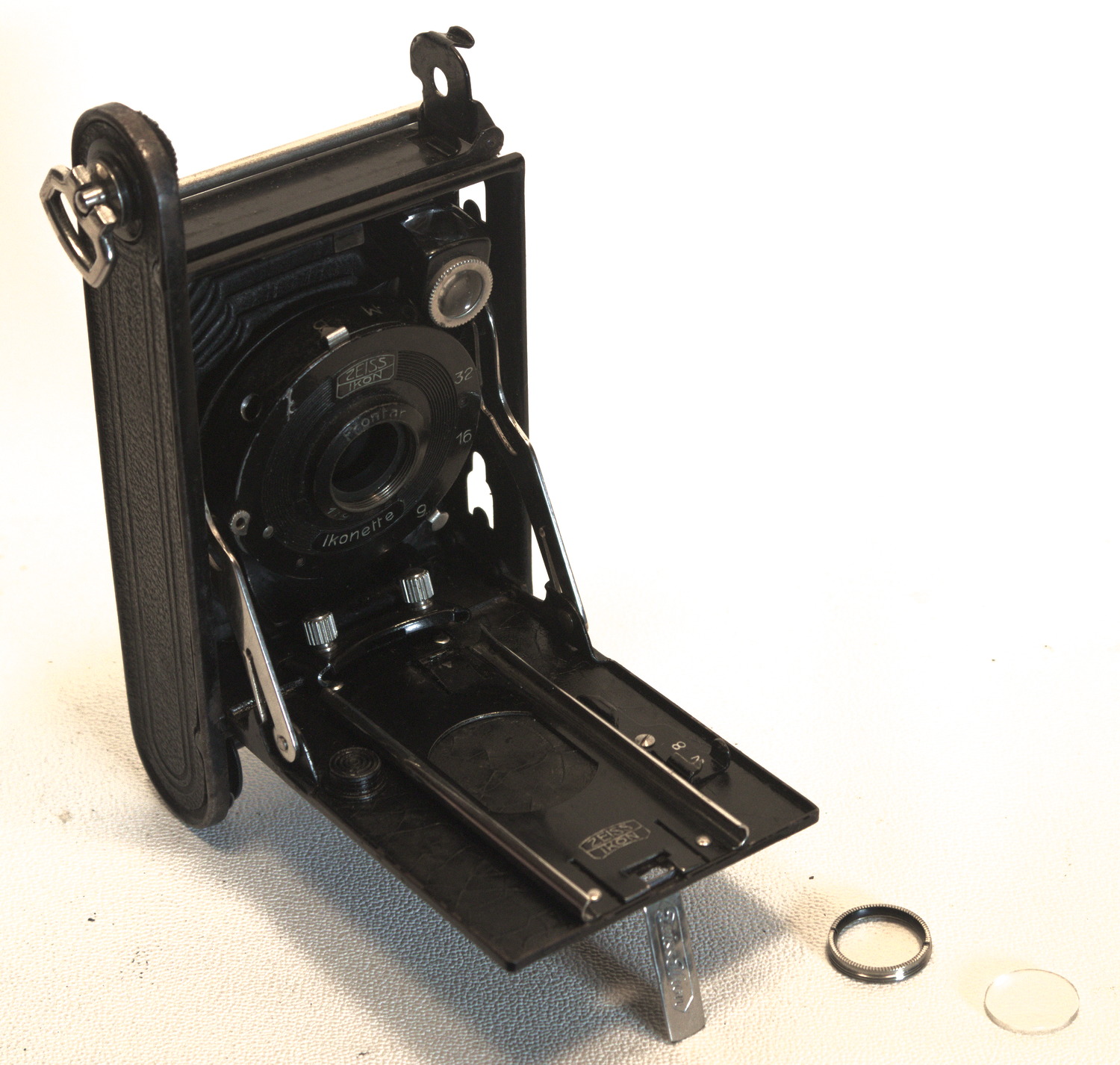 die Daten zur Zeiss-Ikon Ikonette 504/12 stehen bei Sepplbauers Datenblättern. Daß sie deutlich kleiner ist als eine 6x9-Filmkamera, sieht man am Vergleich (rechts ein Teil des Gehäuses einer ebenfalls aufschiebbaren lommeligen 6x9): Der Verschluß hat neben B und T nur eine Zeit - ca. 1/30 sec., im Gegensatz zu den Goerz- bzw. Zeiss-Boxkameras, die einen einfachen Rotationsverschluß haben, ist der hier ein "normaler" mit 2 Verschlußblättern. Die Blende ist jedoch eine Drehblende mit lediglich den 3 Einstellungen (ohne Zwischenwerte!). Zwischenstellungen wären wegen ungewöhnlicher Blendenöffnung durchaus experimentell.