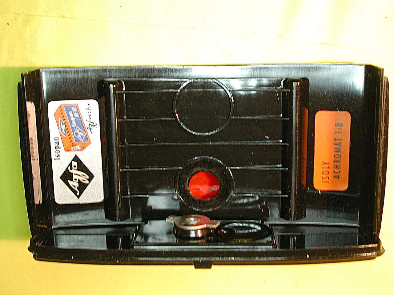 Der Aufkleber auf der abnehmbaren Rückwand weist die Kamera eindeutig als das Modell "Isoly-Achromat" aus. Eine Buchse mit Stativgewinde aus Aluminium ist eingelassen. Das rote Filmfenster ist nicht verschließbar. Innen gibt es einen Filzring, der Streulicht am Film vorbei in das Kamera-Innere verhindern soll. Den eigentlichen Zweck sieht man an dem Werbeaufkleber für die populären Agfa-Filme: der Zweck dieser Simpel-Kamera aus dünnem Plastik war wohl eher, nicht anders als bei den frühen Boxkameras aus Pappe, die Verkaufshilfe für Agfa-Filme und nicht, wie vielleicht bei einer Kodak-Retina, die Demonstration einer langlebigen Qualität.
