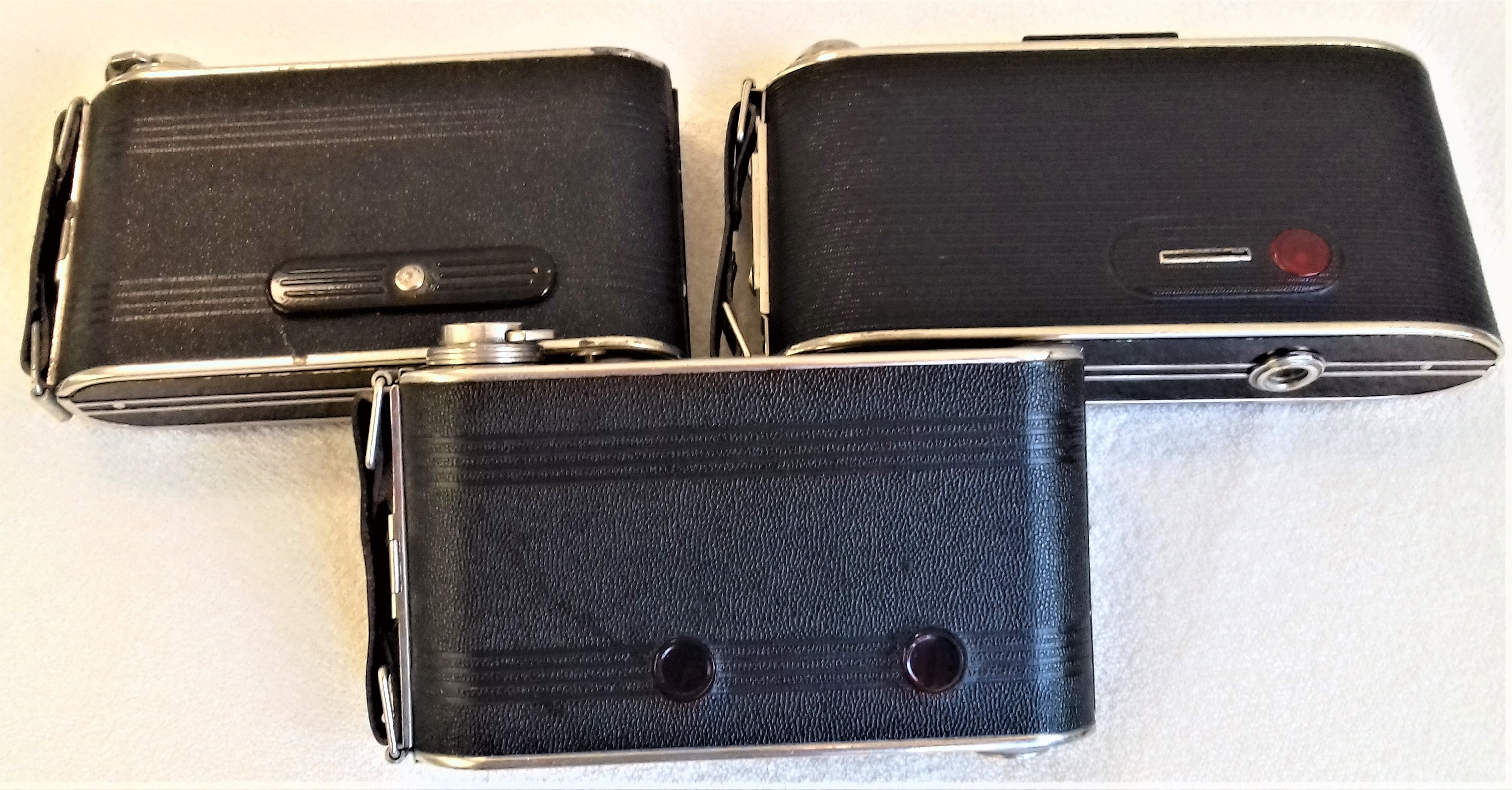 ja, tut mir leid, wie so oft zu schnell gelesen und zu schnell geantwortet... Hier kommt ein Bild mit den drei Filmfenster-Varianten bei meinen "Billy Clacks": 1. schwenkbarer Riegel, 2. Schieber, 3. ganz offen. Ich denke, in den dreißiger Jahren waren die ungeschützten roten Fenster allerdings noch kein Problem, weil ja nur Schwarzweiß-Filme zum Einsatz kamen, und die waren obendrein noch viel weniger empfindlich als heutige Kodak Ektachrome mit ISO 100 oder gar Kodak Portra mit ISO 160. Insofern dürften die "Lichtlecks" ein modernes Problem sein.