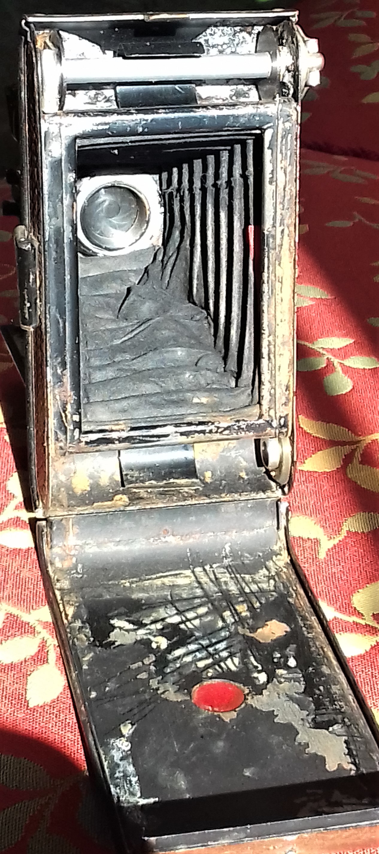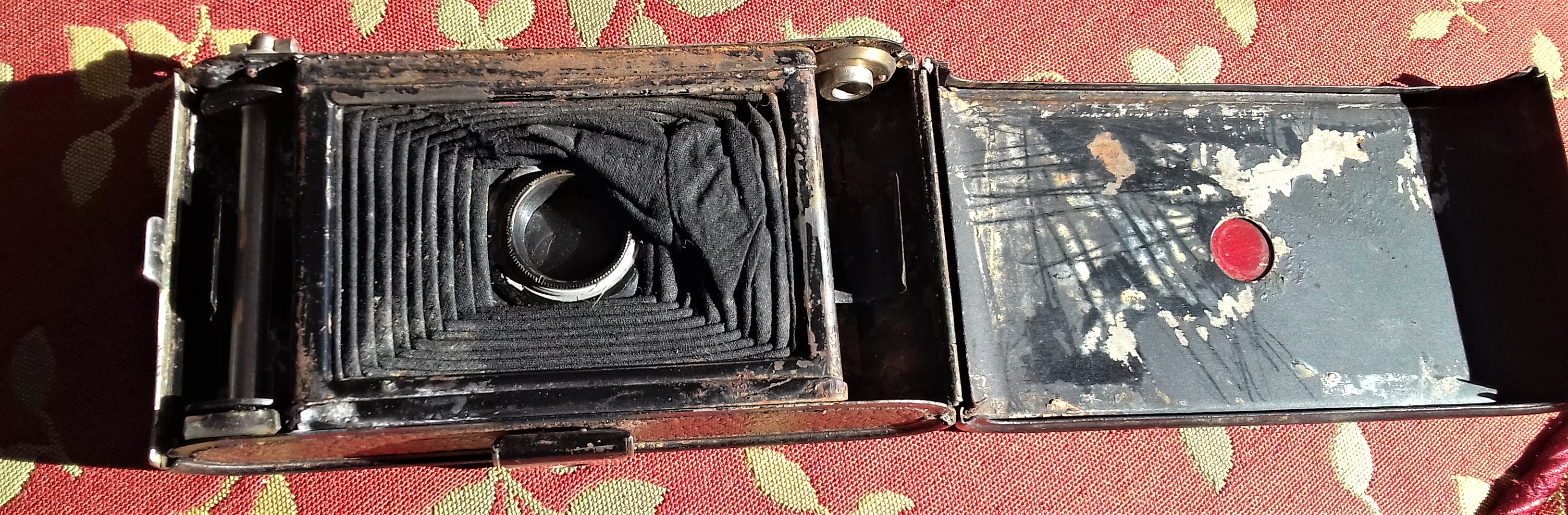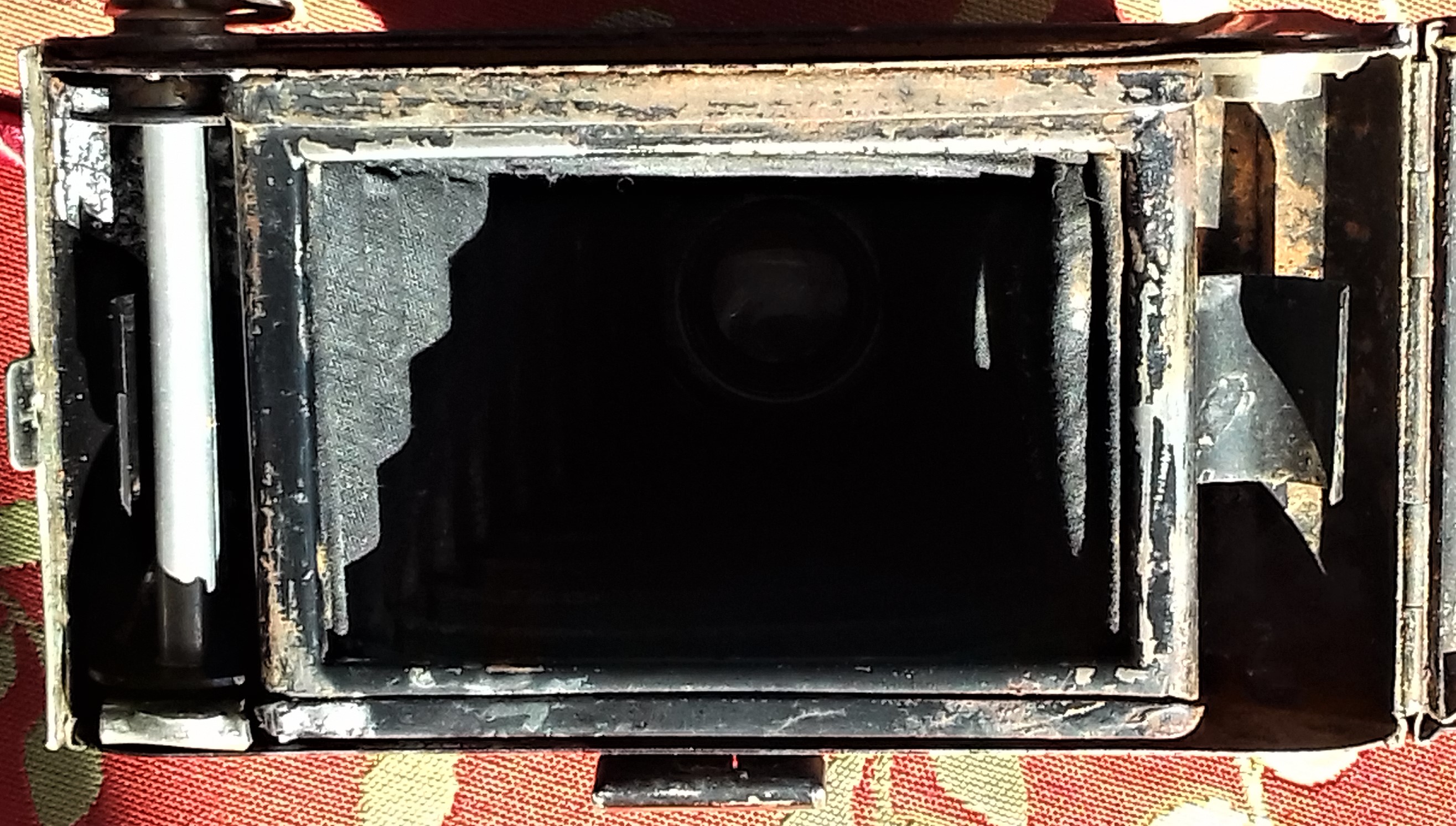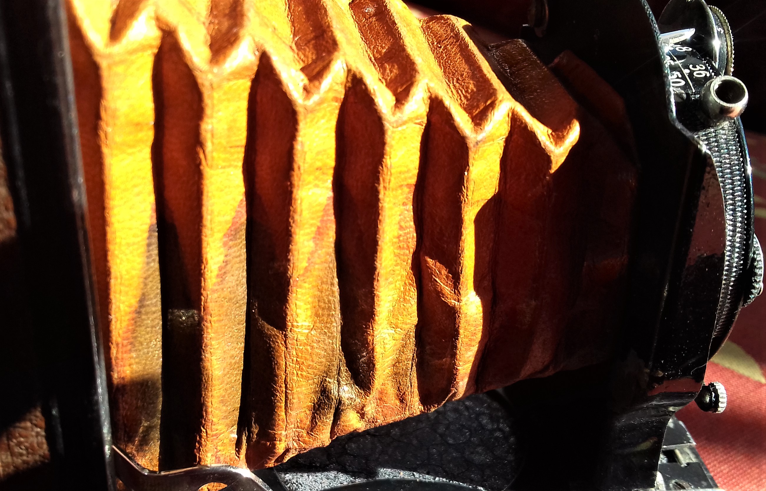 Diese Kamera ist ein Schmuckstück, und ich würde sie gerne in einen besseren Zustand versetzen, ohne zu sehr in ihre "Substanz" einzugreifen. Offenbar ist sie mal sehr feucht geworden. Der Balgen weist leider heftige Feuchtigkeitsflecken auf. An diesen Stellen ist er papierdünn geworden, auch wenn er lichtdicht zu sein scheint, und er faltet sich dort unregelmäßig zusammen. Die Metallteile im Inneren weisen erhebliche Roststellen auf.