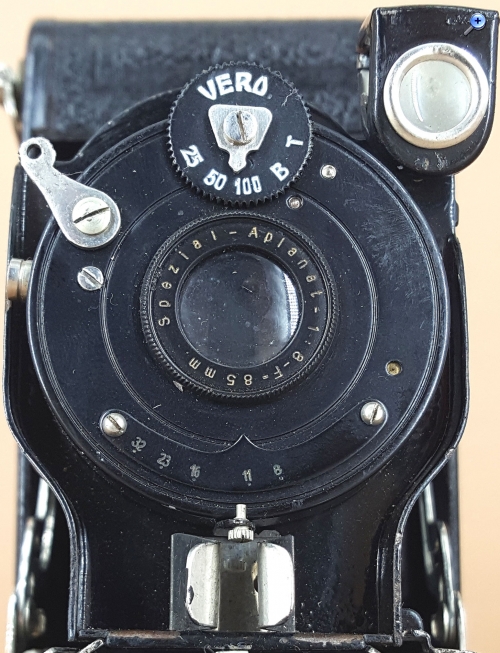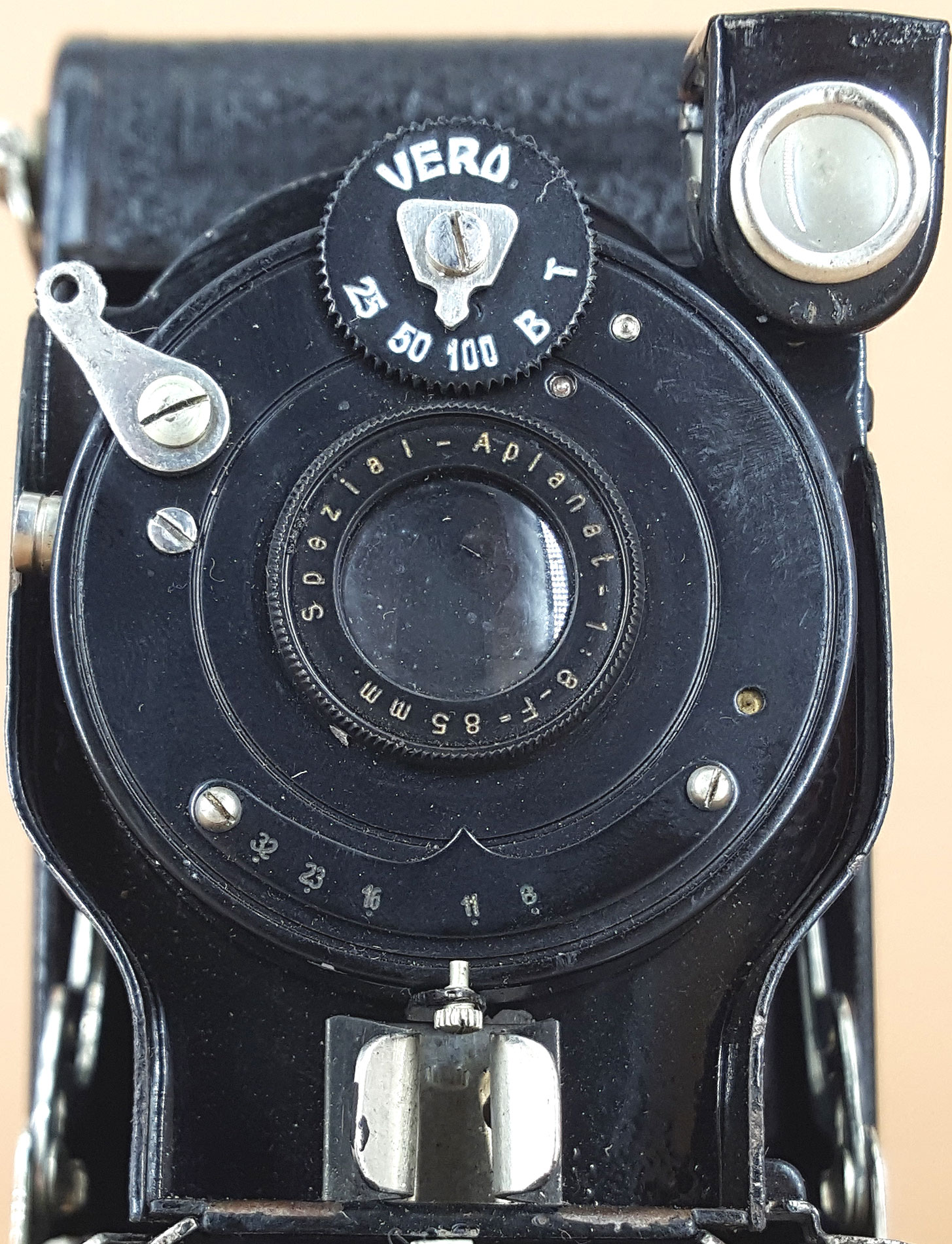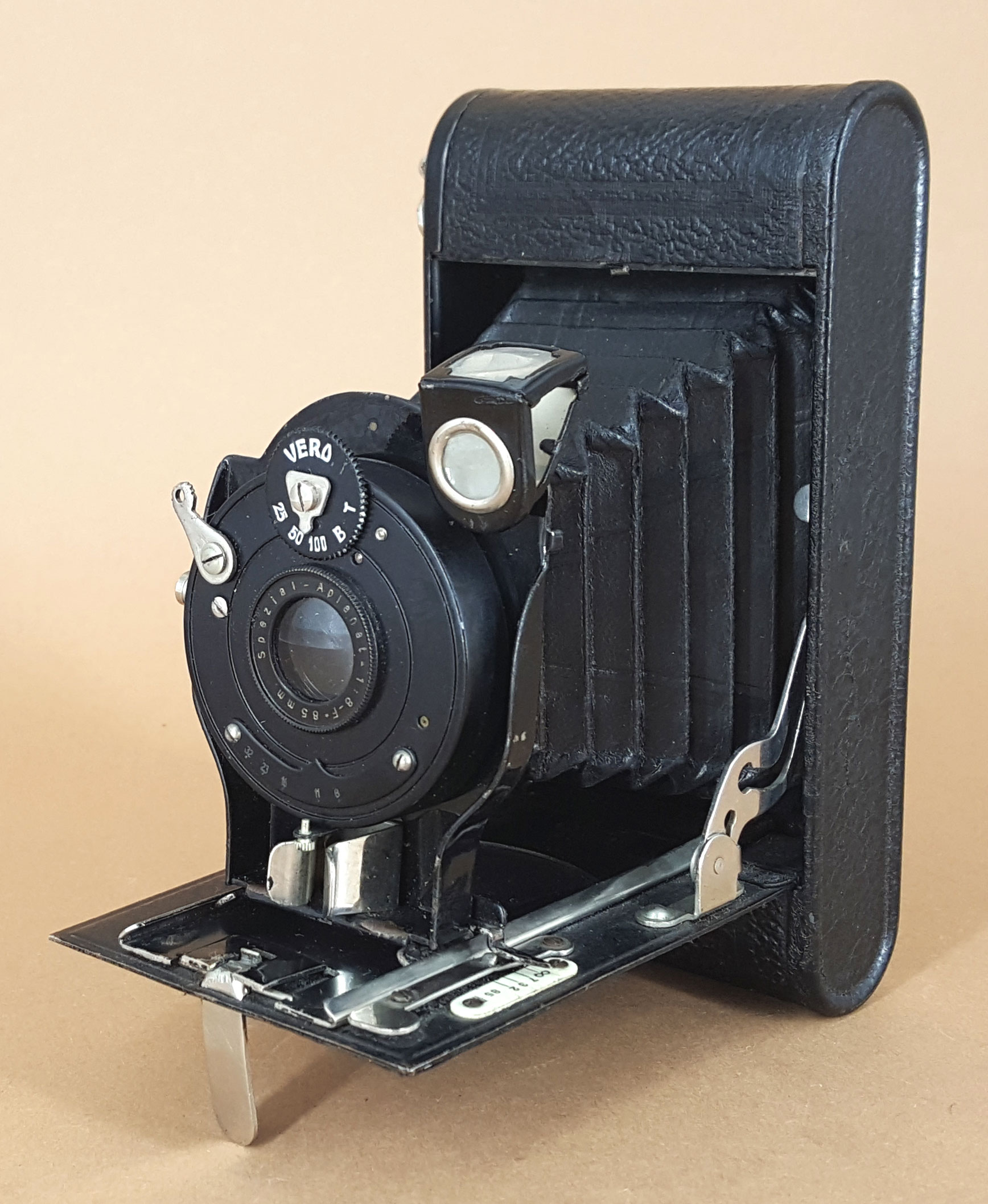 Hier sehen wir eine der oben schon erwähnten Luxus-Baldaretten in der Händlerversion Verette II. Ausgestattet ist dieses Exemplar mit einem „Vertex“ Spezial-Aplanat 8/8,5 im Vero-Verschluss. Diese Kamera stellt wahrscheinlich die letzte ‚Ausbaustufe‘ der Baldarette dar (mit Kippstandarte und Radialhebelfokussierung, der Drahtrahmen vom Sucher fehlt leider).