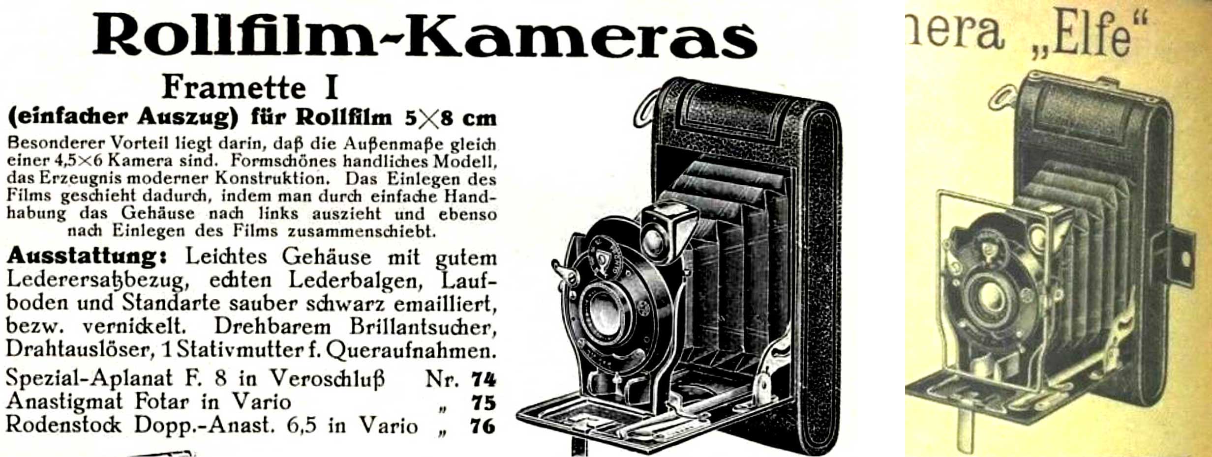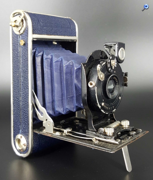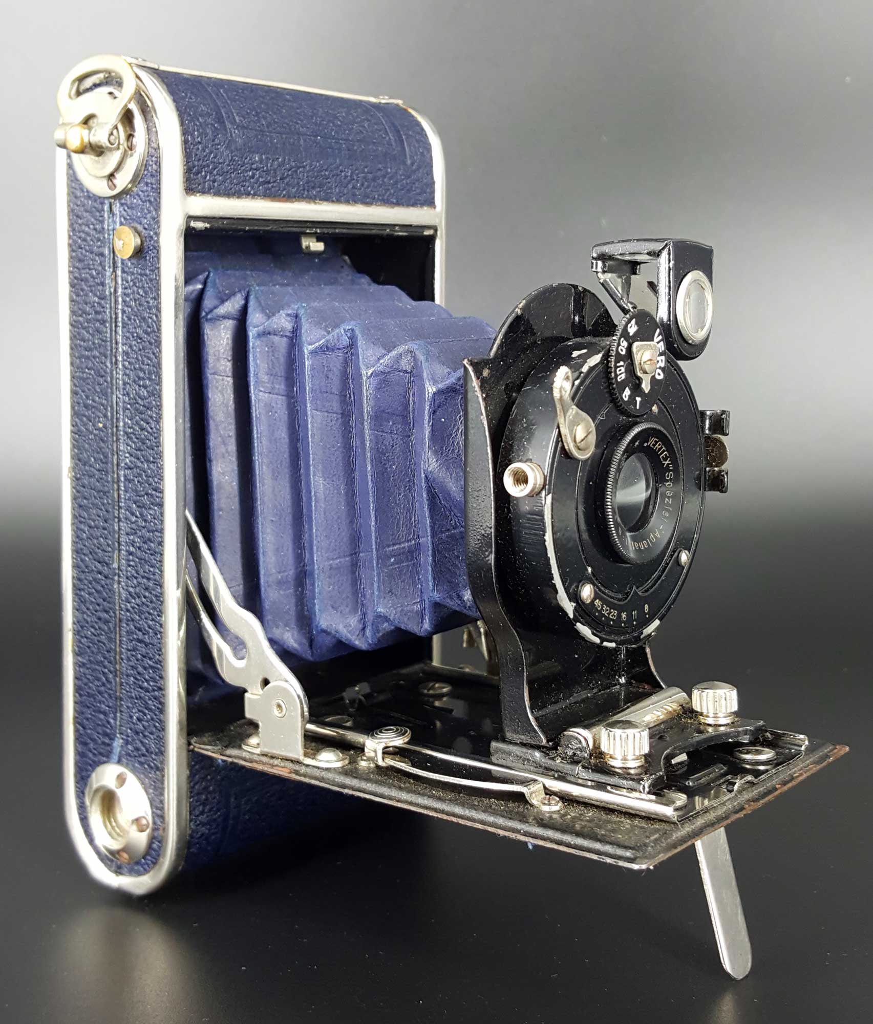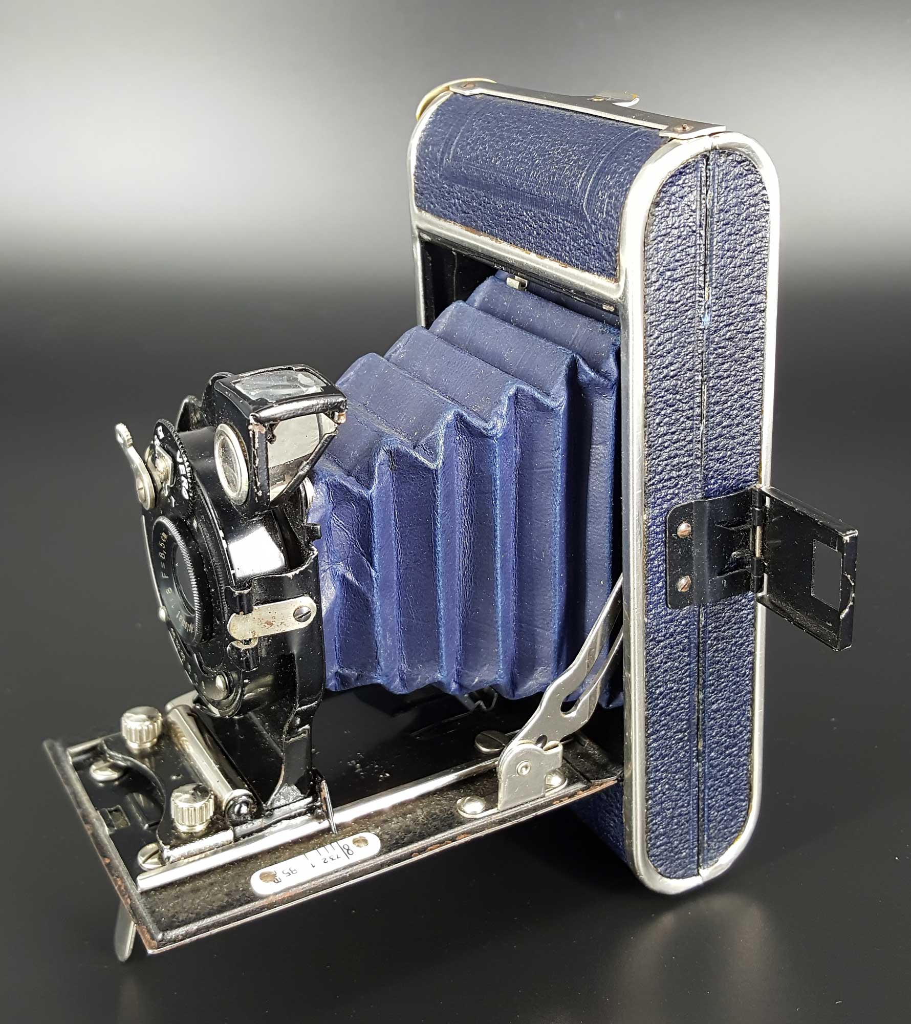 Hier sehen wir eine der oben schon erwähnten Luxus-Baldaretten in der Händlerversion Verette II. Ausgestattet ist dieses Exemplar mit einem „Vertex“ Spezial-Aplanat 8/8,5 im Vero-Verschluss. Diese Kamera stellt wahrscheinlich die letzte ‚Ausbaustufe‘ der Baldarette dar (mit Kippstandarte und Radialhebelfokussierung, der Drahtrahmen vom Sucher fehlt leider).