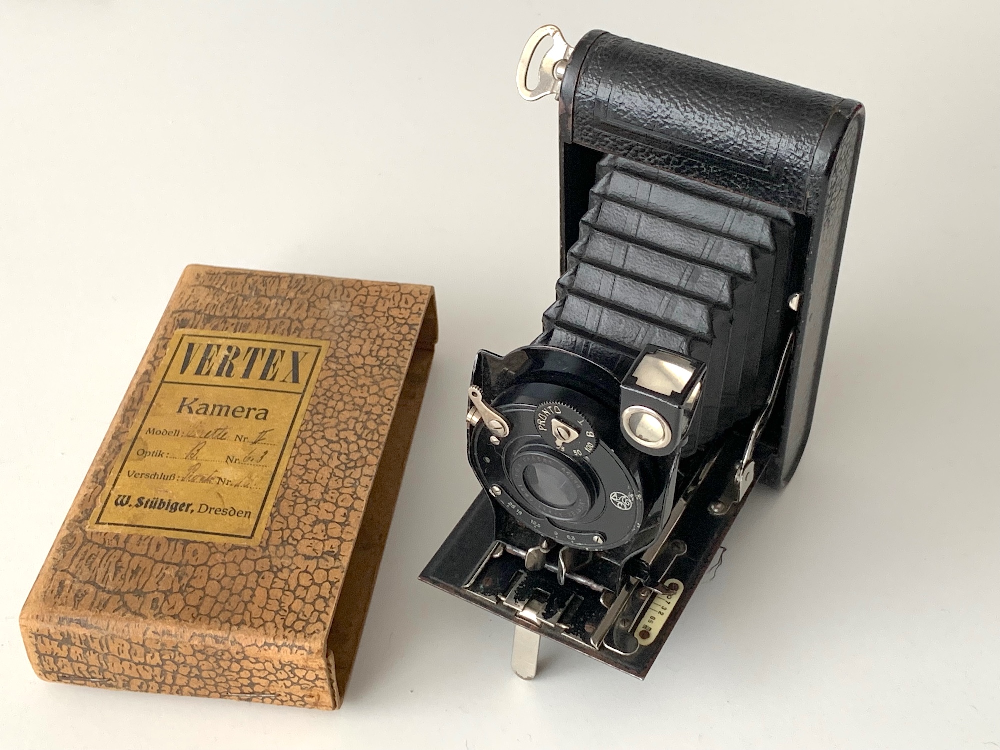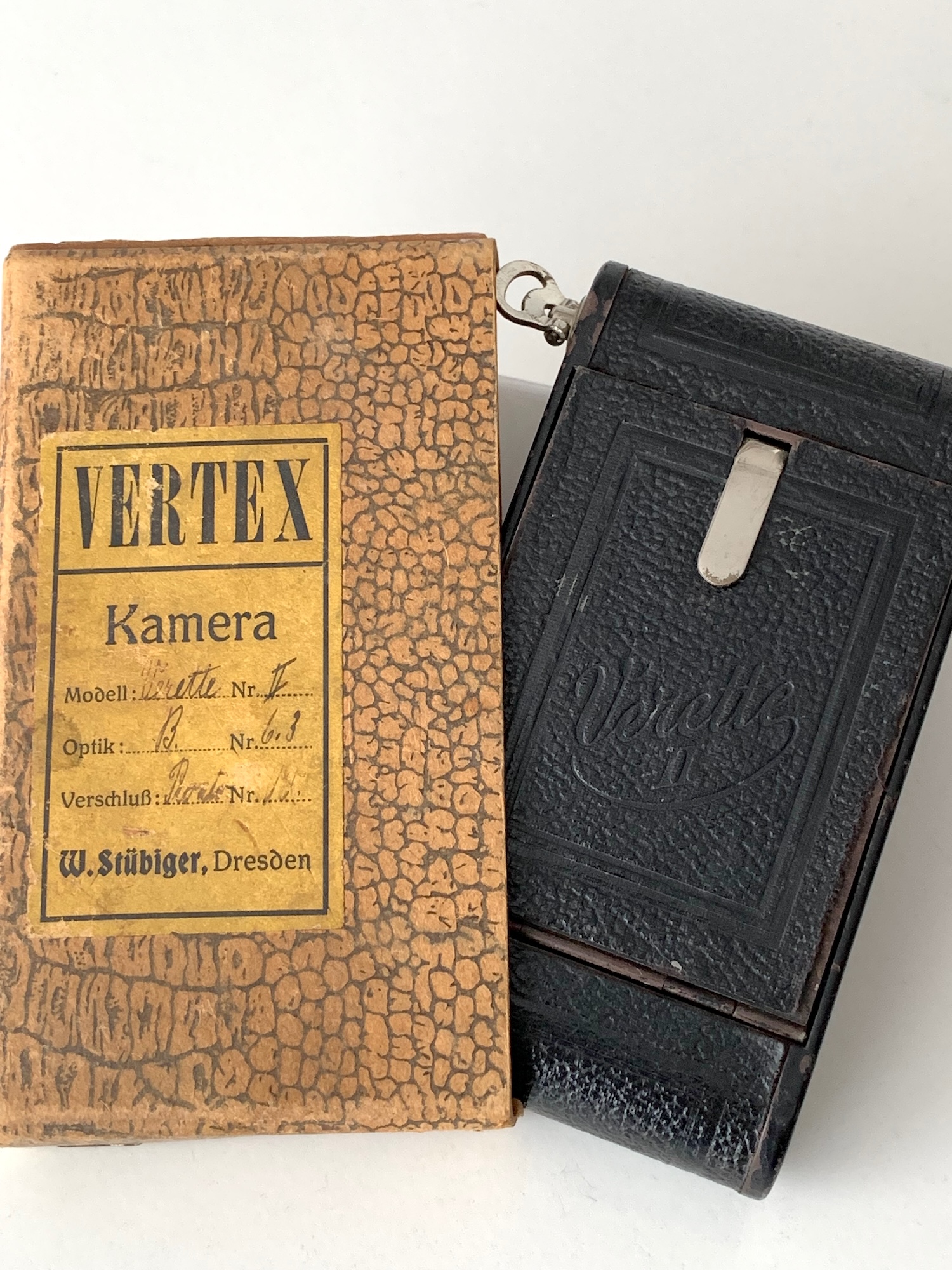 Interessant ist vor allem der mitgelieferte Originalkarton. Man hat hier einen Beleg dafür, dass diese Kamera von W. Stübiger angeboten wurde (und nicht von Unger & Hoffmann, wie gelegentlich angenommen wurde [z. B. Kadlubek UNG0100]; sie gehört offenbar in die Programmlinie „Vertex“; unter dieser Bezeichung wurden auch andere Modelle angeboten. Wenn Stübiger ein Handelsunternehmen und kein Hersteller war, könnte diese Marke durch Vertrieb und Export motiviert sein; das ist aber nur eine Mutmaßung. Vielleicht resultiert aus dieser Bezeichnung die Verwechselung mit Unger & Hoffmann, deren Kameras die Bezeichnung Verax trugen.