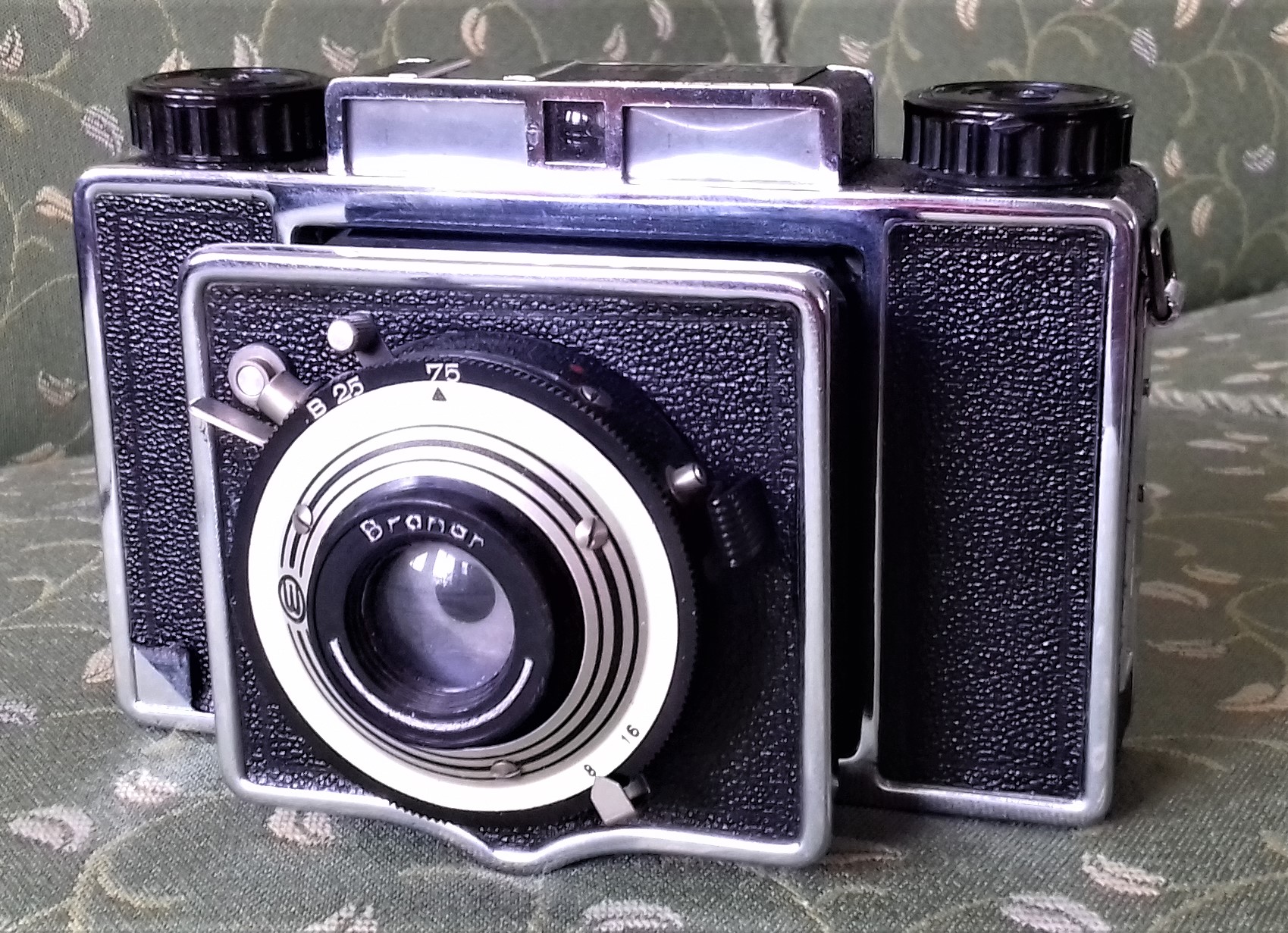 Ich möchte heute eine merkwürdige Kamera vorstellen: die Braun „Imperial“ (nicht zu verwechseln mit der gleichnamigen Box) von 1953. Merkwürdig ist sie deshalb, weil sie so tut, als sei sie eine Kleinbildkamera, und dabei handelt es sich um eine Rollfilmkamera (Bildformat 6x6) mit ausziehbarem Balgen — und eine sehr einfache noch dazu. In ihrer breiten Kastenhaftigkeit erinnert sie an spätere Designs, etwa das der Kleinbild-Spiegelreflex „Pentina“. Mit ihren Chromleisten und ihrem pompösen Namen „Imperial“ täuscht sie eine Wertigkeit vor, die sie definitiv nicht hat.