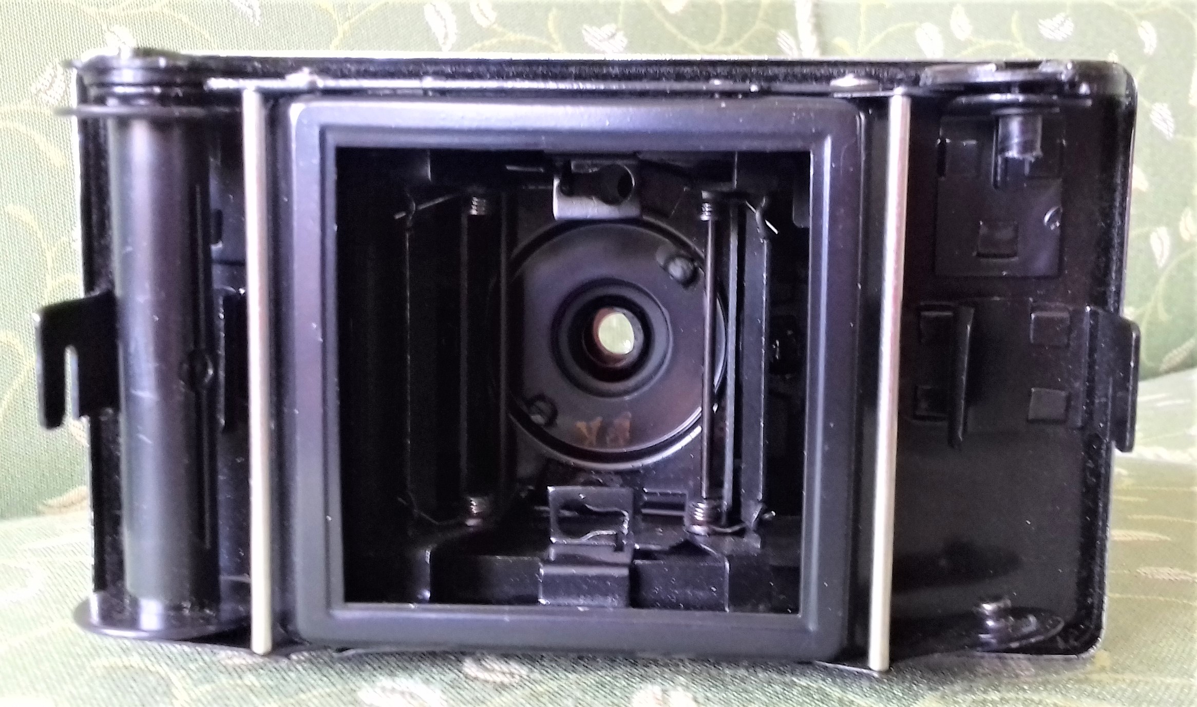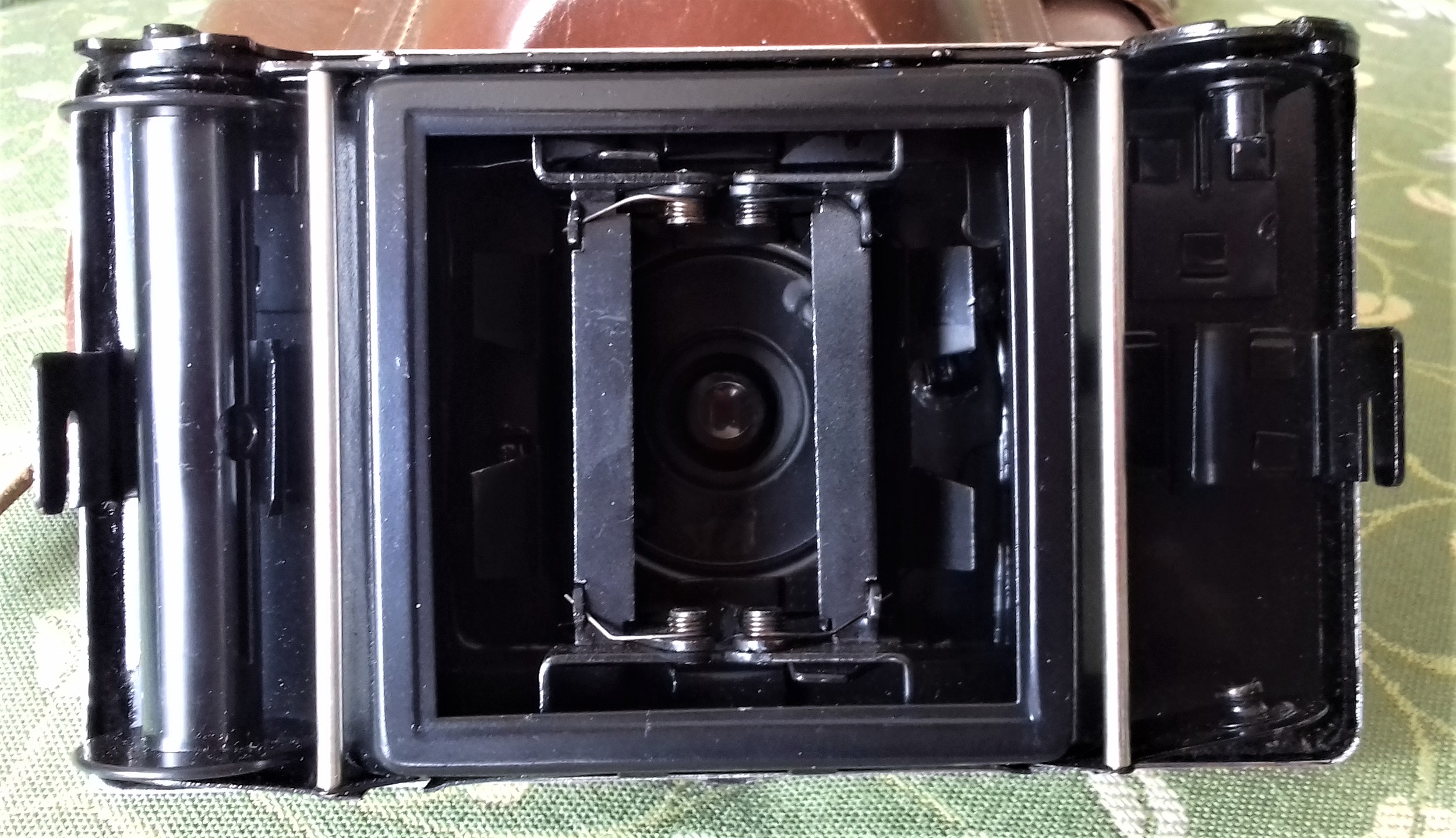 Och, ich wette, ihre Besitzer waren stolz auf sie. Eine Paxina mit Dreilinser war fast doppelt so teuer. Bin neugierig, ob Du mal Testfotos mit ihr machst. Ich wette, sie kämen an eine Edelbox wie die Ensign heran. Sie hat etlichen einfachen Rollfilmkameras viel späterer Zeiten etwas voraus. Beispielsweise hat die Filmführung zwei Rollen. Vermutlich gibt es auch eine echte federnde Filmandruckplatte. Andere Kameras ähnlicher Zeit und Machart zerren den Film über plastikne Kanten eines gewölbten Bildfensters, um die Bildfeldwölbung einer einfachen Meniskuslinse auszugleichen (aber nur in waagerechter Richtung). Das rote Fensterchen scheint einen Lichtverschluß zu haben. Ein Achromat ist lichtschwach, aber nicht unbedingt unscharf in den Ecken.