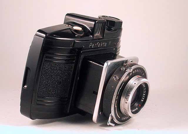 von der Pefekta II habe ich auch eine Version mit kursiver Beschriftung.Die sieht man eher seltener. Ich habe auch mal eine Perfekta bei ebay ersteigert, von der ich dachte es könnte eine "Neuentwicklung" sein. Das Objektiv und der Verschluss wurden durch eine Objektiv - Verschlusseinheit der Weltax (da gibt es auch eine Variante von Rheinmetall) ersetzt. Nach Recherche in einem Museum in Sömerda entpuppte sich die Kamera aber als eine Bastelei.