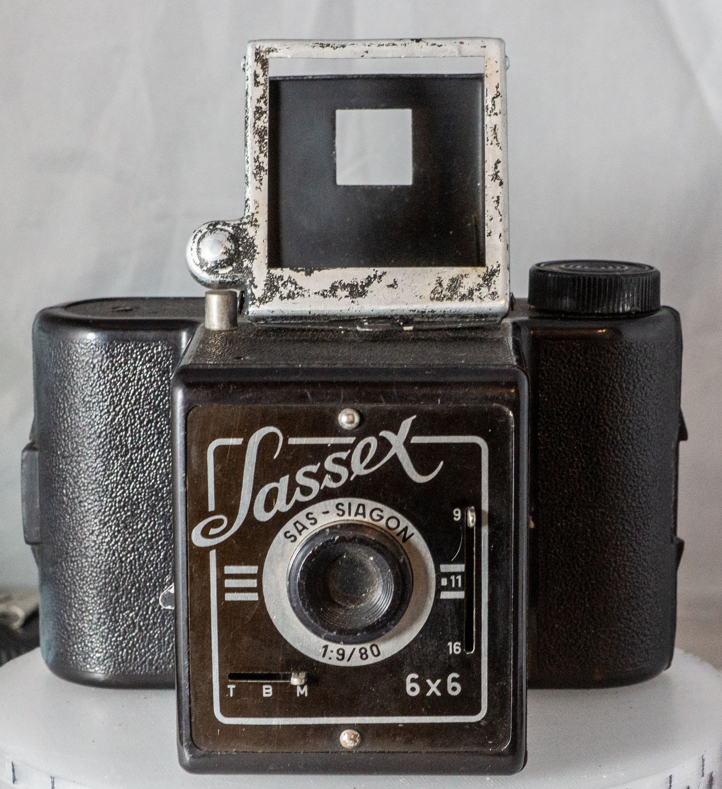 Hersteller, Modell: SAS Gerätebau GmbH Vlotho (Westfalen), Sassex Baujahr : 1948-49(51) Verschlusszeiten: M-B-T Blenden 9/11/18 ( Lochblenden) Optik:SAS-Siagon 1:9/80mm Film: 120 Rollfilm Stativgewinde ( Aluminiumspritzguss) Kleiner Nachtrag Es gab anscheinend verschiedene Versionen der Kamera ( abgesehen von der Farbe) ich habe in der Bucht eine gesehen, die, im Gegensatz zu meiner, keine abnehmbare Rückwand hatte, sondern auf einer Seite ein Scharnier.