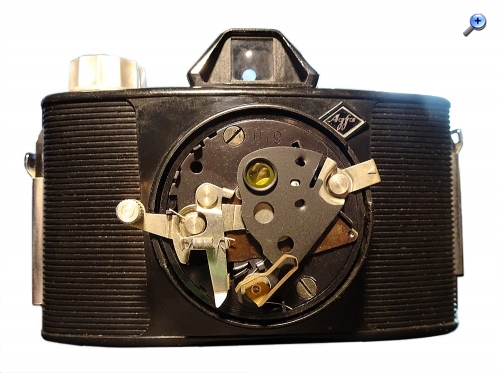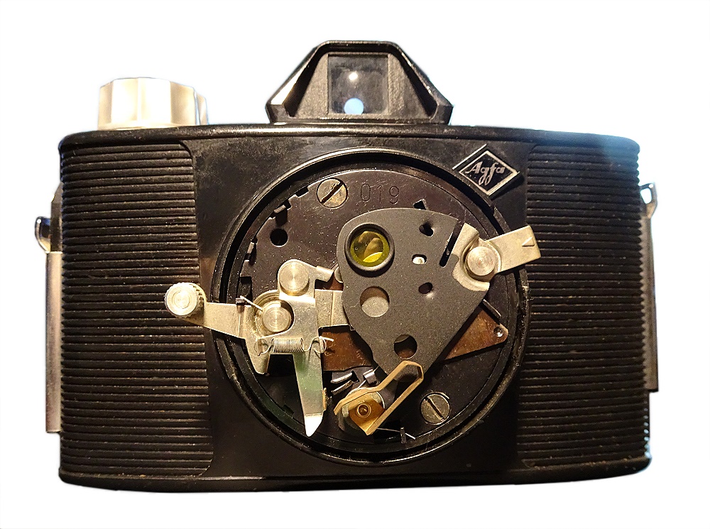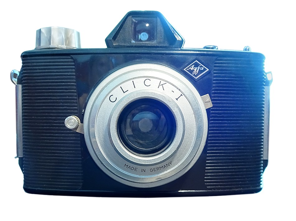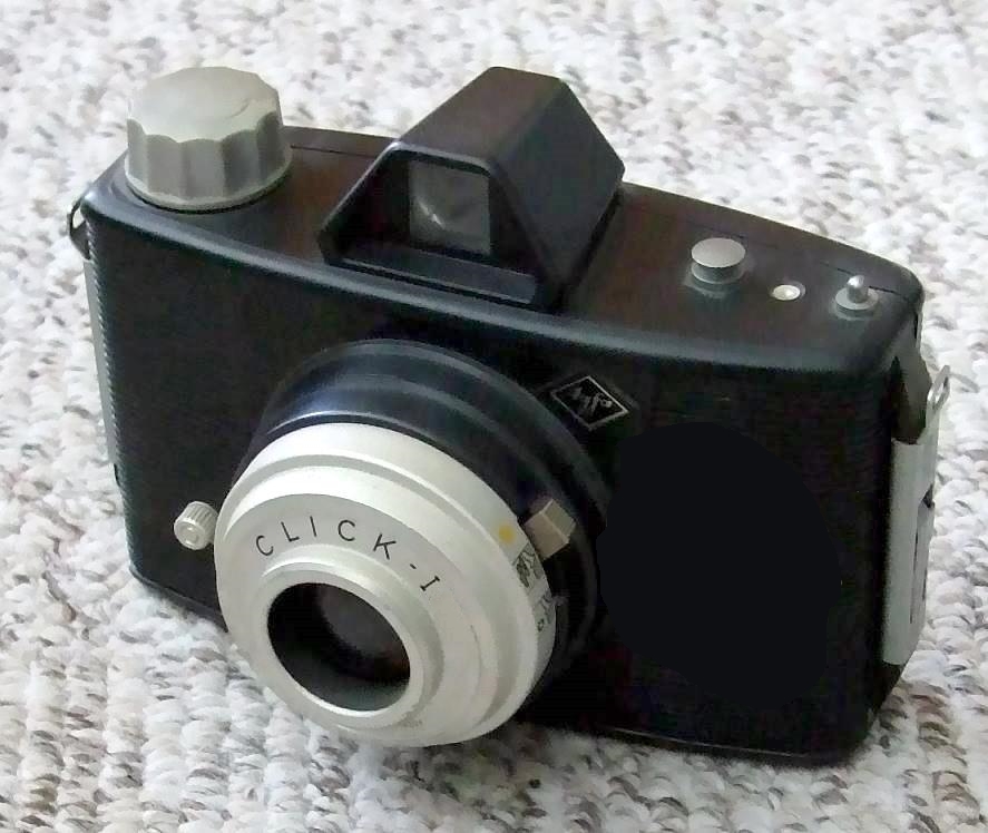 bald nach der Agfa Clack kam die Agfa Click auf den Markt. Sie sah etwas moderner (weil flacher) aus, hatte aber weniger Möglichkeiten als die Clack. Sie hatte um die Bildfehler der Meniskus-Liste besser zu kompensieren (wie die Clack auch) eine gewölbte Filmauflagefläche.