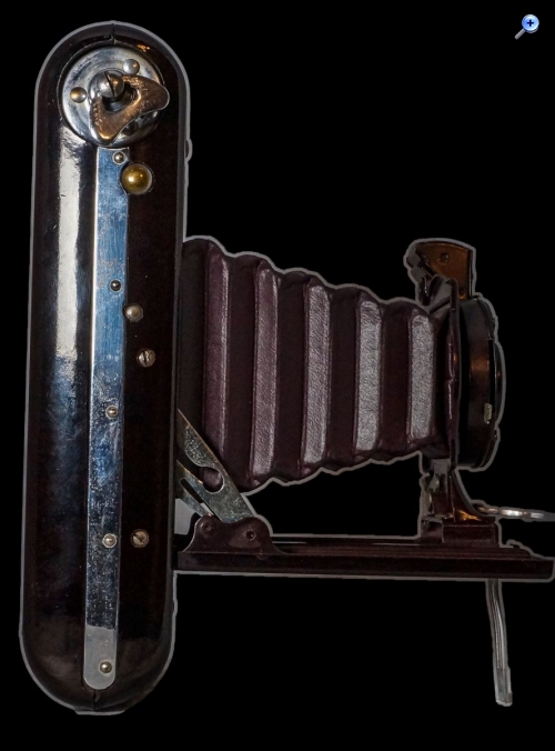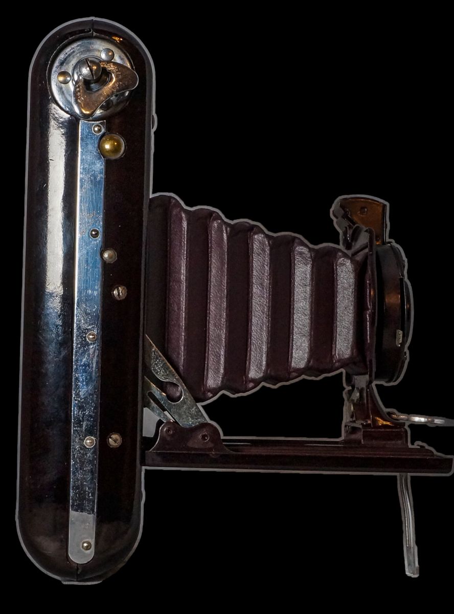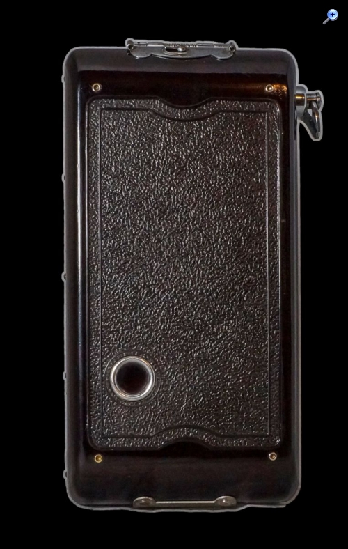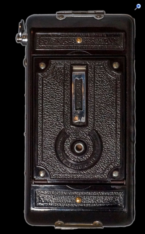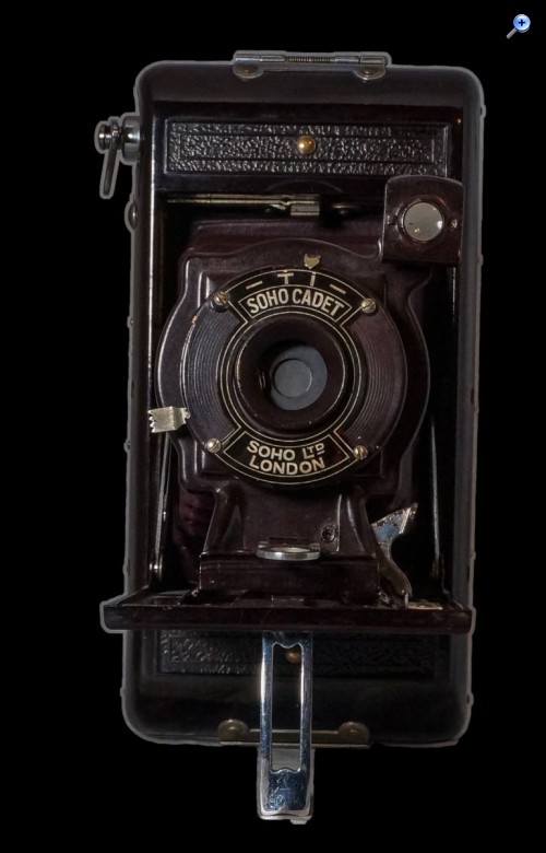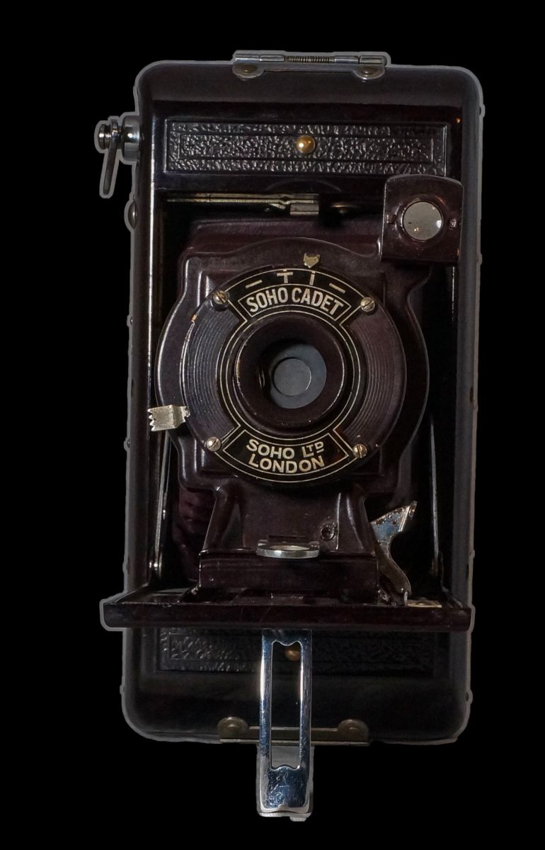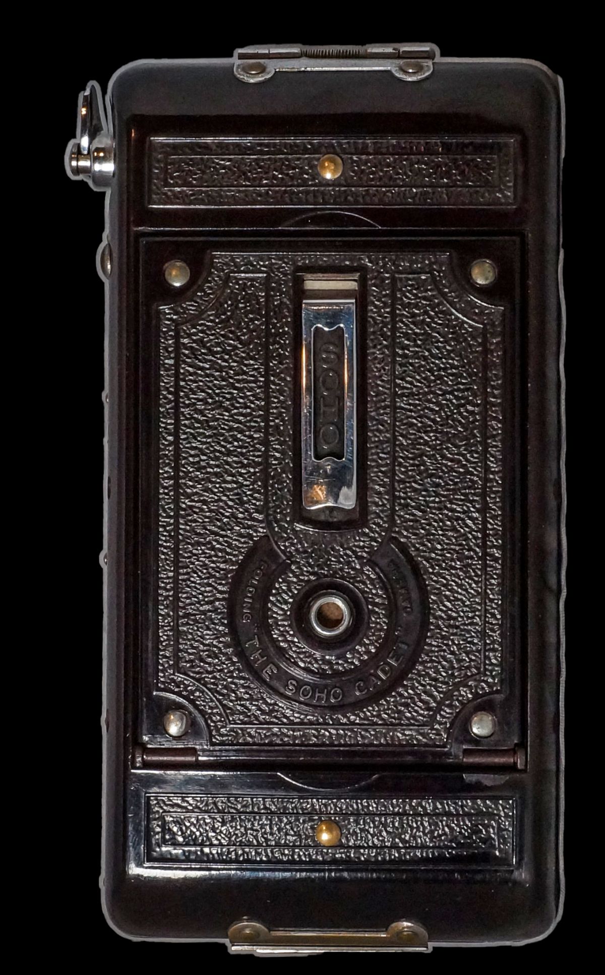 Hersteller: Soho Ldt. London Baujahr: 1930 Optik: Meniskus Linse Fokus: Einstellbar auf near und far Zeiten: T und I Film: Rollfim 120 Bildzähler: über Sichtfenster Ein Stativgewinde Ein Brillantsucher