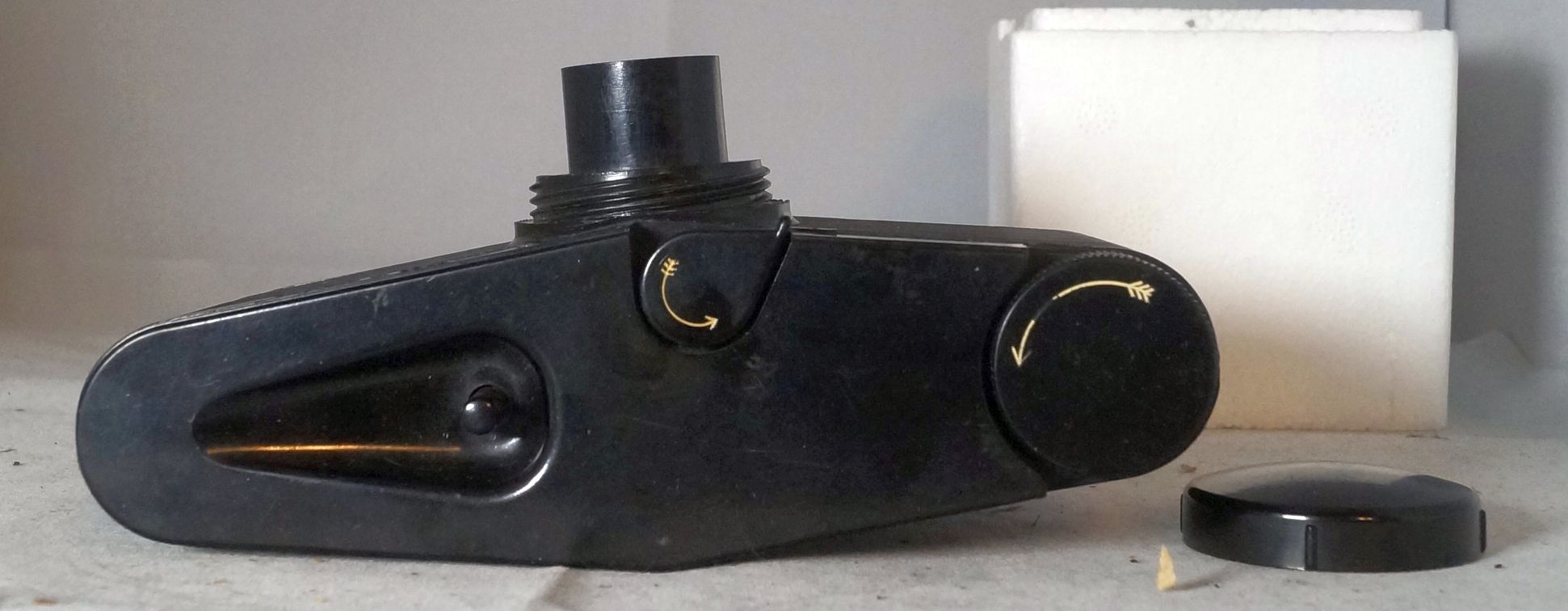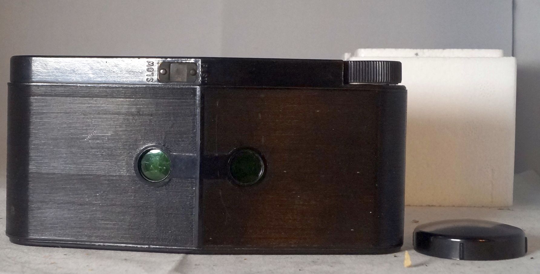 Ich denke dem ist auch der breite Body, aus Bakelit, geschuldet, denn das Format auf 127 Rollfilm ist 3,18 cm auf 3,18 cm, als quadratisch. Übrigens, solange das Objektiv eingefahren / hineingedrückt ist löst, die Kamera nicht aus. Mit dem kleinen Hebel auf der Oberseite wird der Verschluss gespannt. Die krummen Zahlen sind der Tatsache geschuldet, dsas von inch in cm umgerechnet wurde.