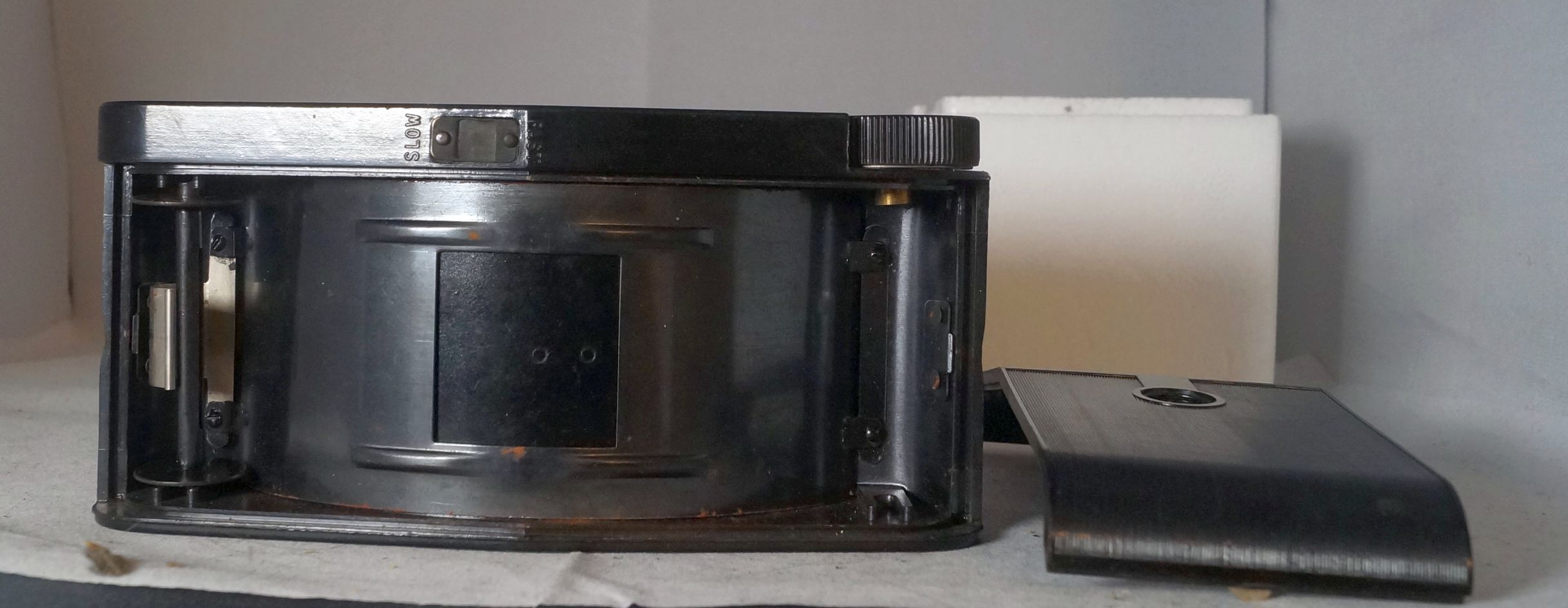 interessantes Konzept, aber eigentlich auch eine ganz pfiffige Idee diese Verschlußzeitensteuerung. Da das ein quadratisches Bildformat ist, ist ja auch die Lage der Kamera unerheblich: Links-Kipp, Normal, Rechts-Kipp bringt die gleichen Fotos hervor. Diese gewölbte Filmlage gibt es auch ähnlich bei der Agfa Clack. Ich glaube, damit konnte man bei einfachen Objektiven einige Abbildungsfehler etwas kompensieren.