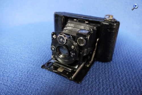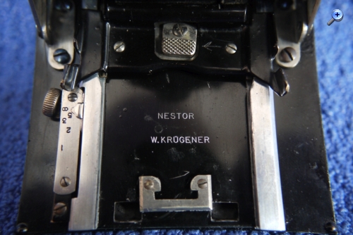 Bei der Kamera handelt es ich um eine seltene "Nestor" 6x6 auf 127iger Rollfilm von Walter Krügener aus Eltville am Rhein. Walter war der Sohn von Rudolf Krügener, dem noch berühmteren Kamera-Pionier. Sie ist von 1920 und besitzt ein Plaubel Anticomar 4,2 / 7,5 cm Objektiv.