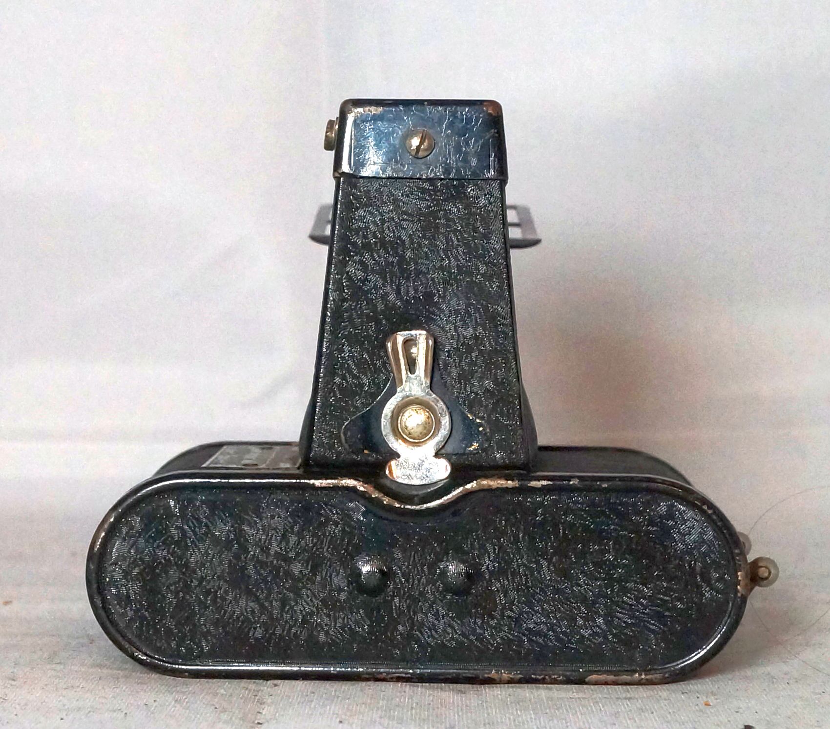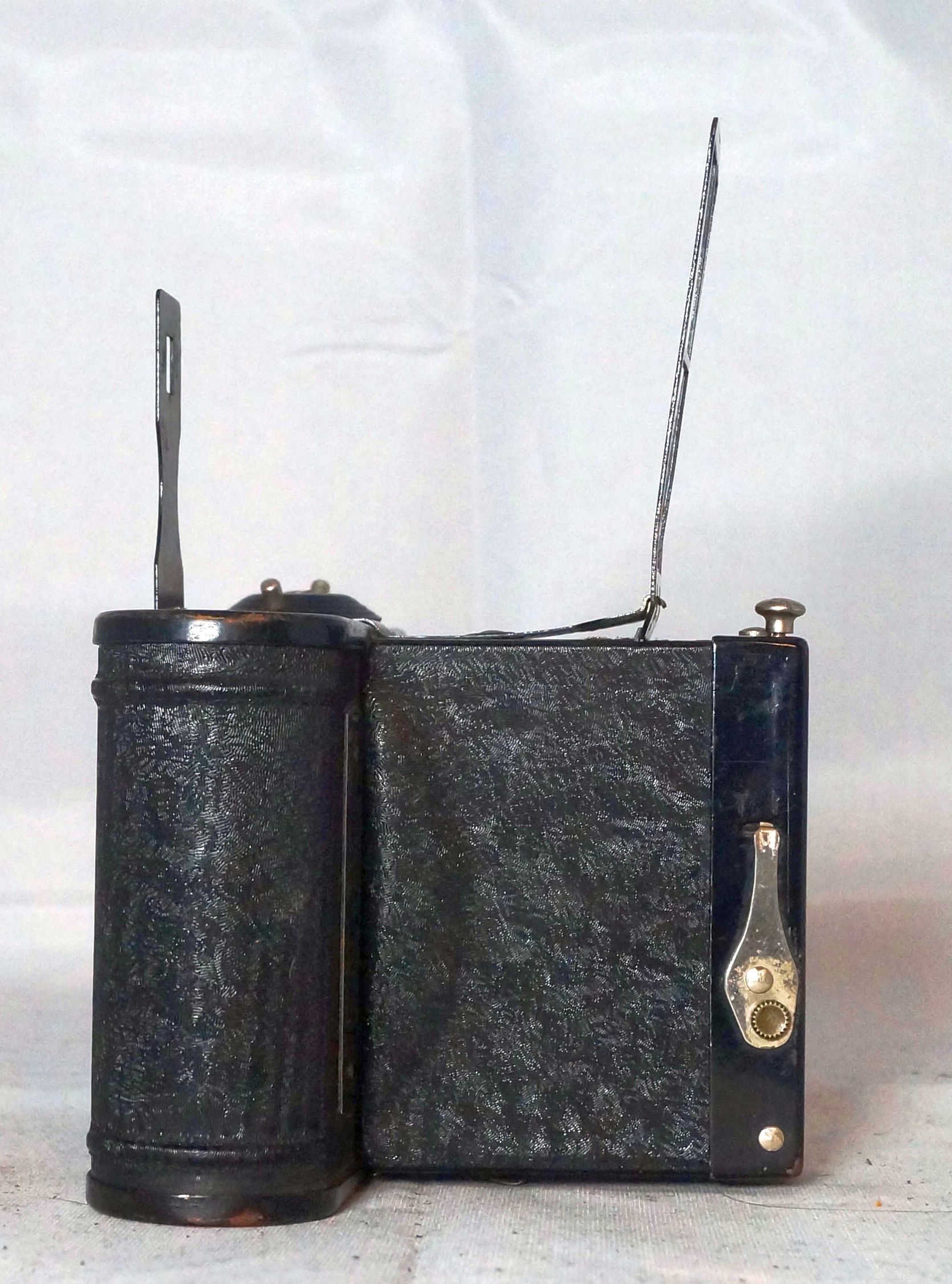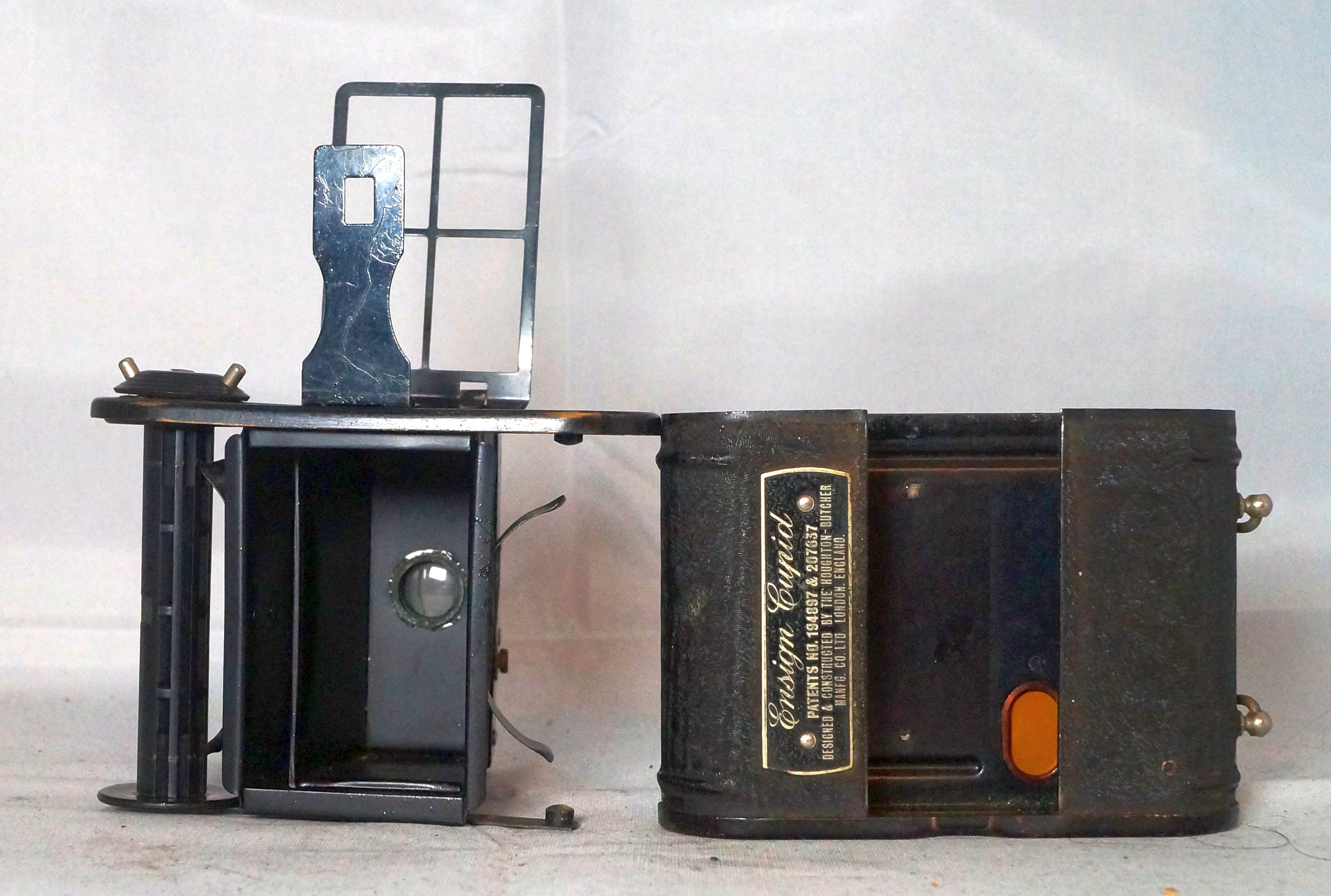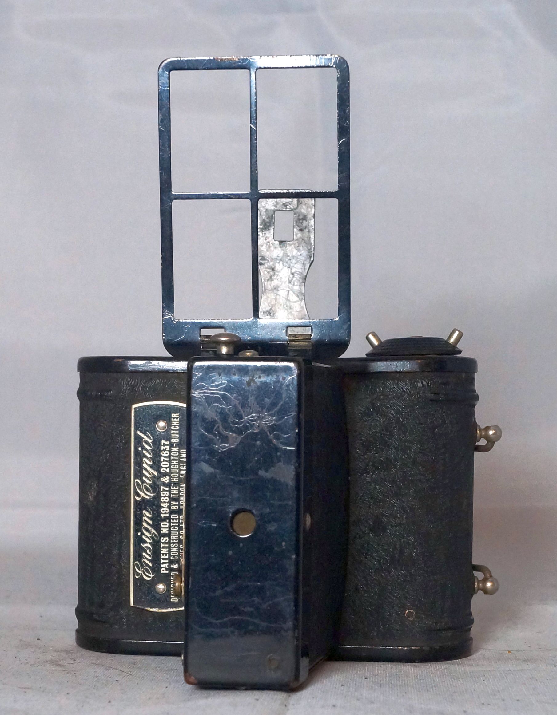 hier mal wieder eine besondere Kamera, die Ensign Cupid. Ich war nicht ganz sicher ob ich sie hier oder unter Box Kamera einstellen sollte, aufgrund der Form habe ich mich für hier entschieden. Die Form ist es auch die sie so besonders macht, sie war rein optisch ihrer Zeit voraus. Sie wurde ab 1922 gebaut, und hat sich kaum verändert, bis auf die Aufschrift.