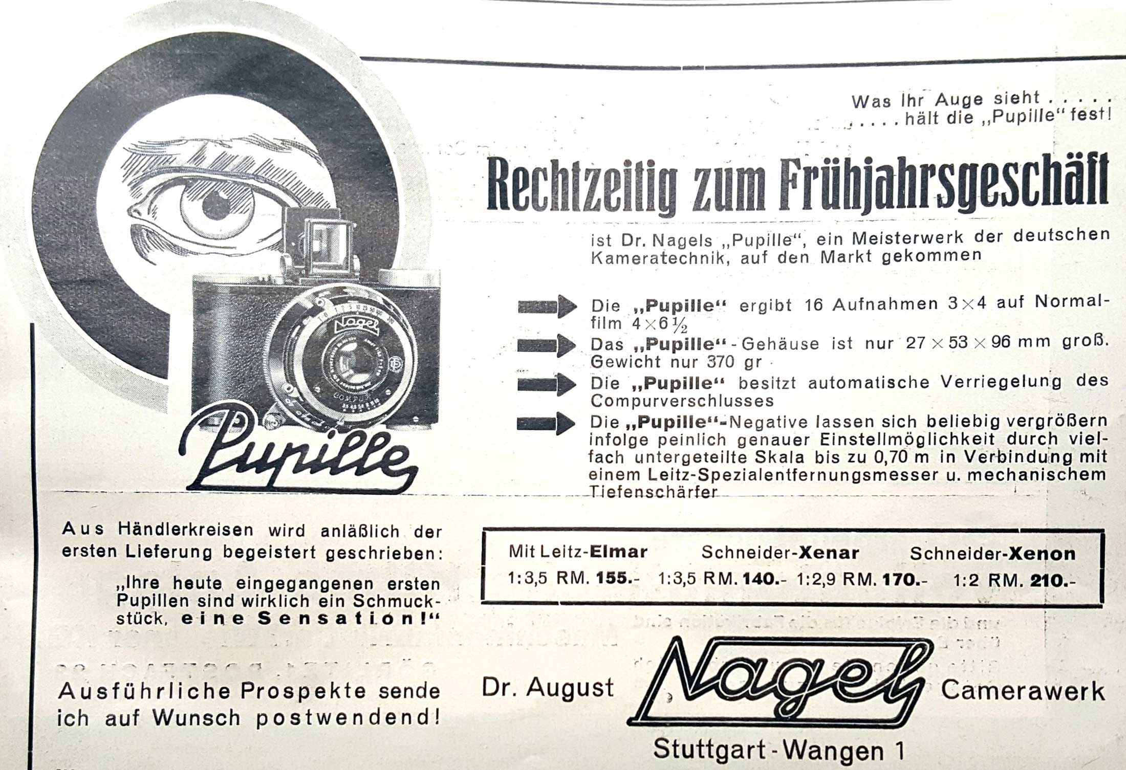 Davon abweichend oder auch präzisierend berichtete die zeitgenössische Fachpresse, dass die Pupille zur Frühjahrsmesse im Februar 1931 erstmalig präsentiert wurde. Zu diesem Zeitpunkt ist die Kamera aber bereits im Handel gewesen, denn bereits am 18. Februar 1931 schieb die Photographische Industrie: „Es hat sich im Laufe der letzten Wochen gezeigt, daß die Firma Dr. August Nagel, Stuttgart-Wangen, mit ihrer Pupille-Konstruktion eine sehr glückliche Hand gehabt hat. […] die ersten Lieferungen haben schlanken Absatz gefunden und vielfache Nachbestellungen nach sich gezogen. […]“ Man kann deshalb davon ausgehen, dass die Pupille wahrscheinlich Ende des Jahres 1930 auf den Markt kam. Hier noch eine zeitgenössische Werbung vom Februar 1931: