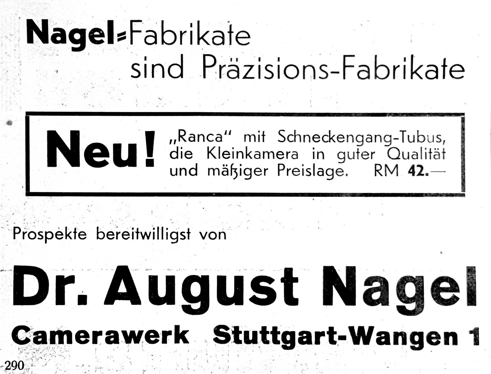 Die preiswertere und einfacher ausgestatte Ranca kam tatsächlich erst 1931 auf den Markt. Am 27. Mai 1931 berichtete die Photographische Industrie: „‘5 Kameras = 5 Schlager‘, so betitelt sich ein neuer, in hübschem Zweifarbendruck ausgestatteter Faltprospekt, den die Firma Dr. August Nagel, Stuttgart-Wangen, soeben zum Versand bringt. Der Katalog enthält außer der in so kurzer Zeit zu internationalem Ruf gelangten ‚Pupille‘, die neue ‚Ranca‘ und drei weitere Nagel-Kameras, die als unbedingte Verkaufsschlager gelten können.“ Anfang Juli 1931 findet sich die Ranca auch zum ersten Mal in einer Anzeige in der Photographischen Industrie: