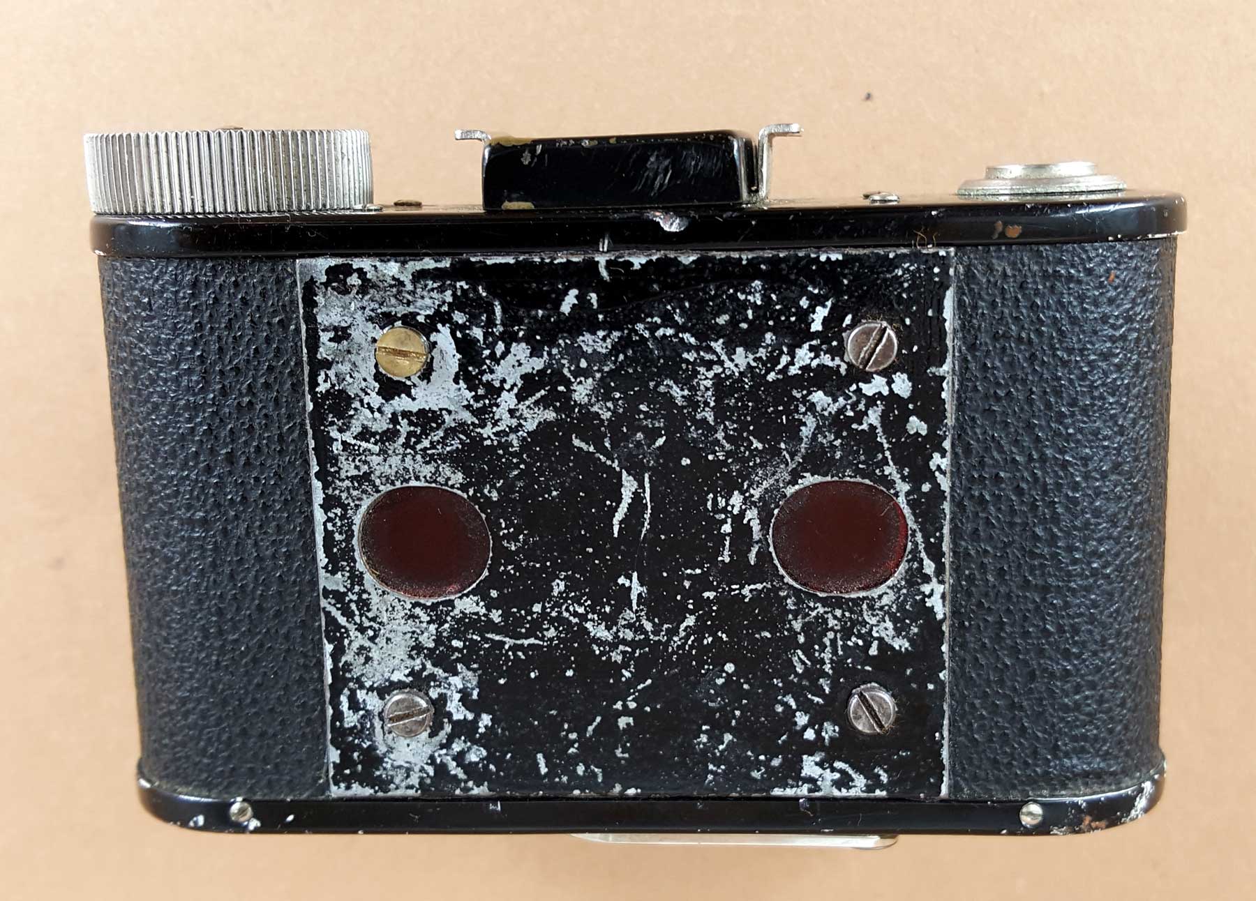 Ich habe eine merkwürdige Umbau-Kamera, bei der jemand eine Ica Bébé mit dem Gehäuse einer Rollfilmkamera verbunden hat. Von welcher Kamera das Gehäuse stammt, habe ich noch nicht herausgefunden (evtl. eine Kodak?). Bei dieser Kamera gibt es ebenfalls eine mit dem Rotfenster gekoppelte abschraubbare Platte auf der Rückseite: