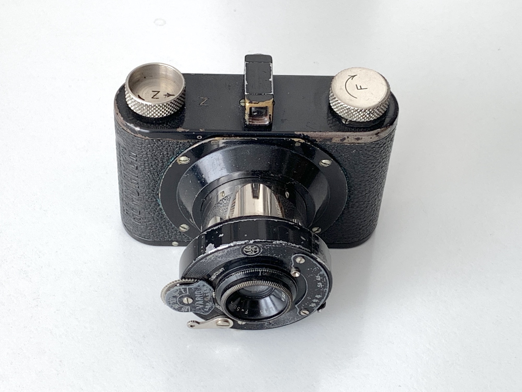 Das erste Modell hat den Fernrohrsucher in der Mitte, es gibt keinen Zubehörschuh und keine Griffe am Verschluss. Der Tubusansatz läuft konisch aus. Das hier gezeigte Exemplar trägt die Aufschrift "Reporter", das ist eine Handelsmarke von Hermann Tietz und von Ringfoto. Verbaut ist ein "Reporter" 4,5/5 cm in Vario 25–100. Diese Basisversion war vermutlich im Zeitraum 1932–1936 im Handel.