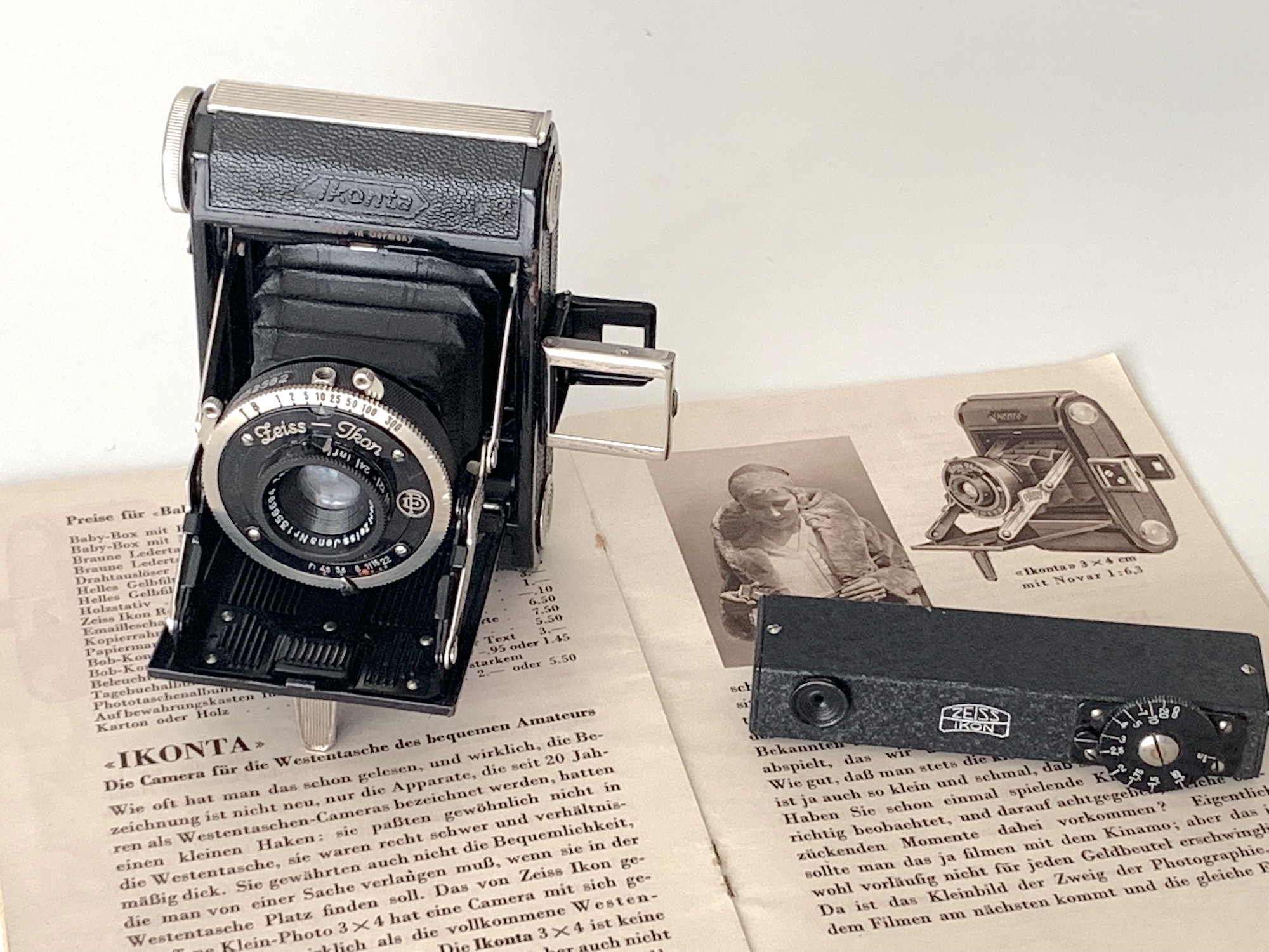 Es folgten weitere Varianten, die sich hinsichtlich der Objektiv- und Verschlussausstattung unterscheiden – lieferbar waren im Laufe der Bauzeit – die Baby-Ikonta war bis 1937 auf dem Markt – Novar 4,5 und 3,5, Tessar 4,5 und 3,5, Compur und schließlich Compur-Rapid. Oben sehen wir die Variante mit Tessar 4,5 in Compur 1–300.