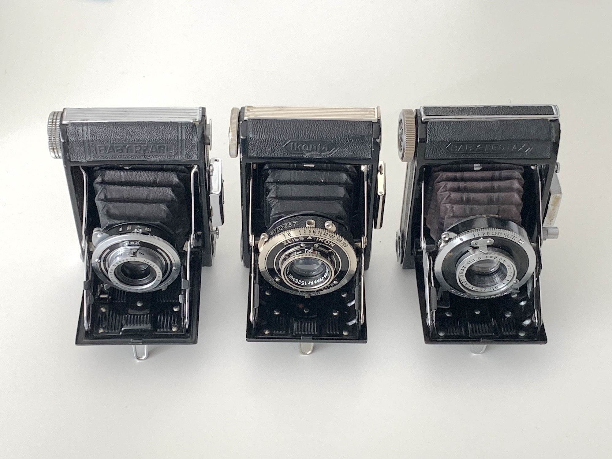 Links die Konishiroku (= Konica) Baby Pearl mit Hexar 4,5/50 in einem "Rox"-Verschluss 25–100. Diese Kamera wurde im Zeitraum 1934–50 angeboten, das gezeigte Exemplar stammt aus Nachkriegsfertigung (Made in Occupied Japan). Die Ähnlichkeiten mit der Ikonta (Mitte) sind offensichtlich, geändert wurden aber die Spreizen, außerdem hat die Kamera einen Gehäuseauslöser und einen Rotfensterverschluss.
