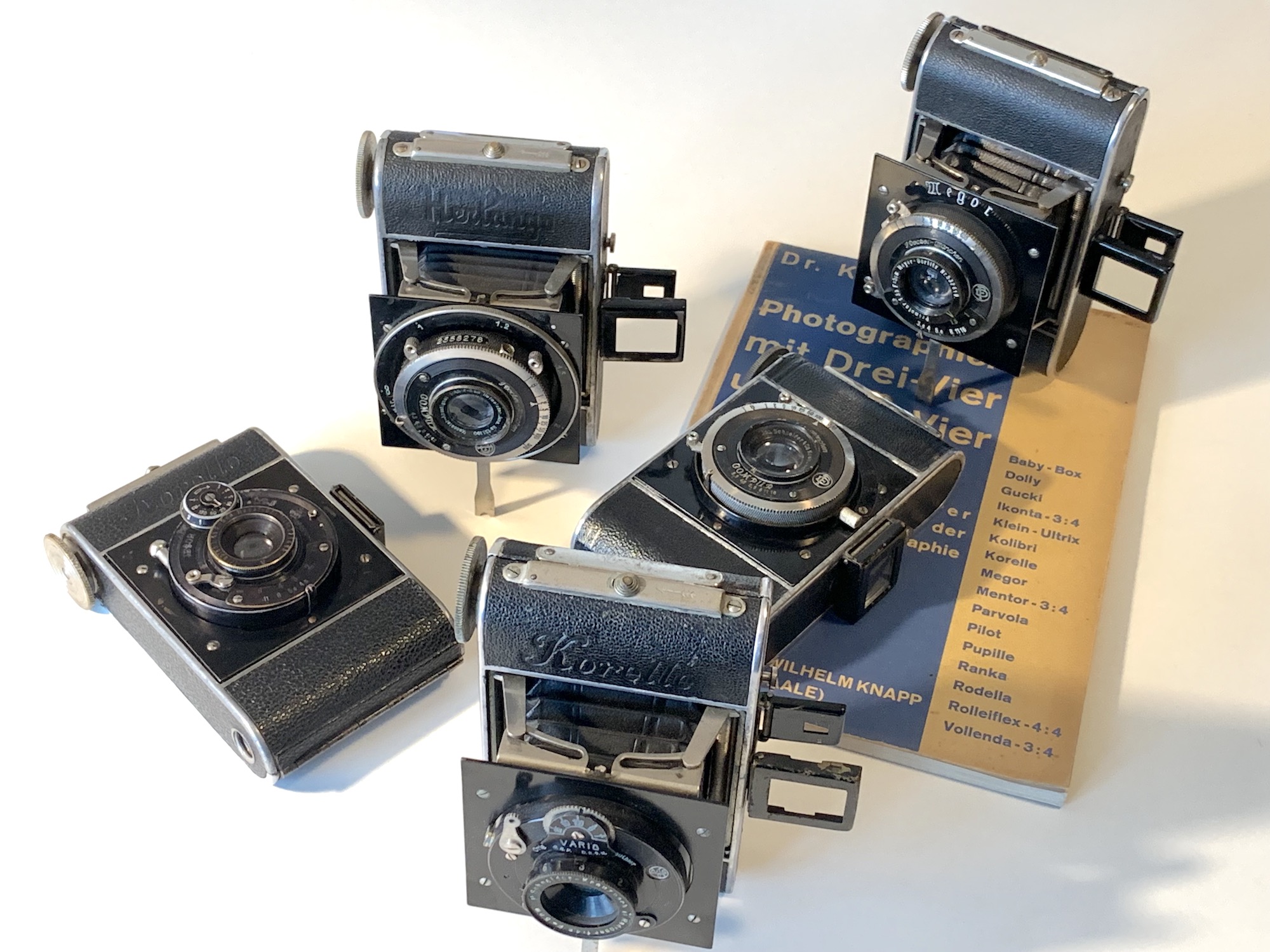 wenn man sich mit den 3x4-Kameras der frühen 30er Jahre beschäftigt, stößt man unweigerlich auf die Korelle 3x4 von Franz Kochmann, Dresden (später: Korelle-Werk). Es ist gewissermaßen der Prototyp der Spreizenkameras dieser Kategorie. Die Kamera erschien 1930 und wurde mit diversen Objektiv-Verschluss-Bestückungen gebaut, mit Frontlinsen oder Schneckengangfokussierung ausgestattet und unter diversen Handelsmarkennamen verkauft.