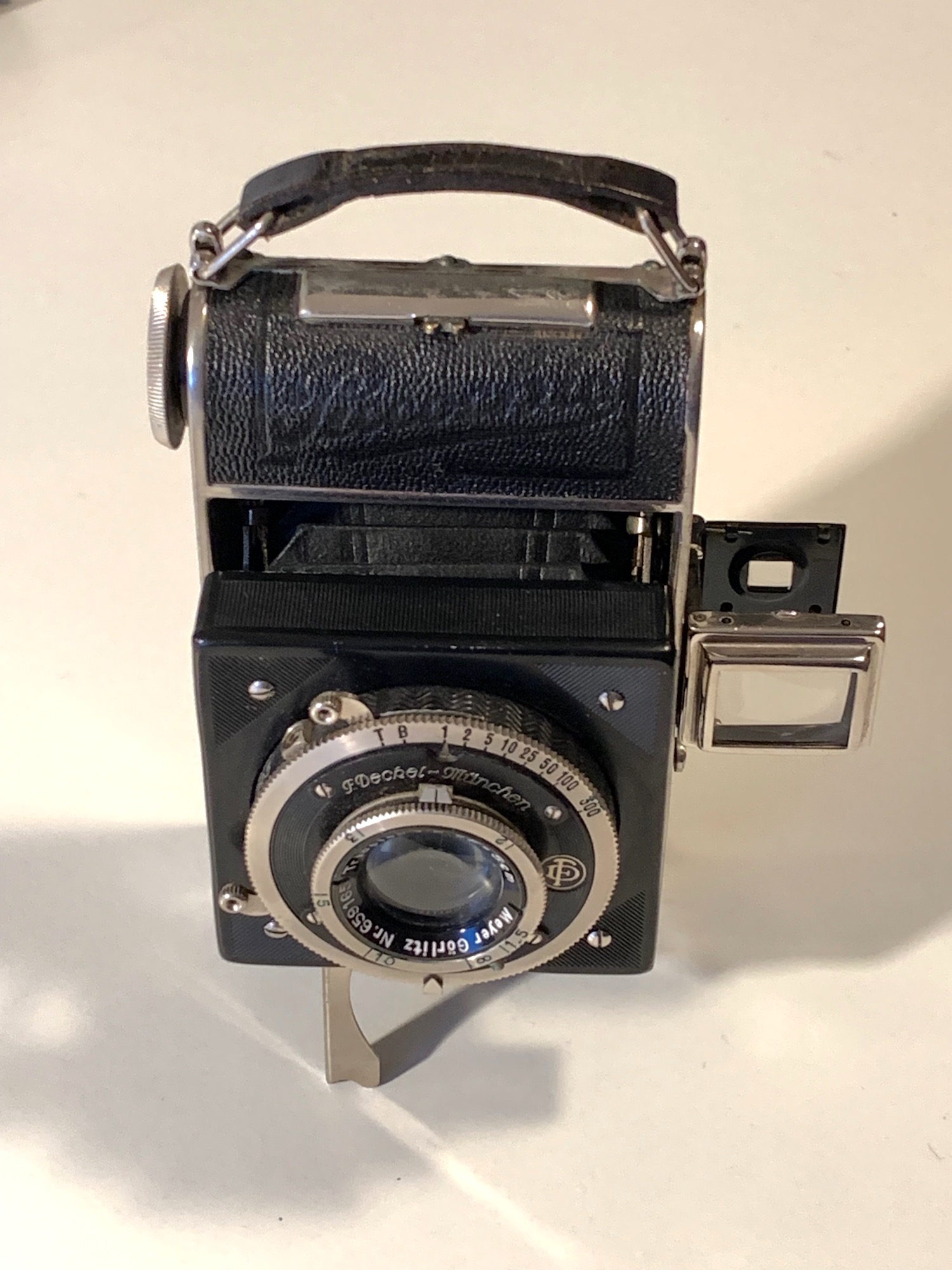 Es ist ebenfalls eine Spreizenkamera 3x4 für 127er Rollfilm, der Objektivträger springt auf Knopfdruck heraus, und wie die Korelle gibt es sie mit unterschiedlicher Bestückung. Das abgebildete Exemplar ist mit Meyer Trioplan 2,9/5 (Frontlinseneinstellung) in Compur ausgestattet. Wenn die Kamera ausgeklappt ist, erkennt man die Unterschiede zur Korelle – der Abschlusskasten ist deutlich dicker, die Kamera hat einen Newtonsucher, außerdem gibt es einen Tragegriff. Typisch für Balda auch die längliche Form der beiden Rotfenster – eins ist oval, eins sechseckig. Die Piccochic kam 1932 auf den Markt.