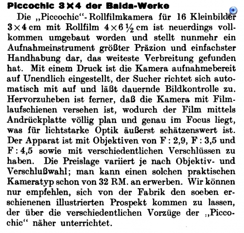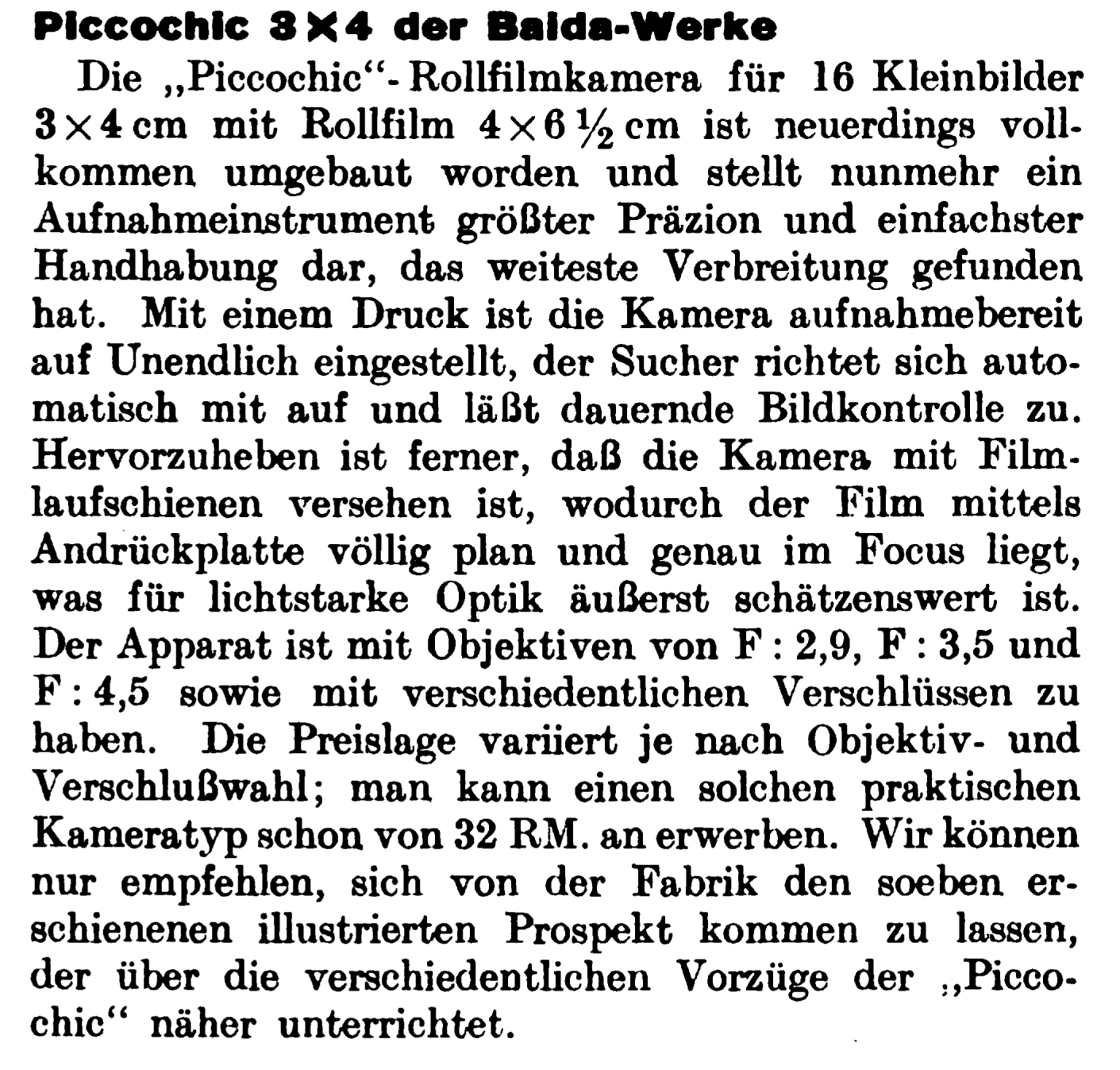 Das ‚Photofreund Jahrbuch‘ von 1933 berichtet noch folgendes über die Piccochic: „Als eine sehr kleine und doch gewissenhaft und praktisch durchkonstruierte 3 x 4-Rollfilmkamera präsentiert sich die „Piccochic“ der Balda-Werke Max Baldeweg, Dresden-A. 34. Sie ist eine Spreizenspringkamera mit automatisch aufspringendem Sucher. Damit man die Kamera ständig in Bereitschaft tragen kann, hat sie ein paar Oesen erhalten, an die mittels Karabinerhaken eine Kordelschnur befestigt wird, an der man sich den Apparat um den Hals hängt. Die „Piccochic“ liefert auf A8-Film 16 Bilder. Die äußere Ausstattung mit den vernickelten Rändern wirkt recht geschmackvoll. Das sehr klein gehaltene Gehäuse erlaubt ein leichtes Mitführen der Kamera in der Rochtasche oder der Handtasche der Dame. Die optische Ausstattung kann in den Lichtstärken von 4,5 bis 2,9 vorgenommen werden.“