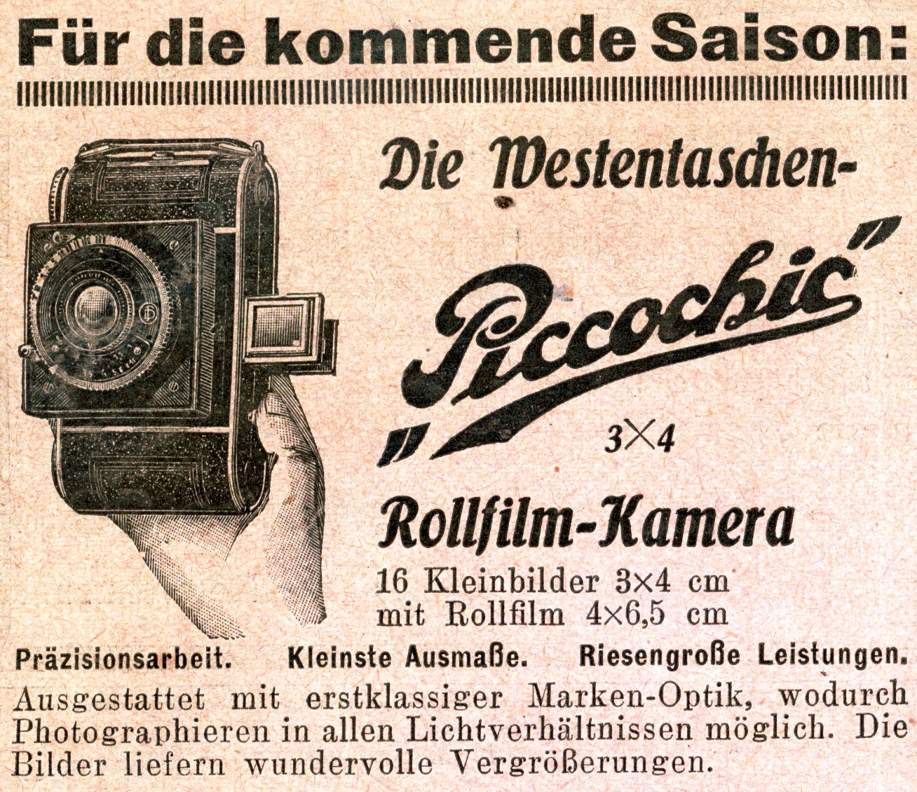 Mir sind ansonsten keine wesentlichen Änderungen bei den online verfügbaren Piccochic-Exemplaren aufgefallen. Die Piccochic erschien wahrscheinlich in der zweiten Hälfte des Jahres 1931 (genaue Angaben habe ich auch in der 'Photographischen Industrie' nicht gefunden). Wenn nun die Photographische Rundschau bereits im Dezember 1931 davon spricht, dass die Kamera „vollkommen umgebaut“ wurde, muss man davon ausgehen, dass von der ursprünglichen Kamera nicht übermäßig viele Exemplare produziert wurden?! Vielleicht findet sich ja irgendwann noch ein Exemplar, dass sich durch seine abweisende Konstruktion als ältere Piccochic identifizieren lässt.