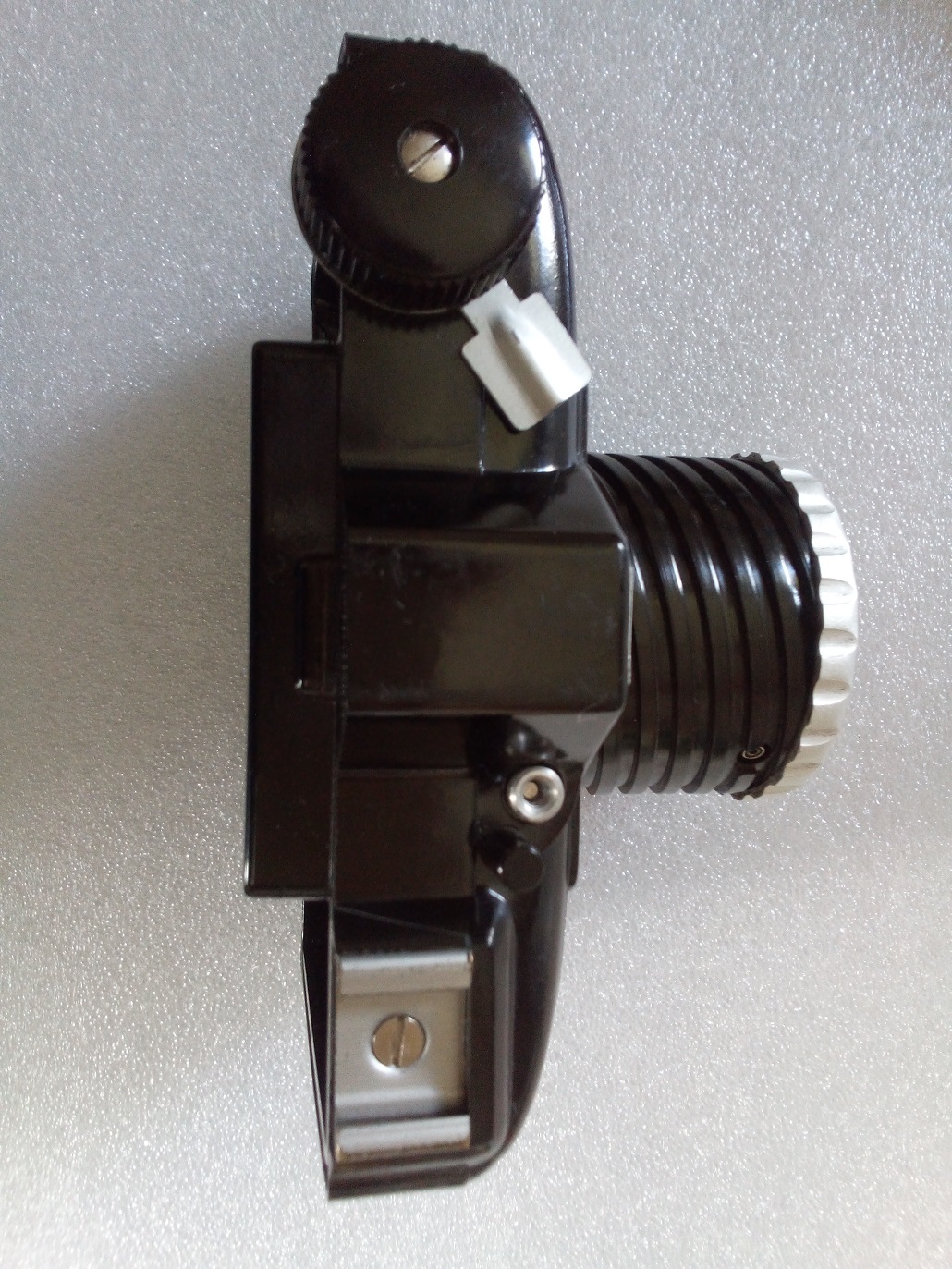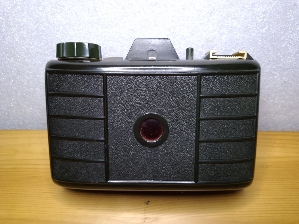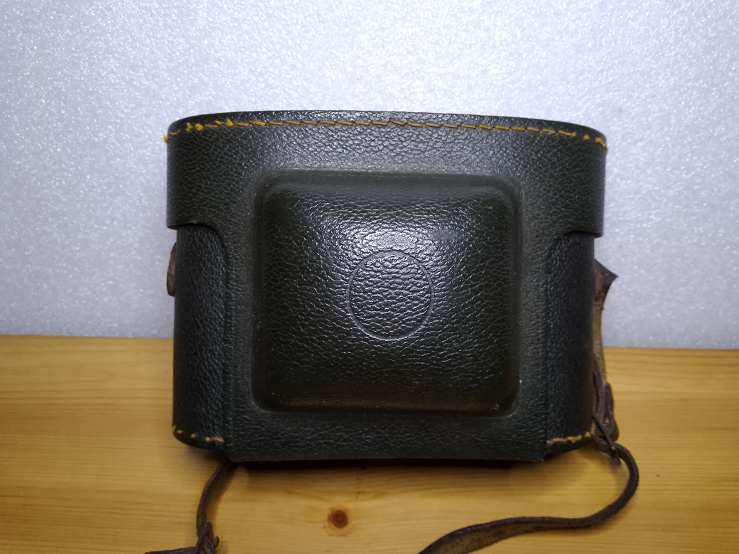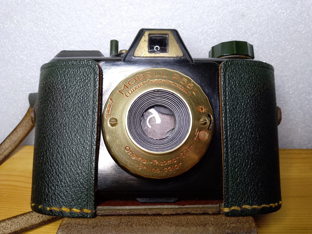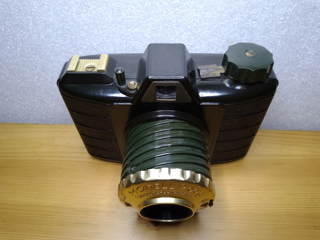 - das Gehäuse ist aus dunkelgrünem Bakelit gefertigt, Tubus, Filmtransportrad und Auslöser aus hellerem Material