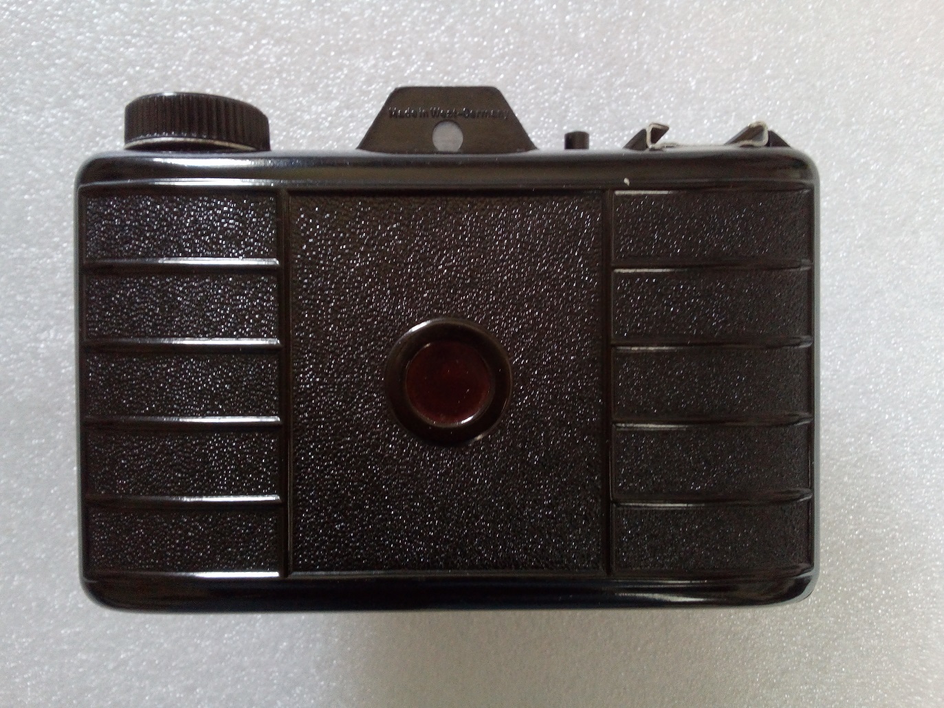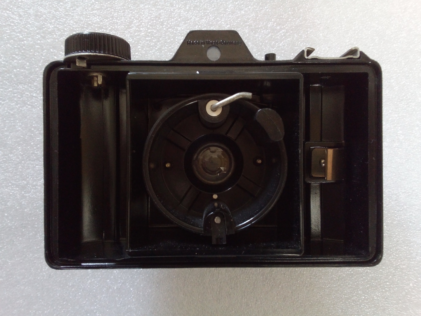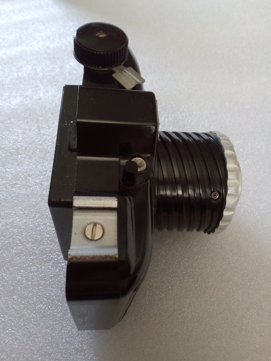 - das Gehäuse ist aus dunkelgrünem Bakelit gefertigt, Tubus, Filmtransportrad und Auslöser aus hellerem Material