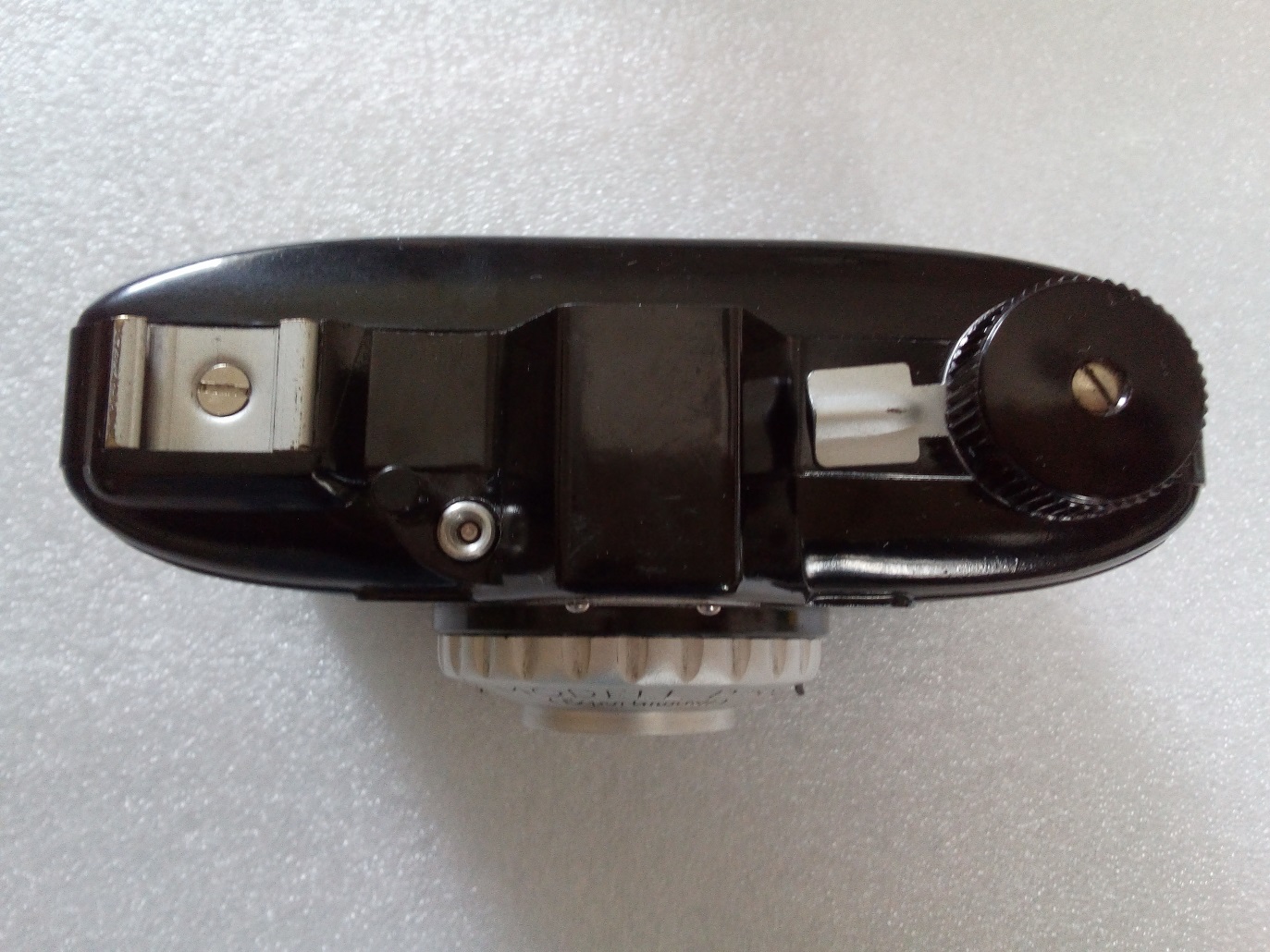 Sonstiges: Auslösesperre bei nicht herausgefahrenem Objektiv, Drahtauslöseranschluss, Stativgewinde an der Unterseite.Zum Filmwechsel musste die gesamte Rückwand abgenommen werden, der Auslösehebel befindet sich am Filmtransportknopf .