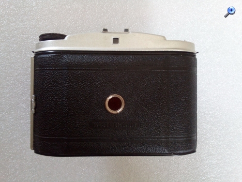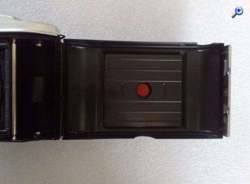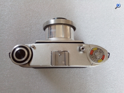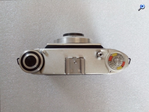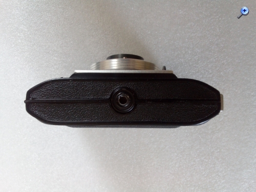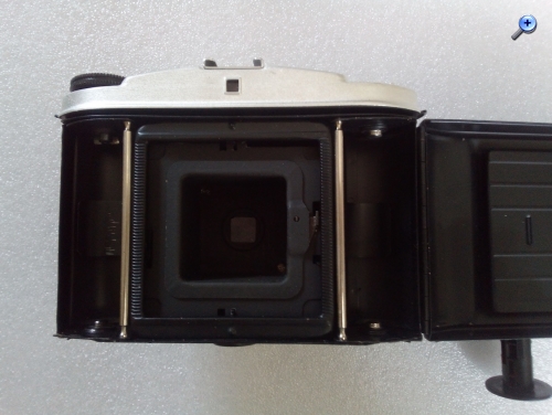 Filmtransportdrehrad, Entriegelung für den Tubus, Blitzschuh ohne Mittenkontakt (PC Buchse unten am Verschluß), Auslöser (bei eingefahrenem Tubus geperrt), mehrfarbige Filmmerkscheibe (es gab auch Varianten mit einer verchromten Merkscheibe), Filmfenster ohne weitere Abdeckung, Rückwand mit Filmandruckplatte, Stativgewinde
