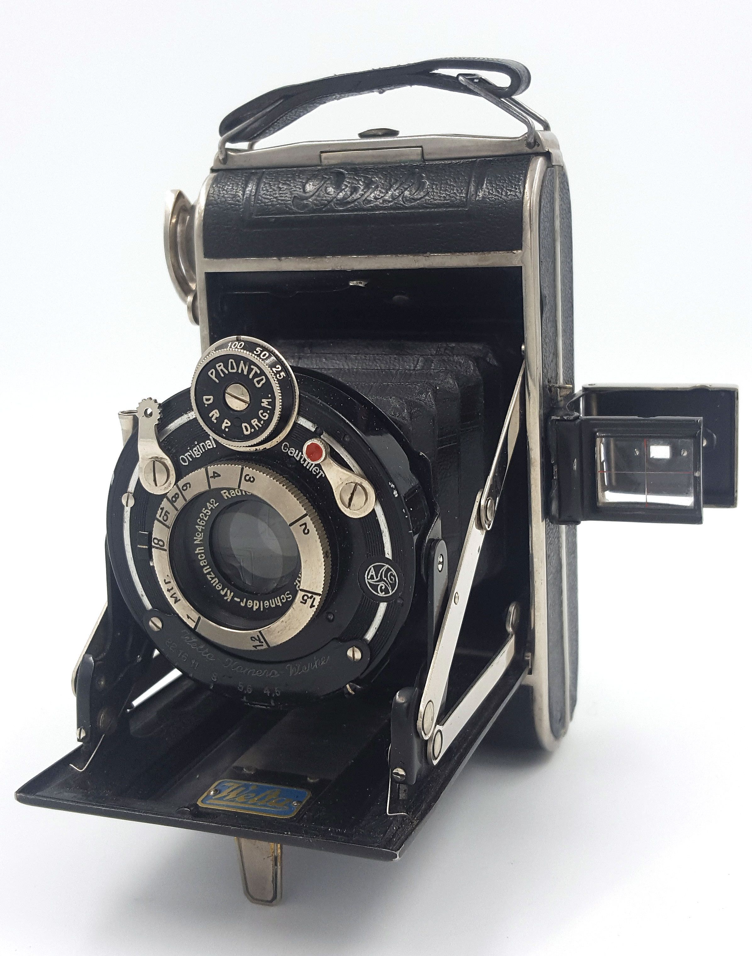 Für Perle: Prägung 'Perle' an Gehäusefront, Prägung am angelenkten Rückteil: 'Welta', Gehäusekanten vernickelt, Welta-Blechschild innen am Verschlussdeckel befestigt