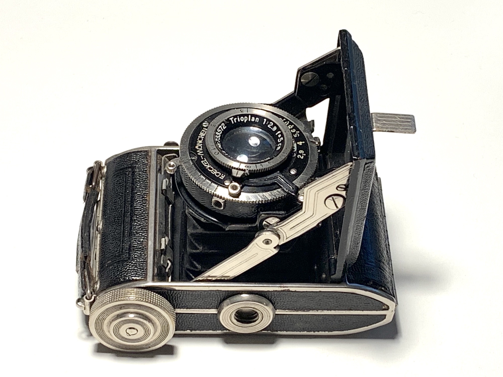Es gab die Kamera auch mit anderen Objektiven; Spitzenmodell war die Ausführung mit Tessar in Compur-Rapid mit Schneckengangverstellung. In der hier gezeigten Ausführung wurde sie 1932 für 62 RM angeboten. Ich bin froh, zumindest diese einfache Ausführung zu besitzen, denn im Gegensatz zur Rigona wird die Baldi nur selten angeboten.