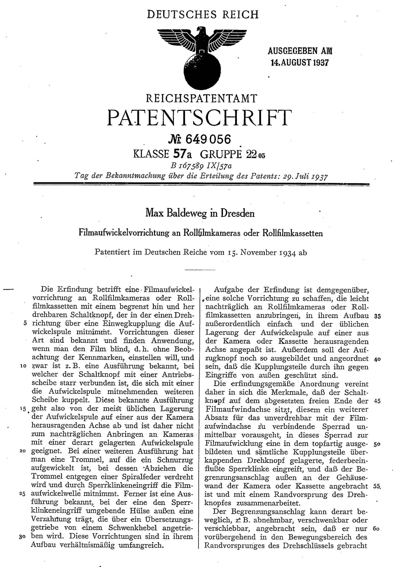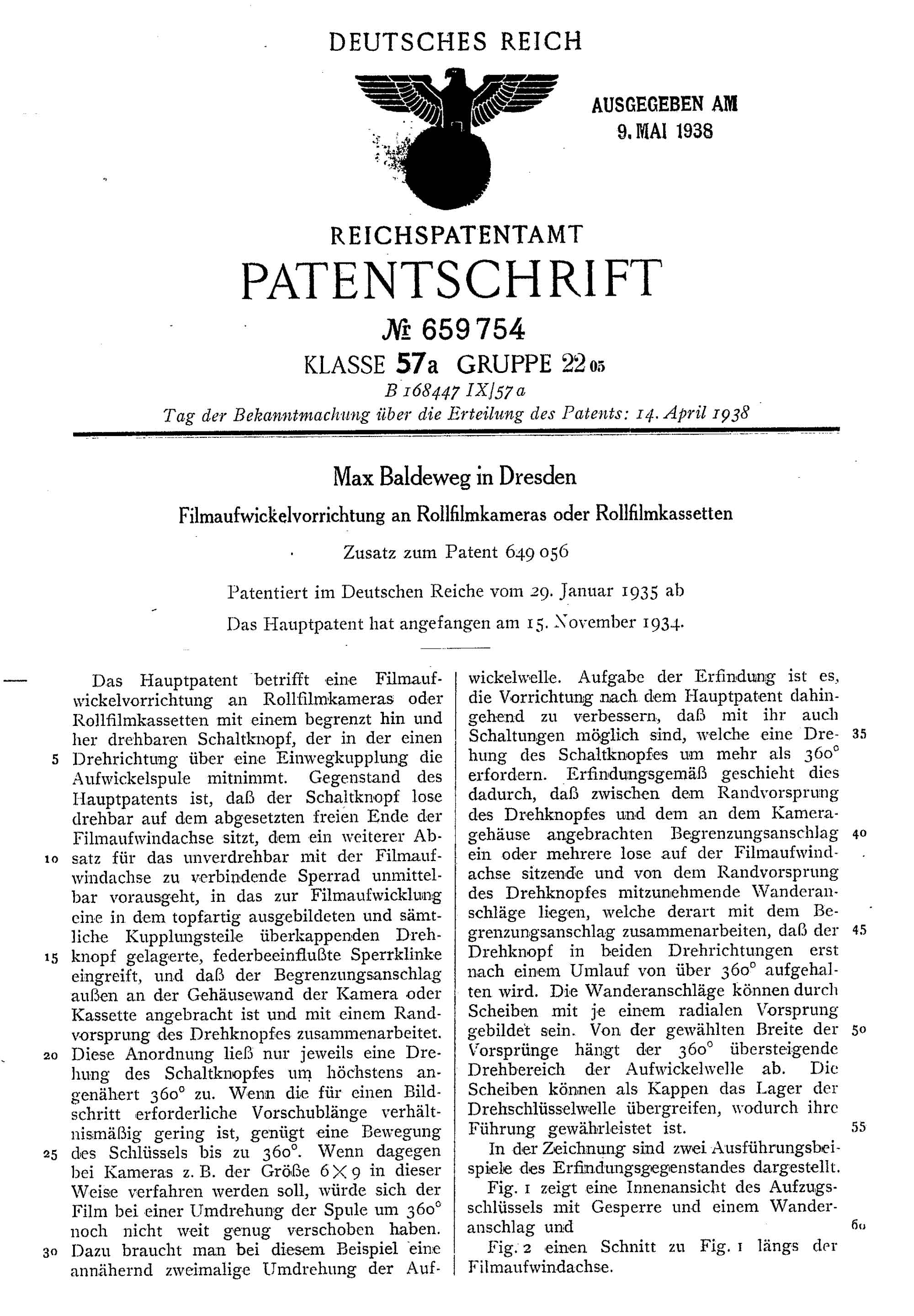 wirklich eine bemerkenswerte Kamera! Ich habe im Netz noch zwei passende Patente gefunden (im Anhang). Dabei fällt auf, dass das erste Patent von 1934 stammt, obwohl die Kamera (wie Du oben schreibst) schon 1932 im Prospekt erscheint.