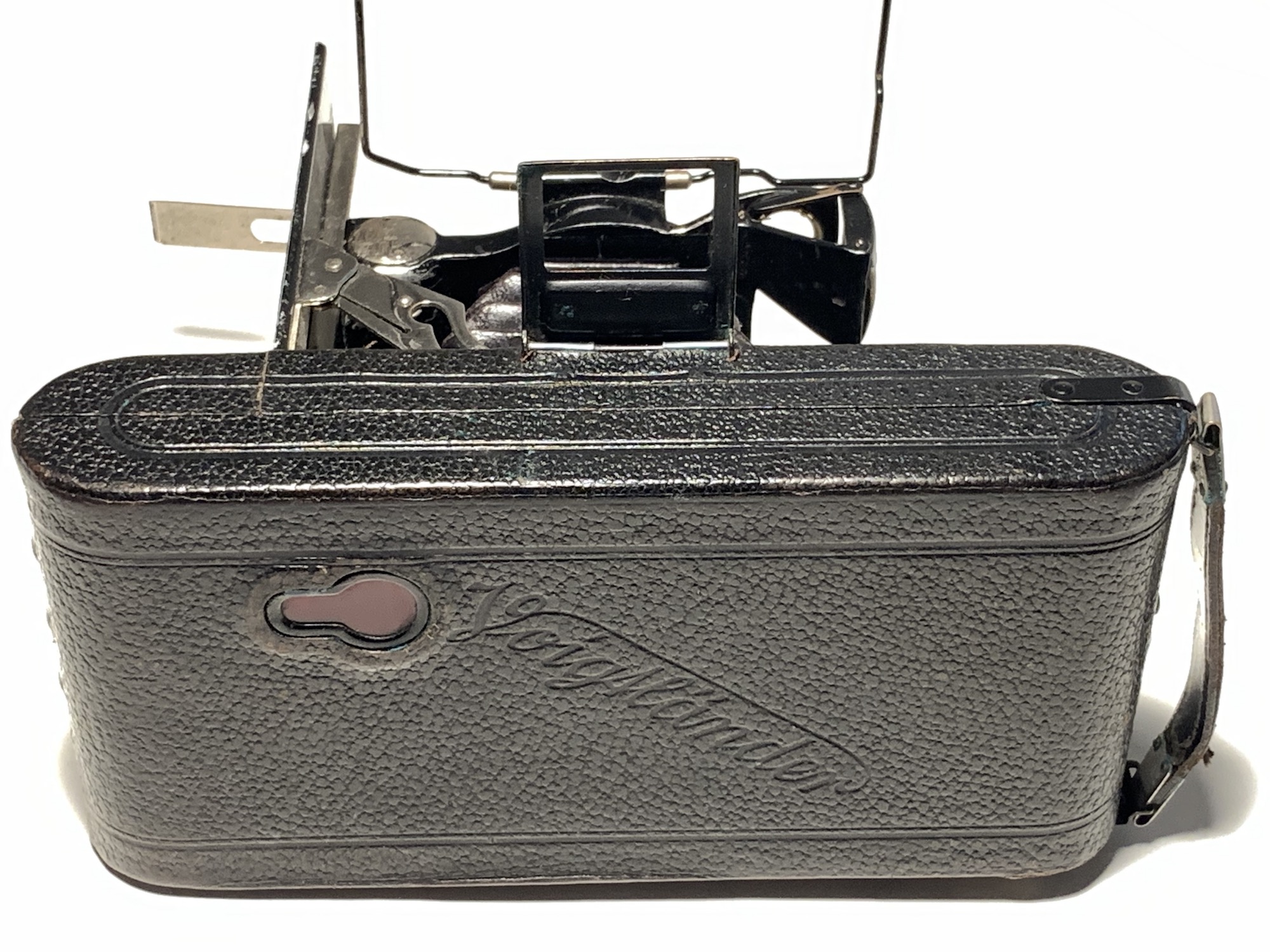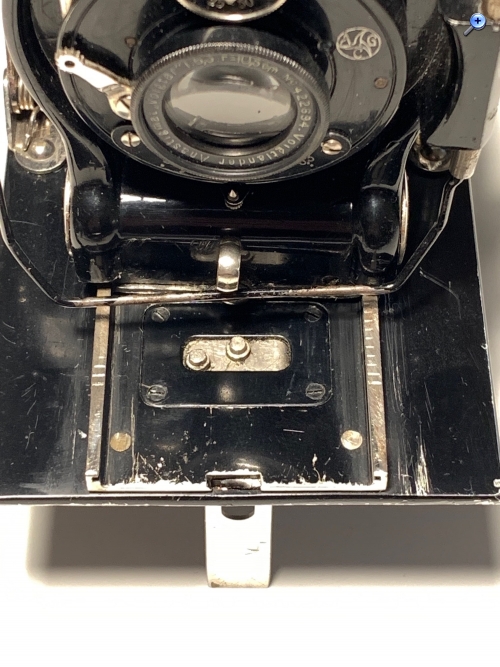 Was hat es mit dieser Kamera auf sich? Es ist Voigtländers erster Versuch einer Kamera mit automatisch in Unendlich-Position fahrendem Objektiv. Ähnliches gab es als Springkonstruktion von Ica oder Ernemann, das Vorbild einer Laufbodenkamera könnten die Autofoc-Modelle von Goerz gewesen sein. Der Schlitten soll durch Federkraft automatisch ausfahren; im Innern des Zylinders unten an der Standarte befindet sich die betr. Feder. Prochnow (Bd. 3, 32-802) spricht von einem Drehgelenk und einer klappbaren Standarte; das kann ich aber ausschließen.