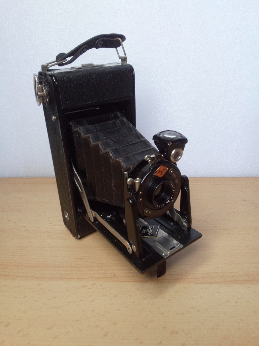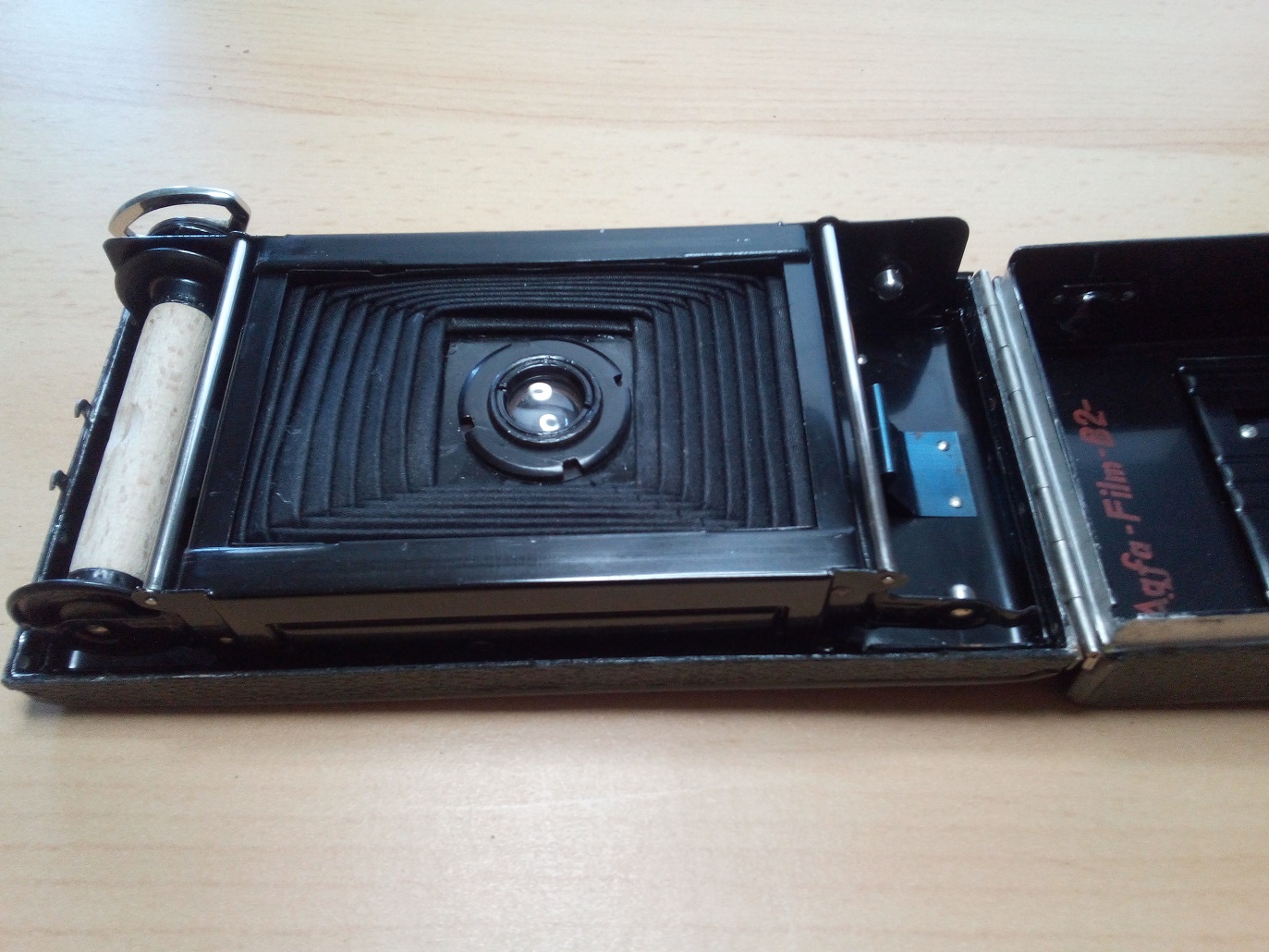 Hersteller: Agfa Kamerawerk, MünchenI Modell: Billy I Igestar 8,8 Typ: Rollfilmsucherkamera, Rollfilm 120, 8 Aufnahmen 6 x 9 Baujahr: 1931 Seriennummer: 2A 0389 Verschluß: ?, "B" 1/25 - 1/100 sec, Drahtauslöseranschluß Blenden: 8,8 - 12,5 - 18 Objektiv: Agfa Anastigmat-Igestar 1:8,8 / 10 cm Fokussierung: Nah (2 - 5 m) Fern ( 5 m - unendlich) Neupreis (1931): ca 30 RM